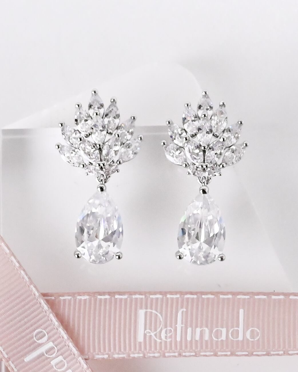 リーフのように重なり合うストーンが上品にきらめき、下にはティアドロップ型のビジューをあしらった女性らしいデザイン。