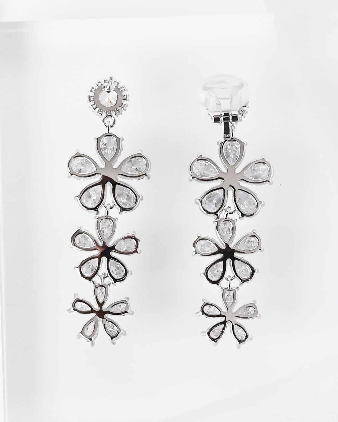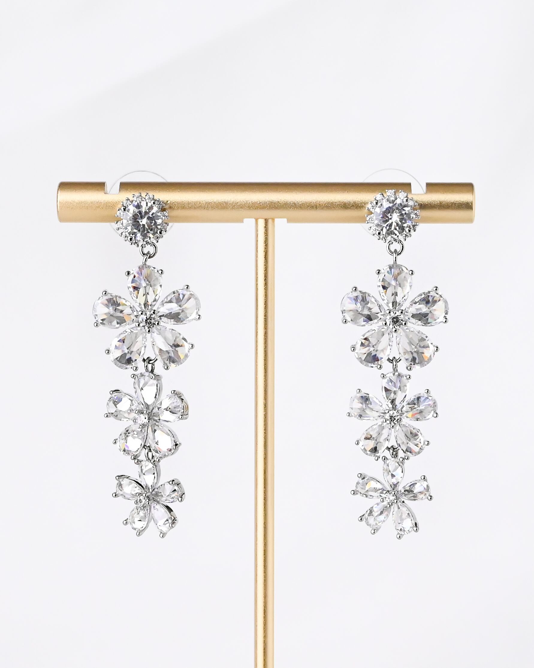 花びらのように広がるビジューを連ねたデザインで、縦のラインを強調しながら、顔まわりをすっきりと美しく見せてくれます。