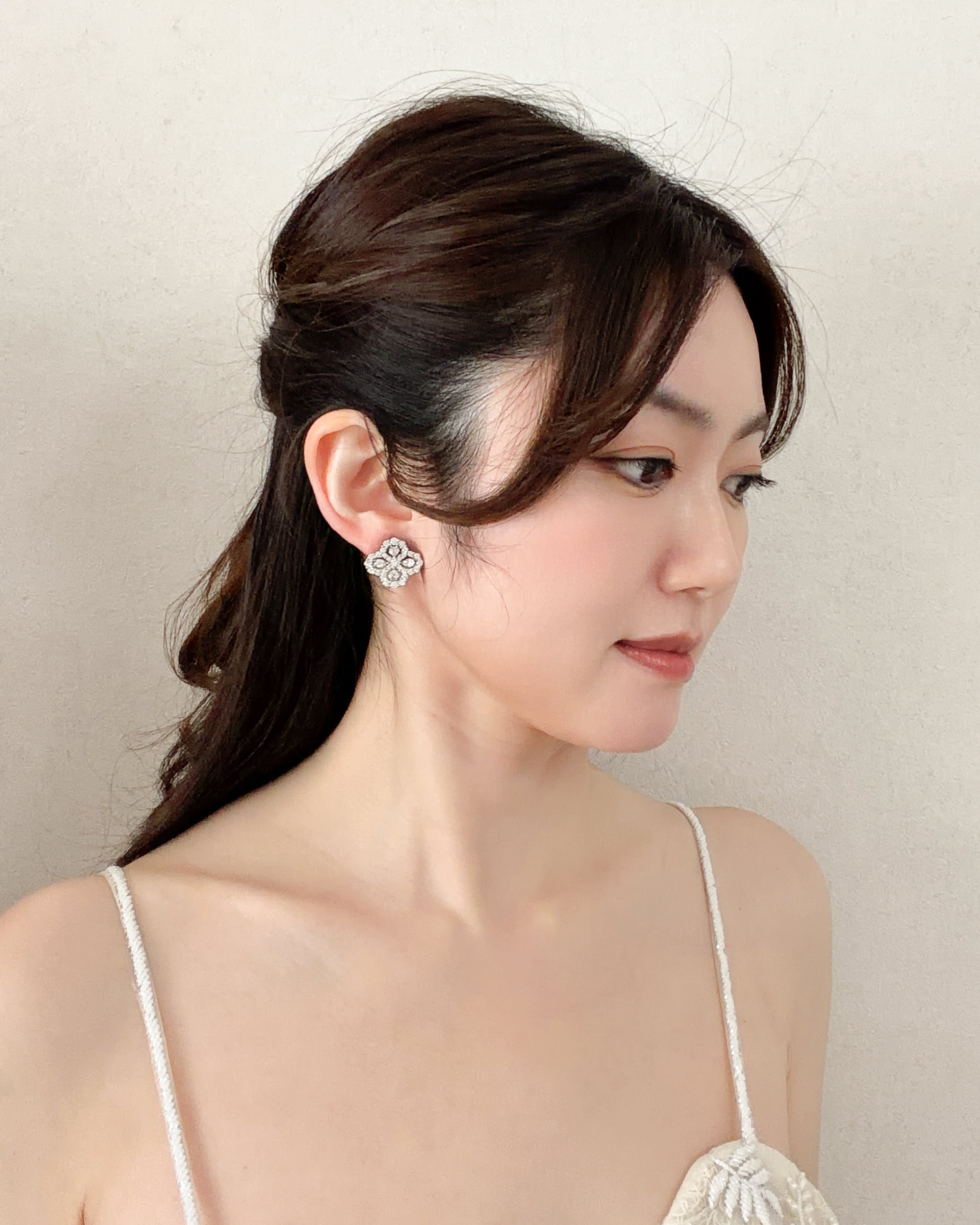 花びらのように広がるビジューが上品にきらめき、顔まわりを華やかに彩ります。