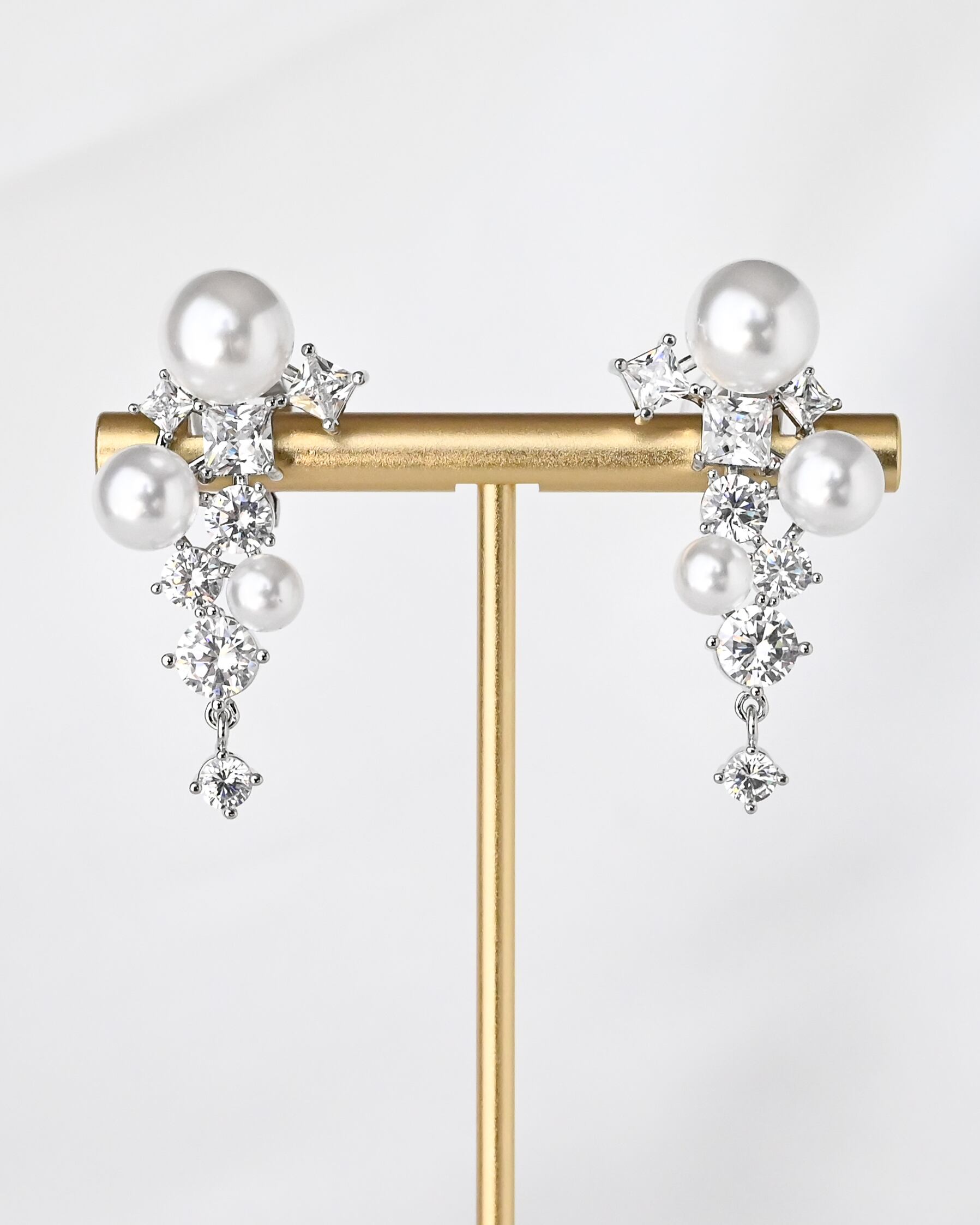 上品なパールと輝くビジューを組み合わせた、華やかなイヤーアクセサリー。