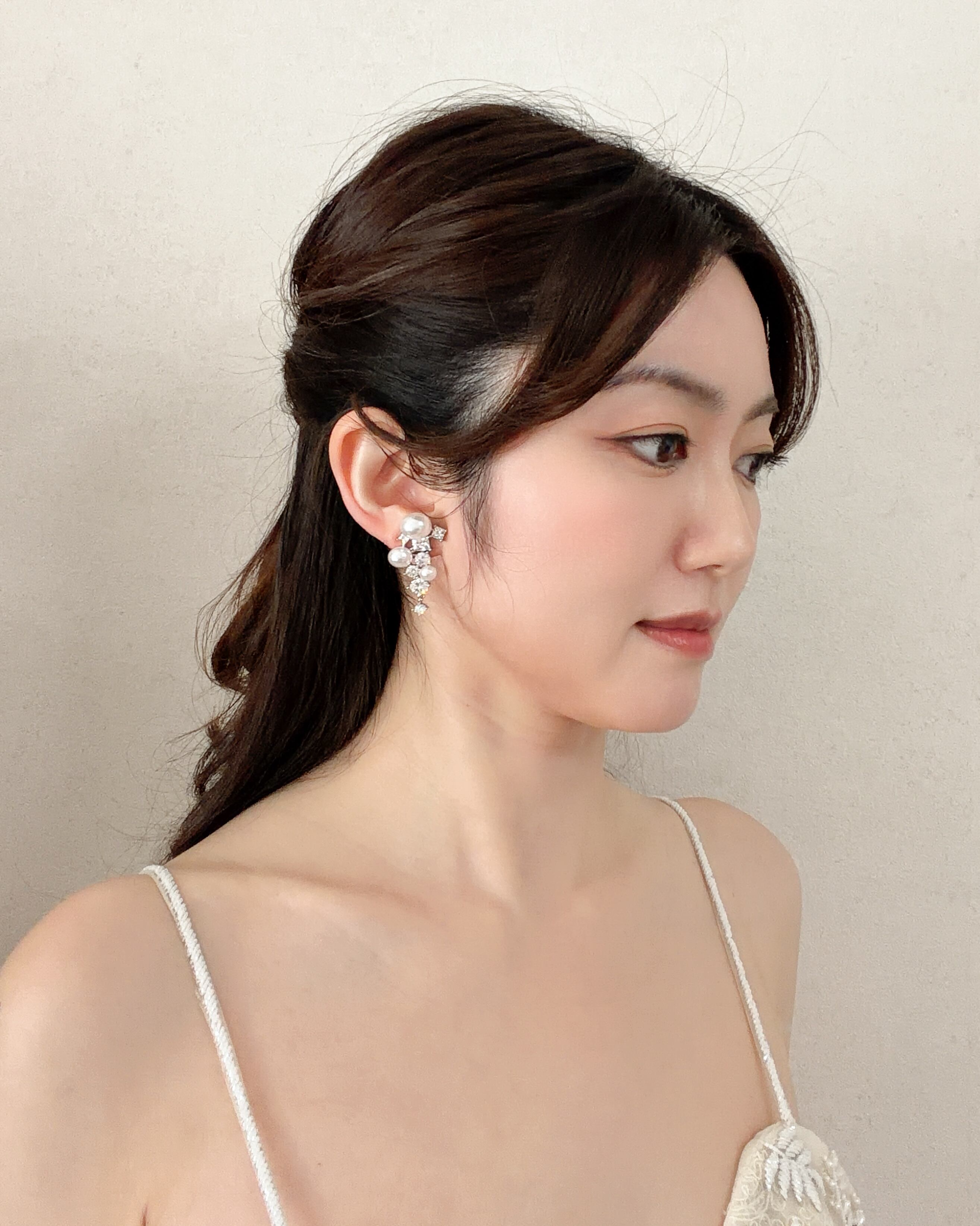 大小のストーンとパールをバランスよく配置し、顔まわりに自然な華やかさをプラスします。