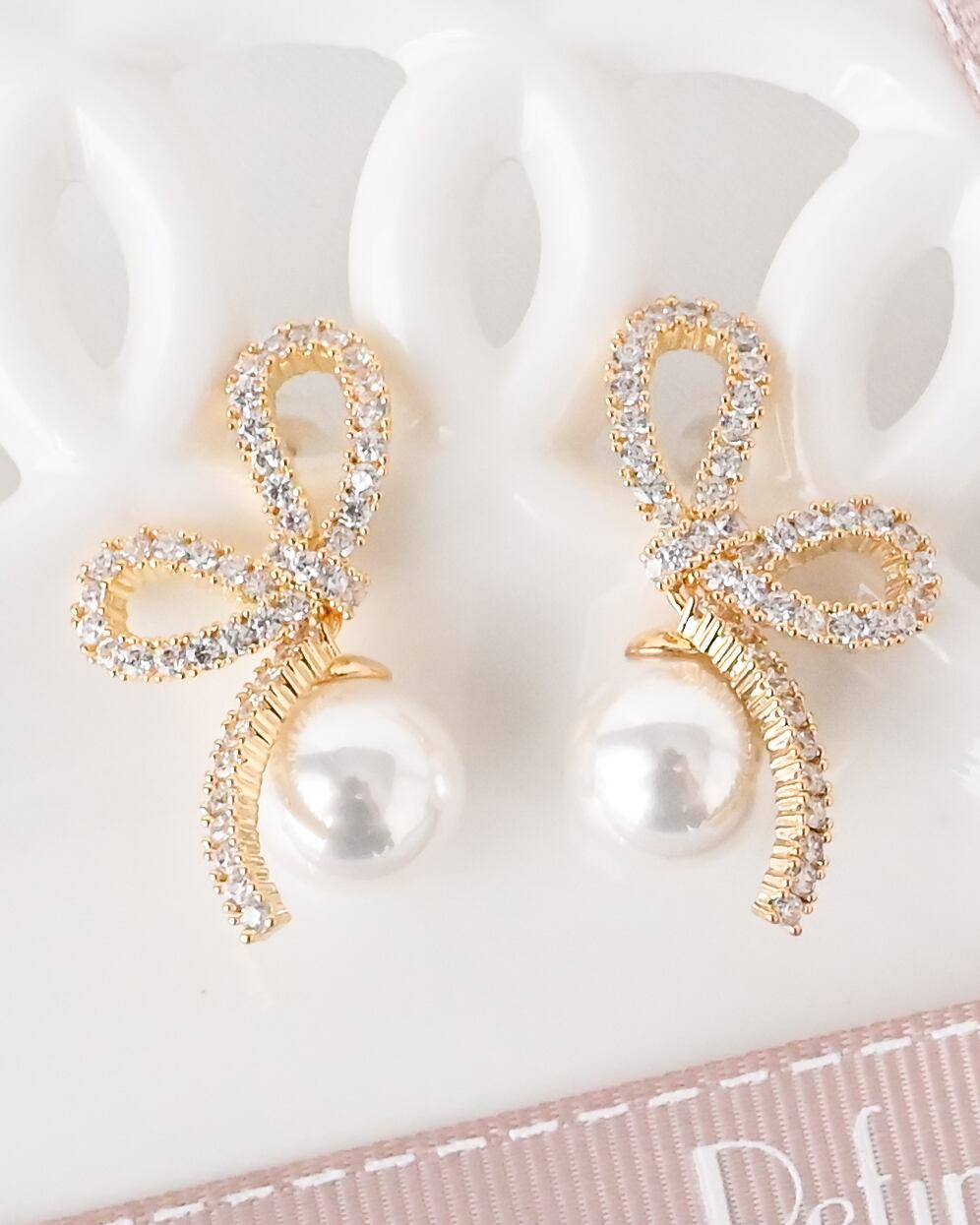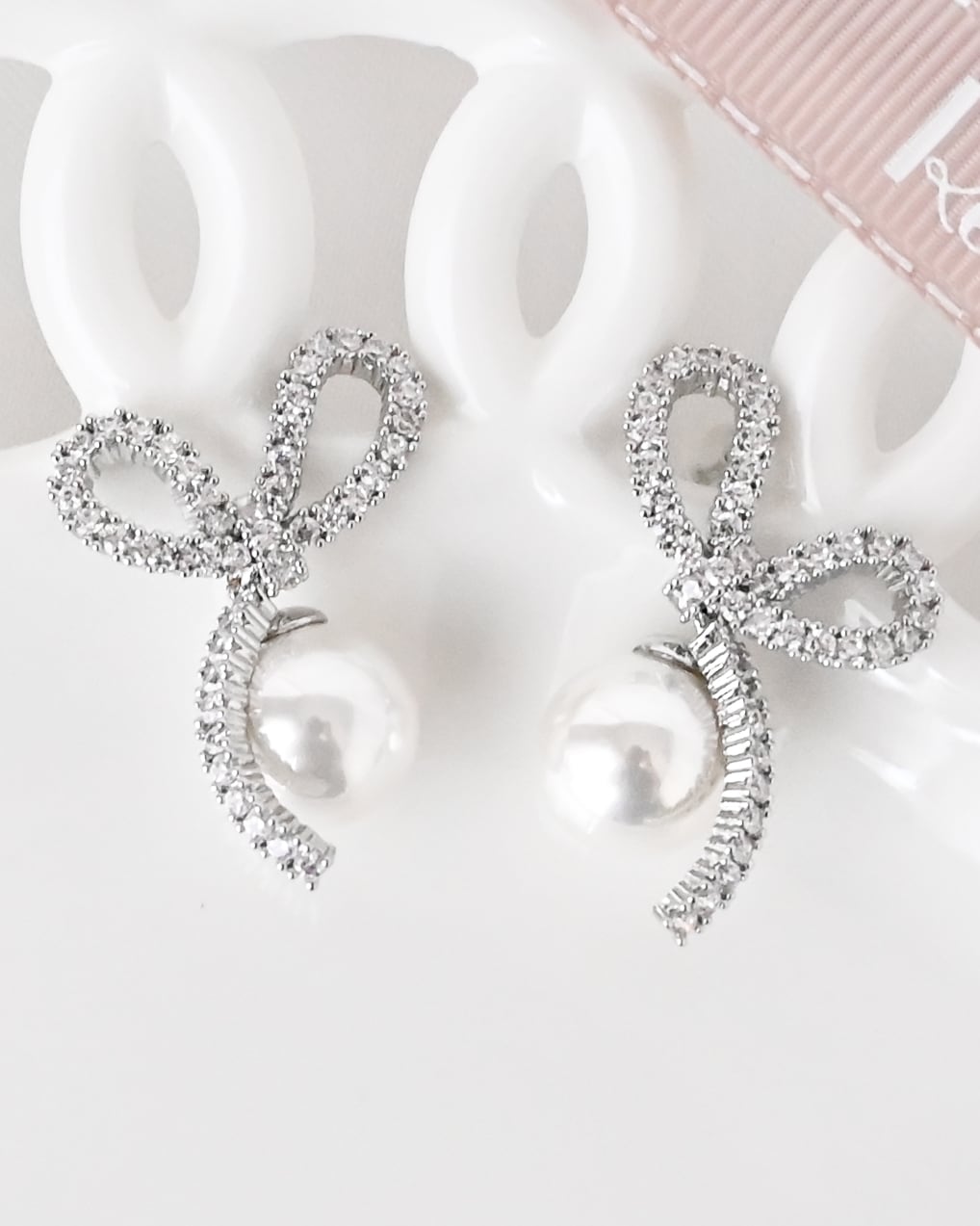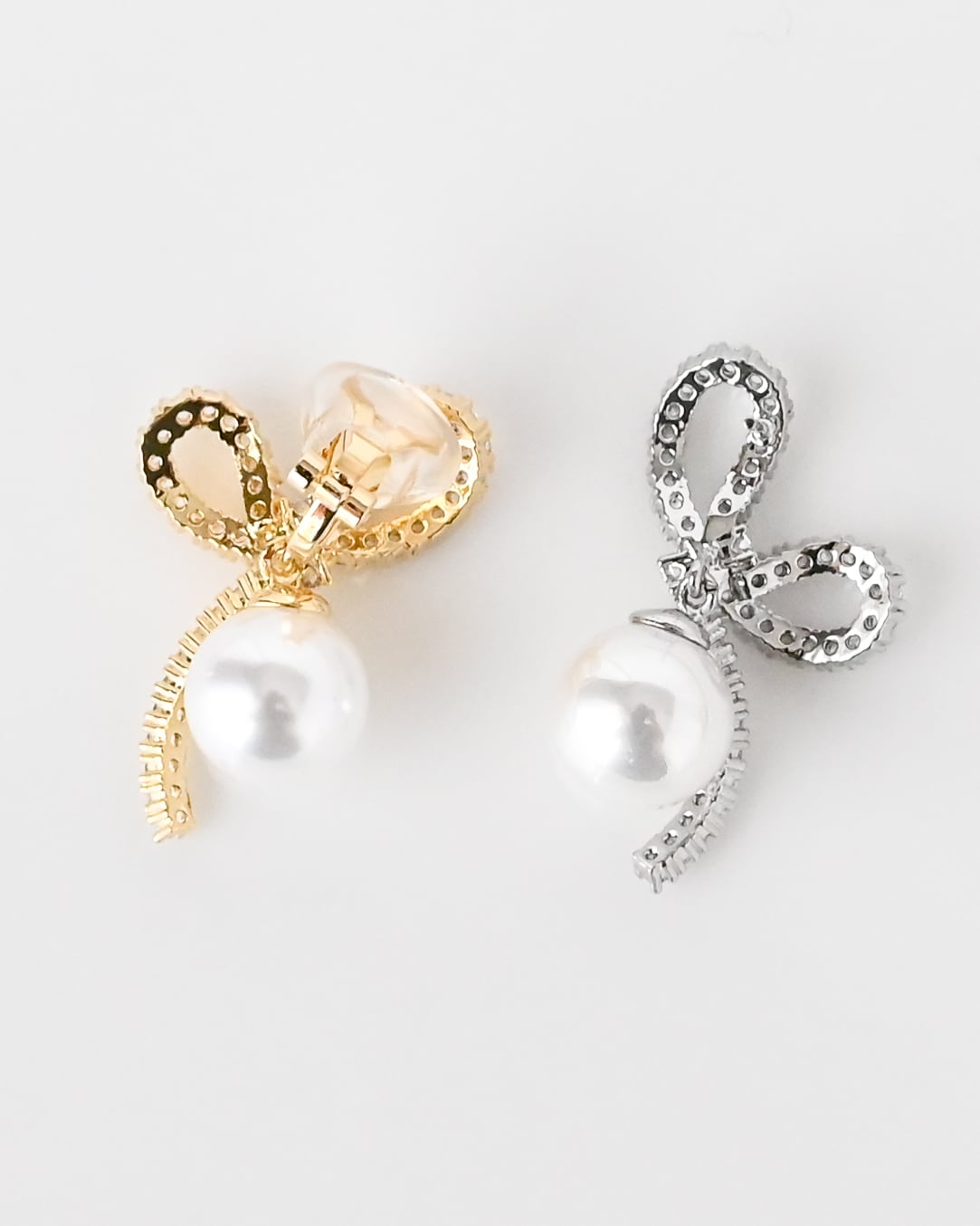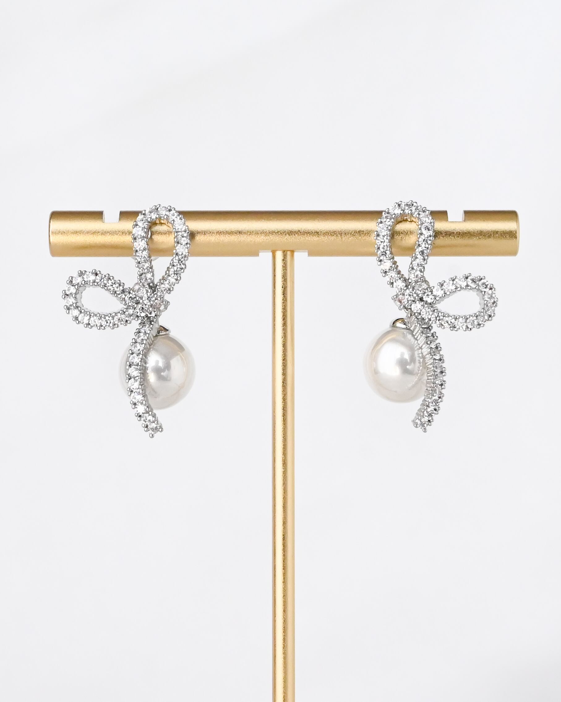 繊細なビジューで描いたリボンモチーフに、パールを添えた華やかなイヤーアクセサリー。