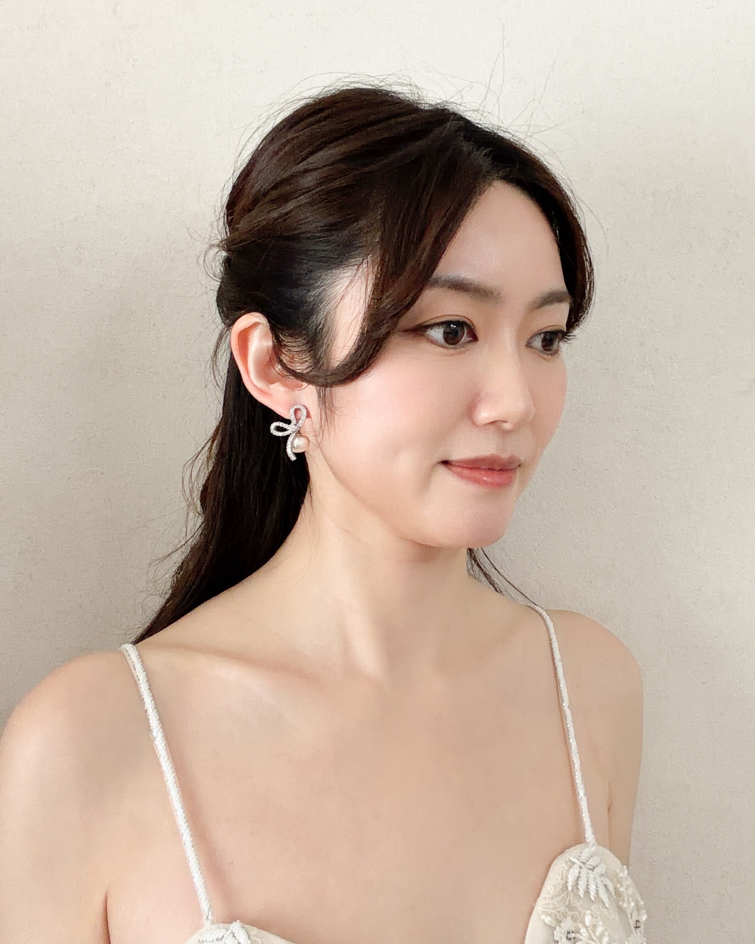 揺れるパールが動くたびにやさしく輝き、顔まわりに柔らかな華やかさをプラスします。