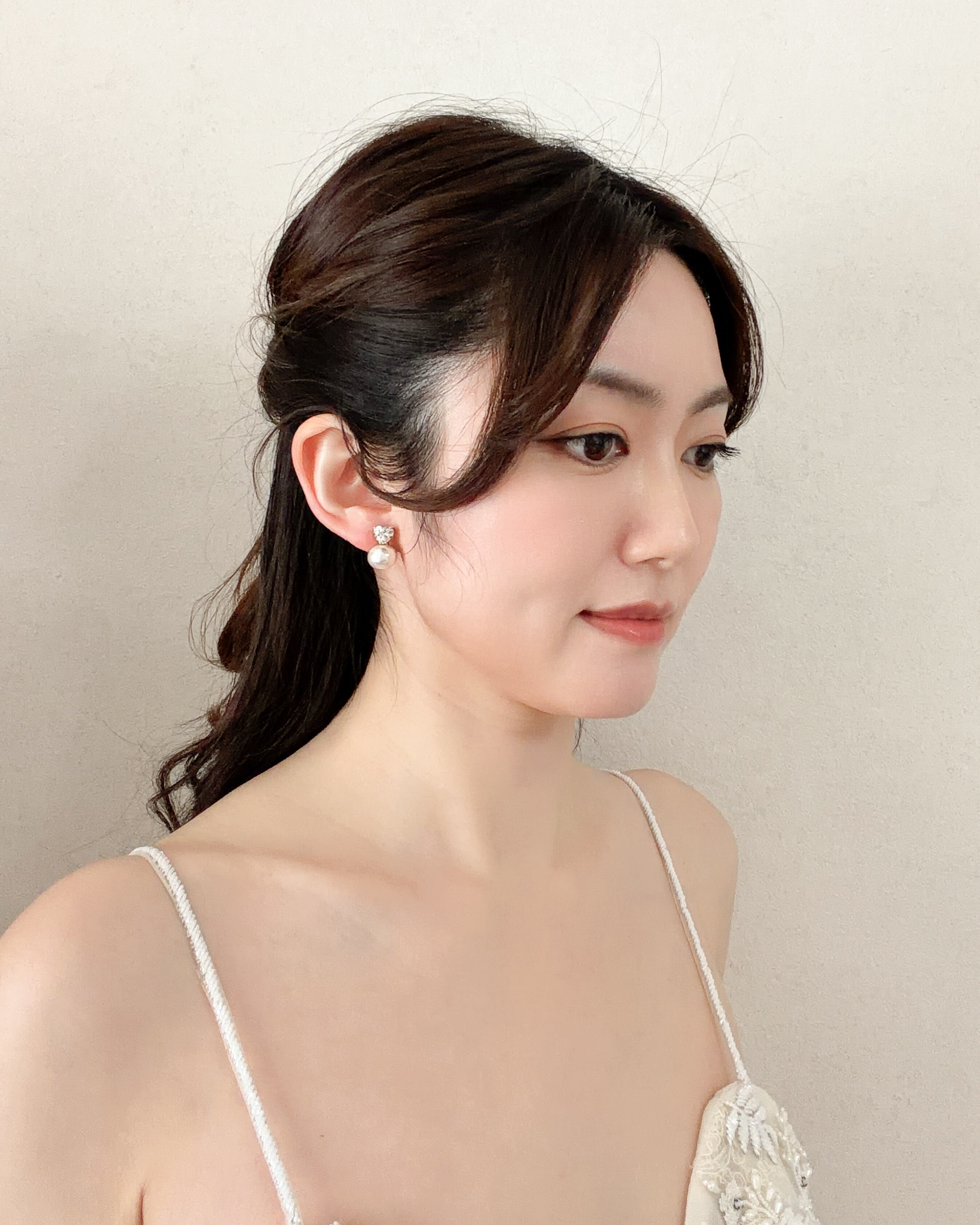 きらめくハートモチーフが顔まわりに華やかさをプラスし、パールが女性らしい柔らかな印象を演出します。