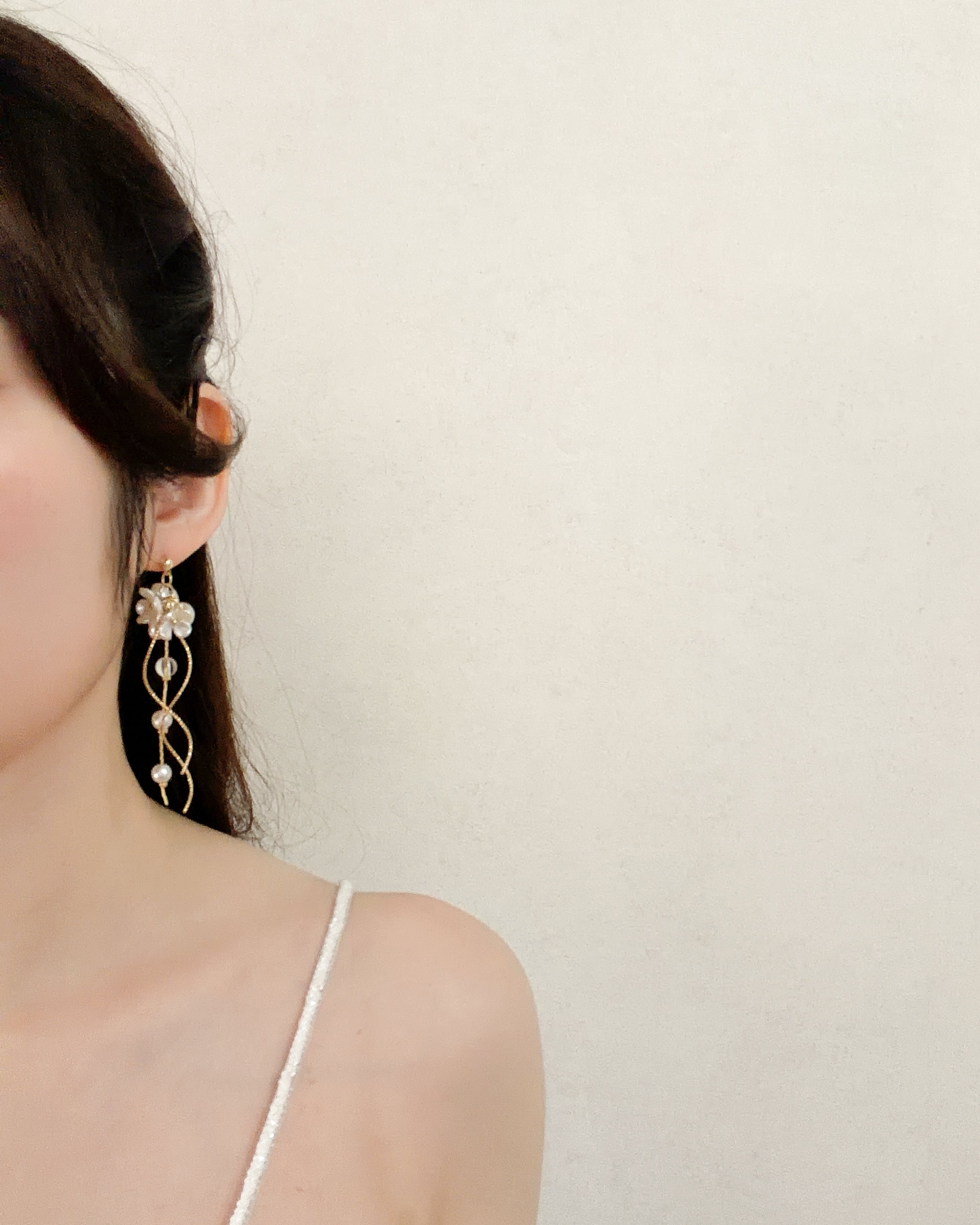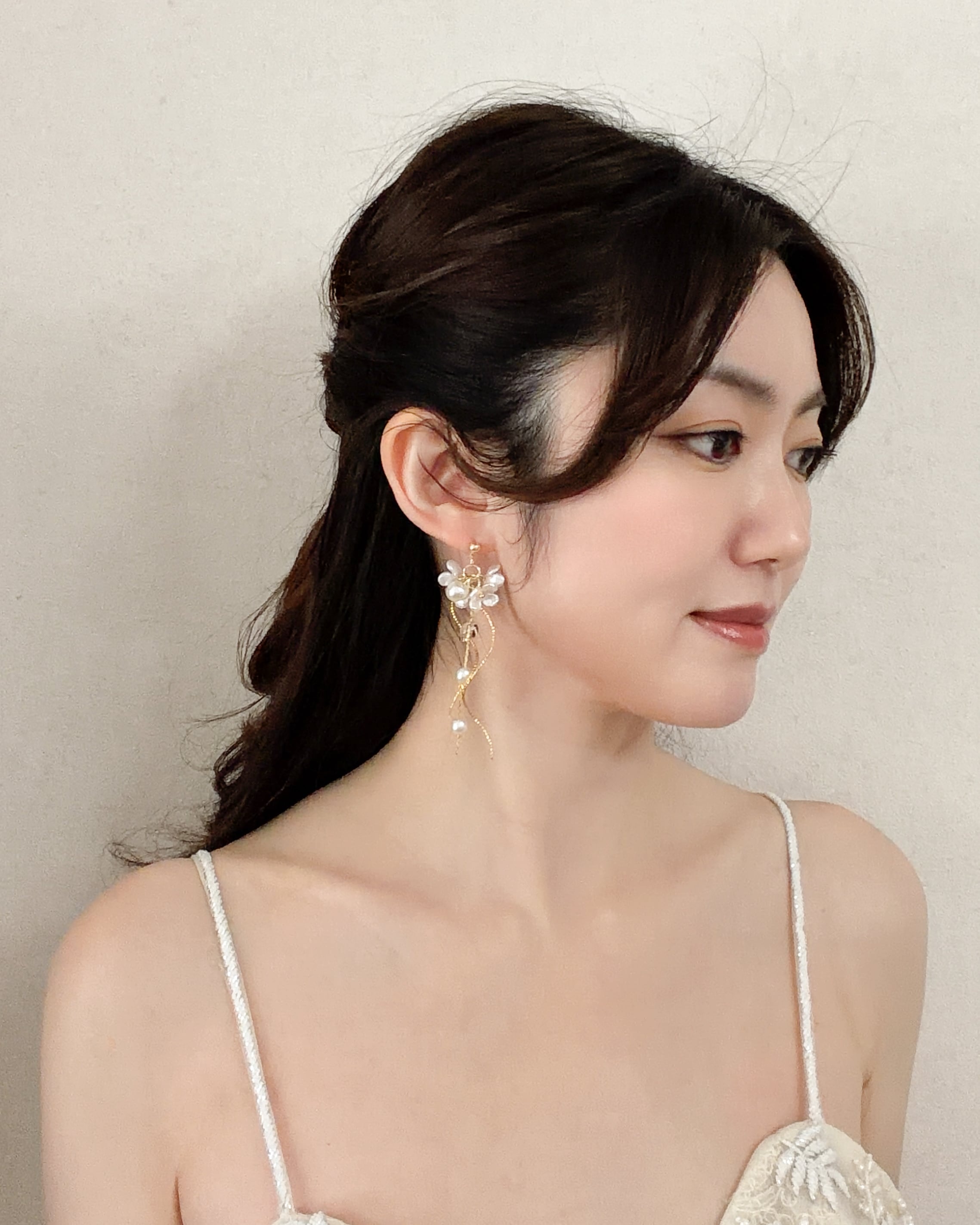 トップにあしらった小花が可憐な印象を与え、そこから伸びる曲線ラインとパールが動くたびに優しく揺れ、女性らしい柔らかさと上品さを演出します。