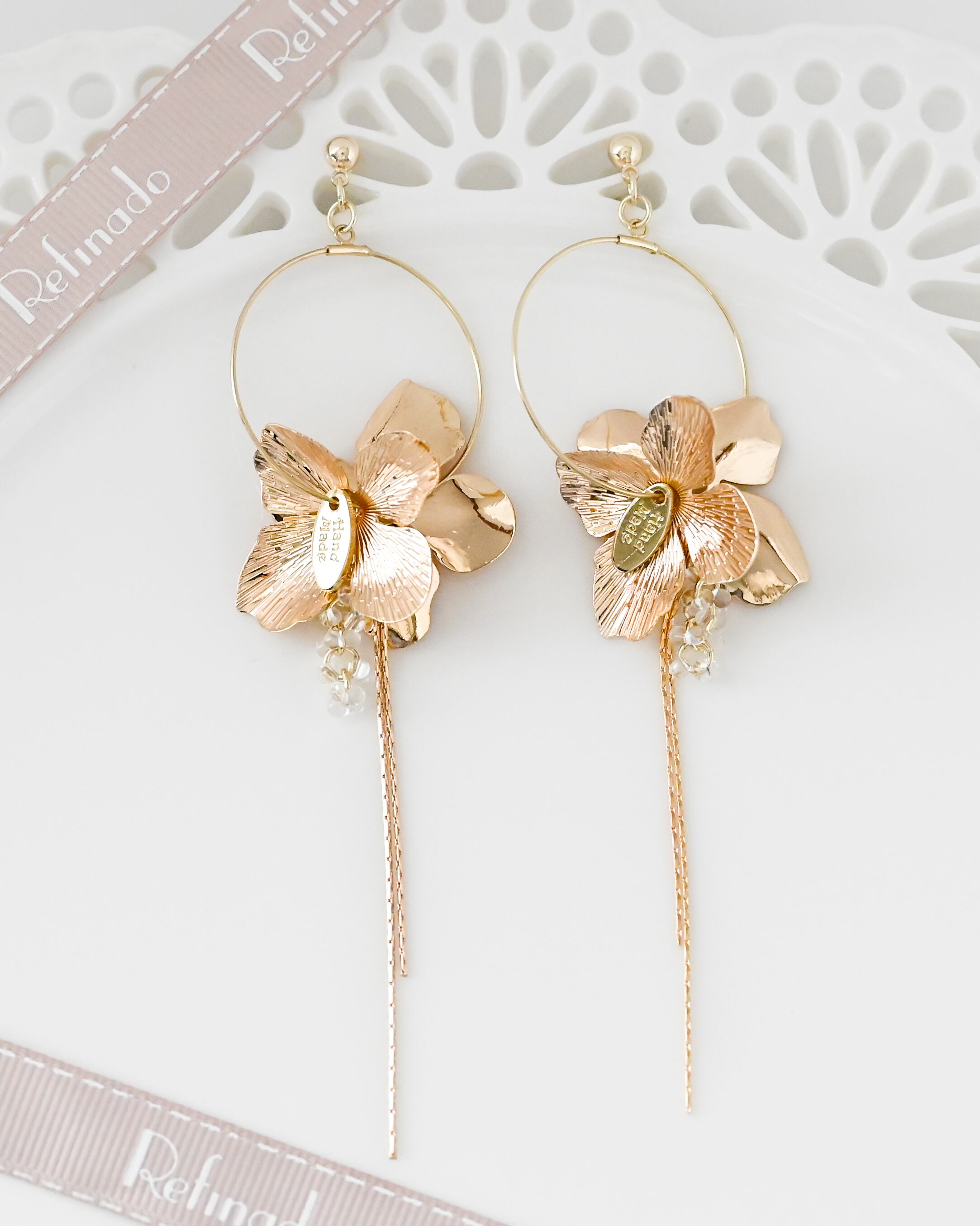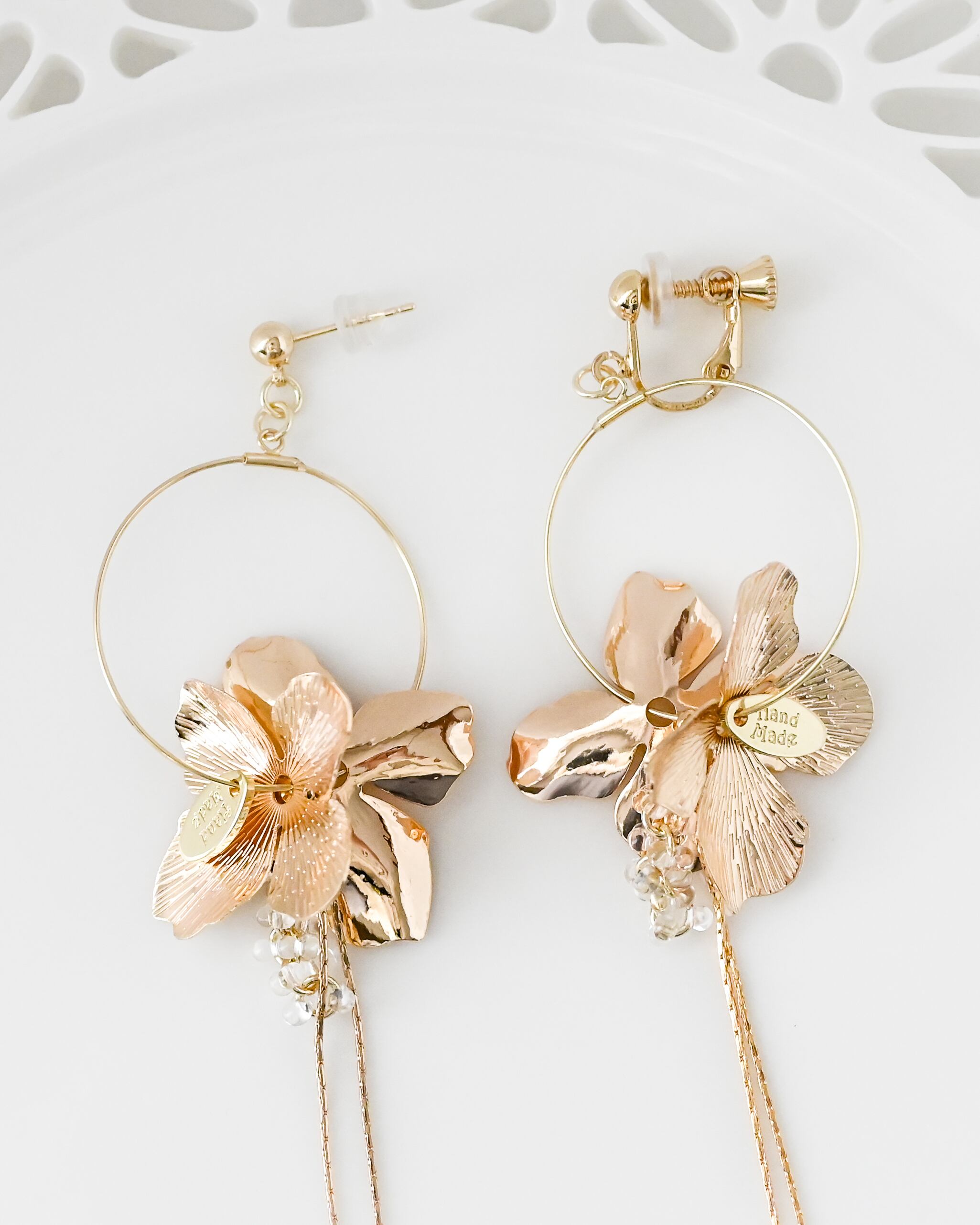 艶やかなメタルフラワーが洗練された印象を与え、耳元でさりげなく輝きながら、上品な存在感を演出します。