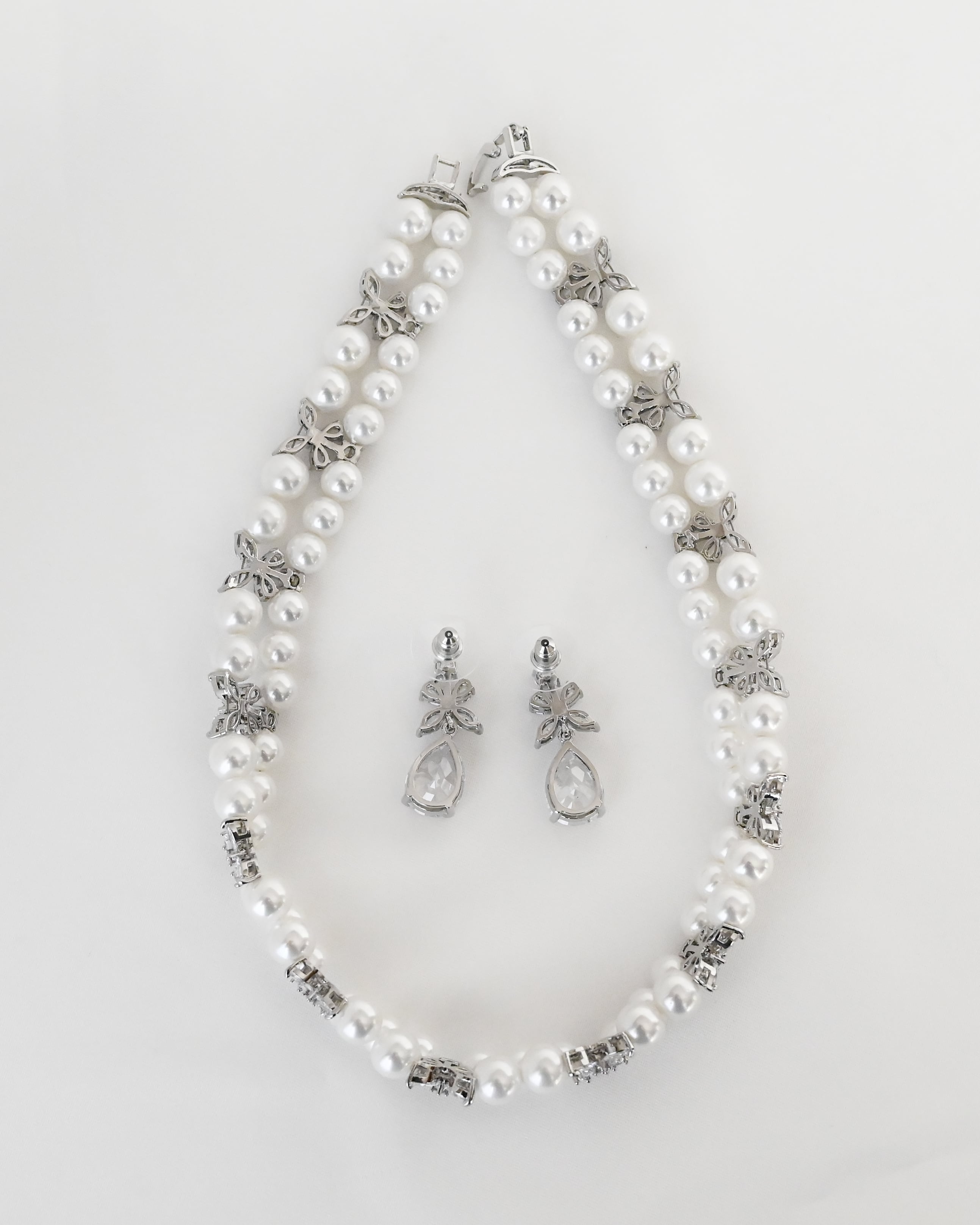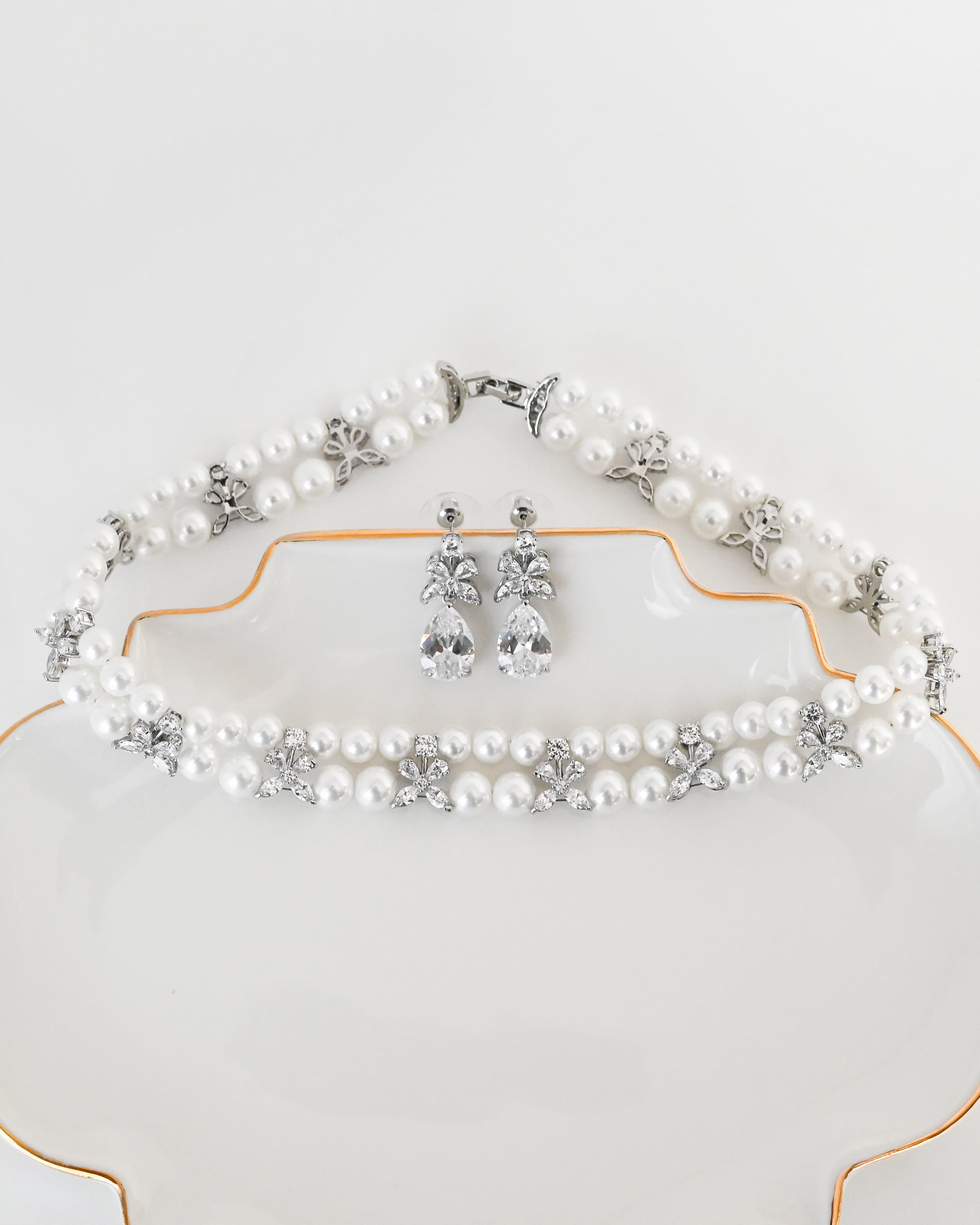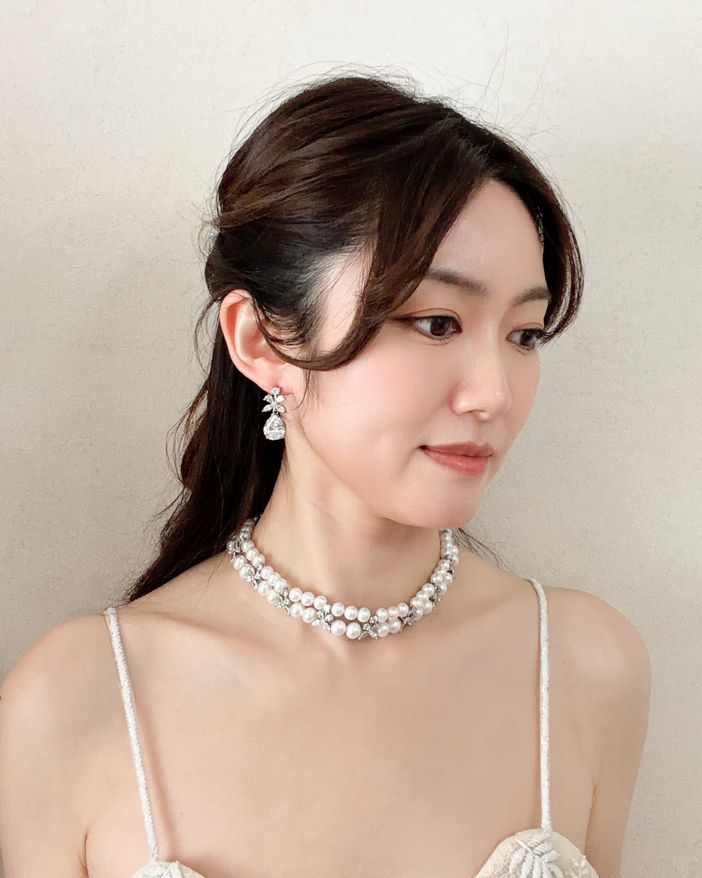 首元と耳元に統一感のある華やかさを添え、洗練されたブライダルスタイルを演出します。