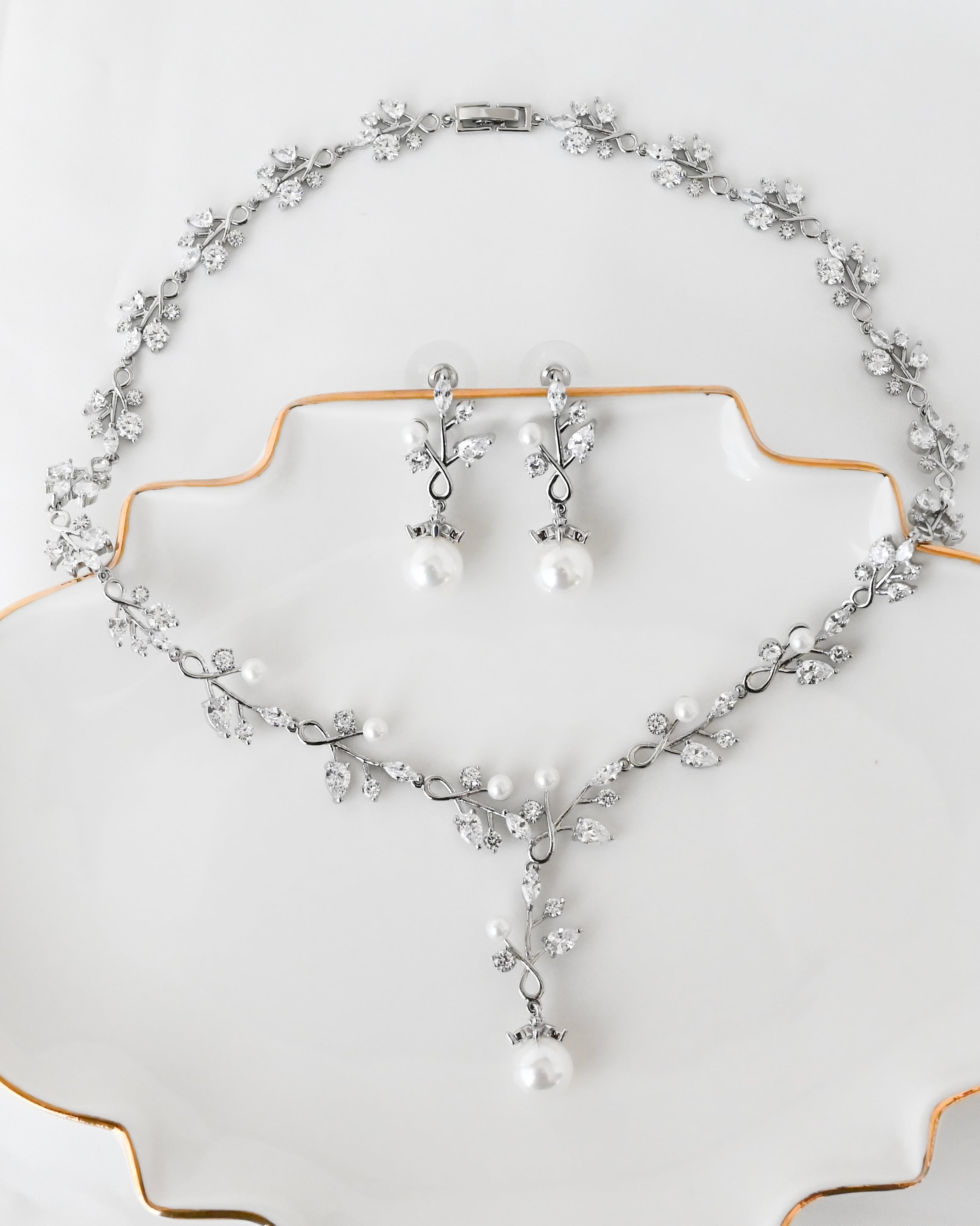 リーフモチーフ ビジュー×パールブライダルネックレス&ピアスセットシルバー【NE2604-04S】