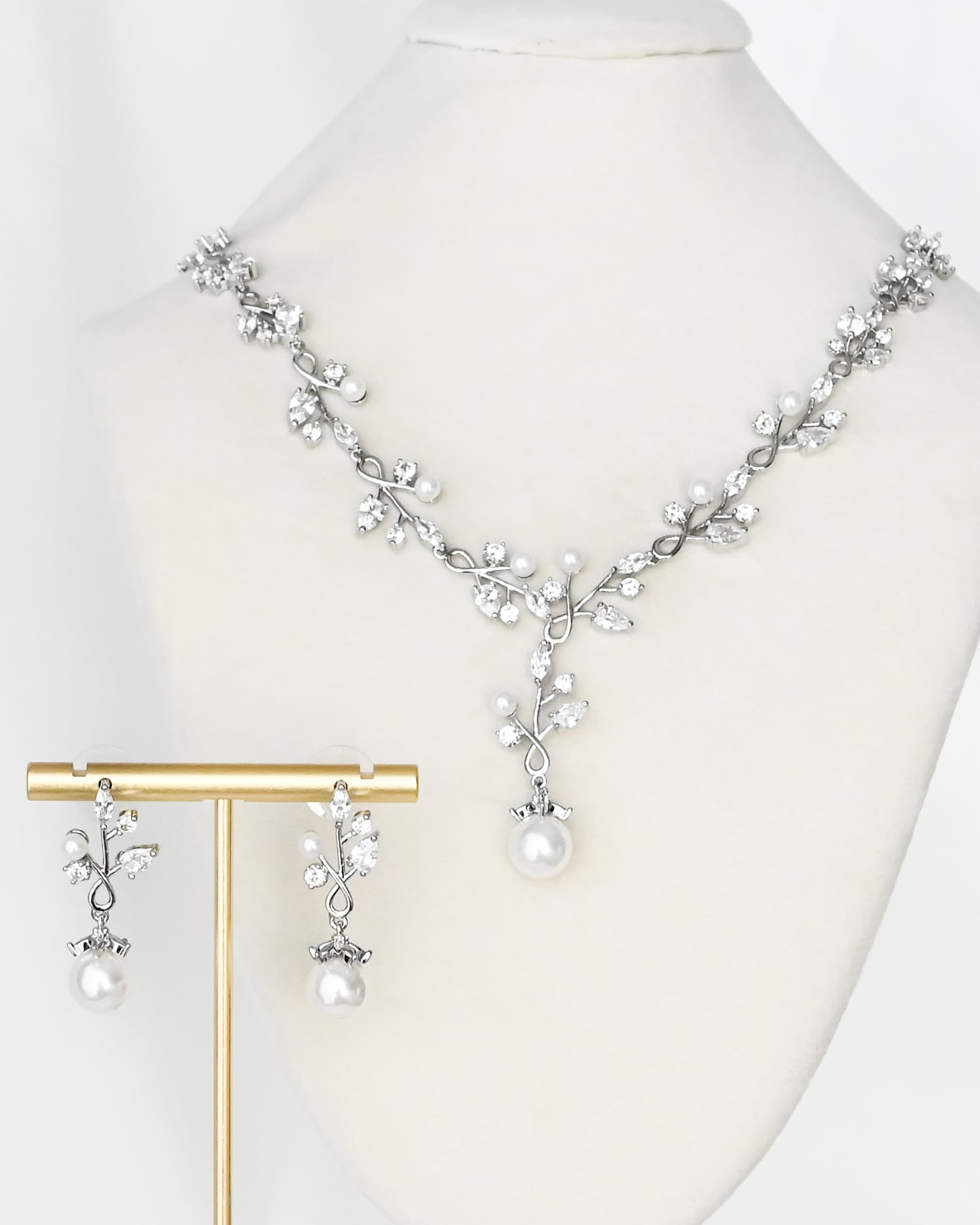 繊細なリーフモチーフにビジューとパールをあしらった、ナチュラルで上品な印象のネックレス&ピアスセット。