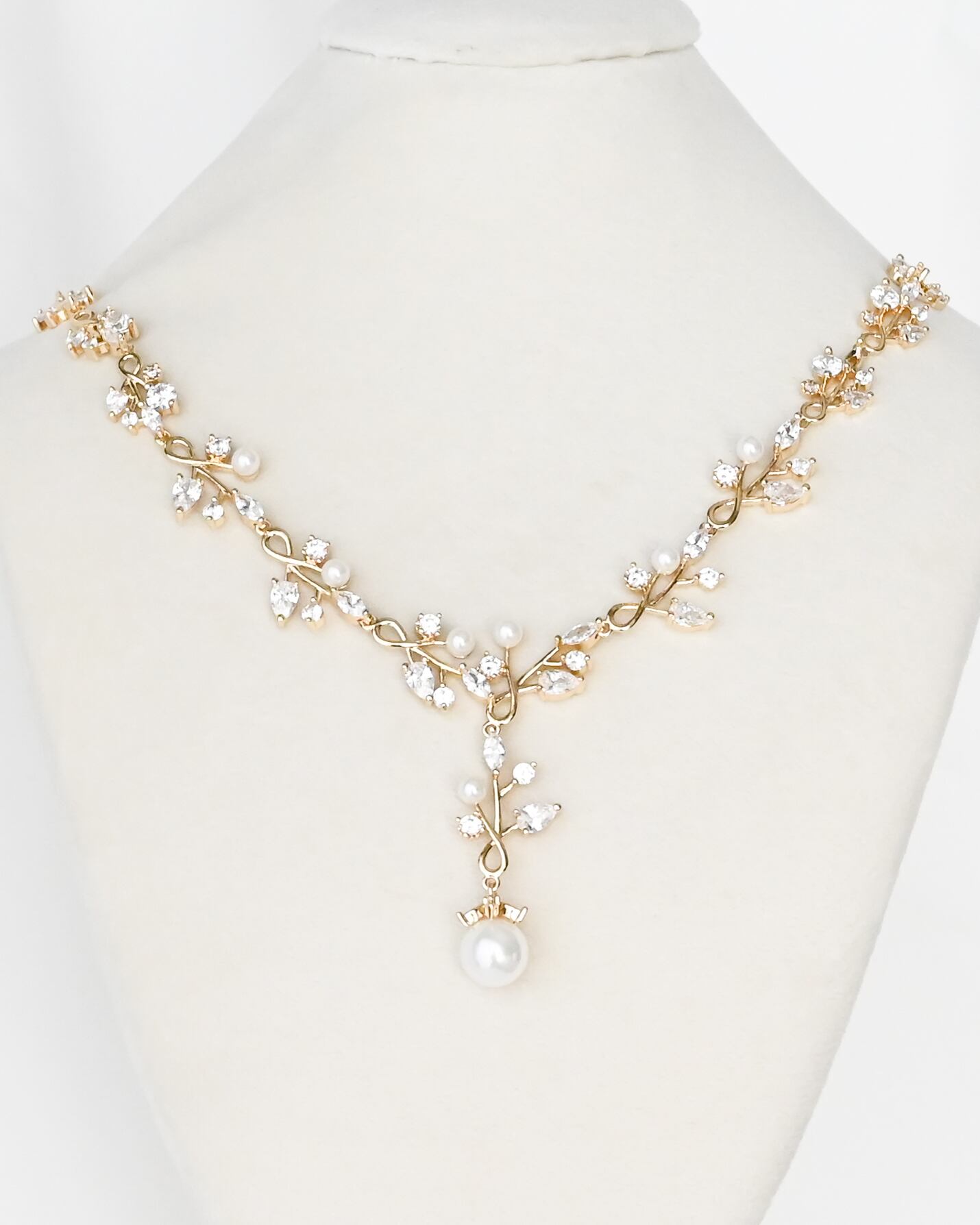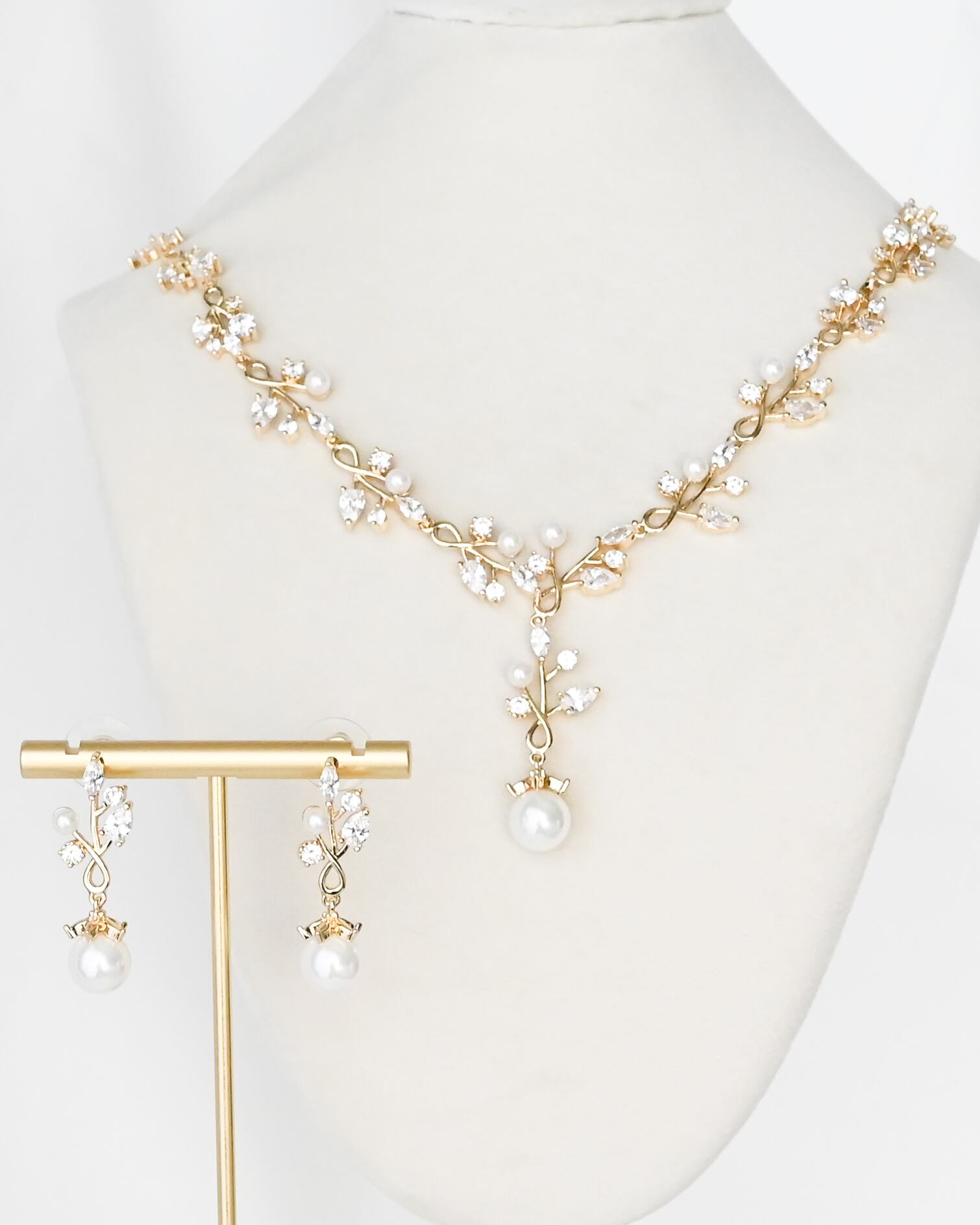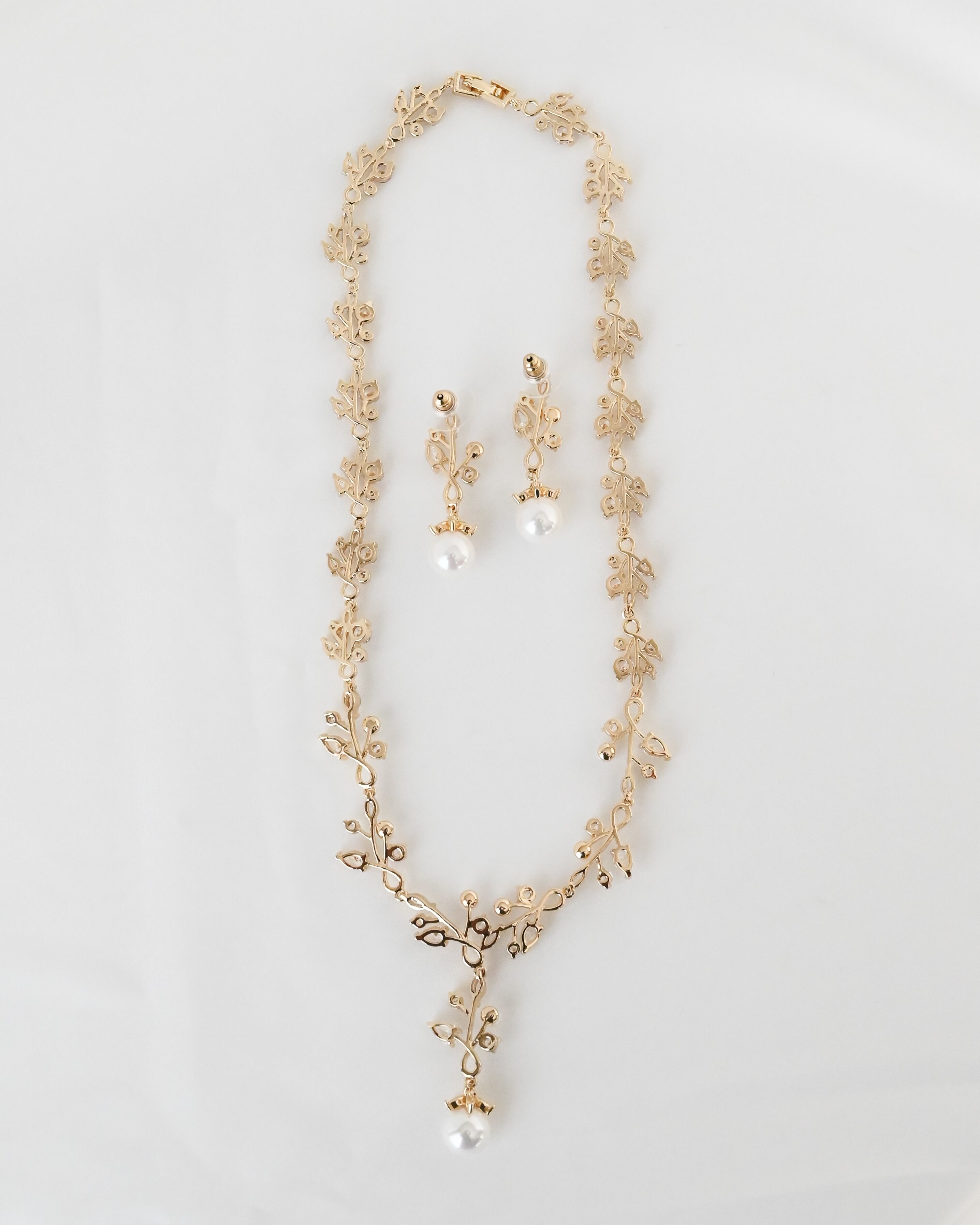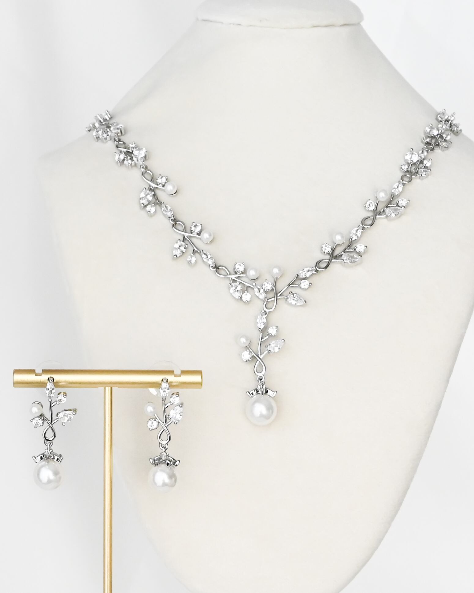 繊細なリーフモチーフにビジューとパールをあしらった、ナチュラルで上品な印象のネックレス&ピアスセット。