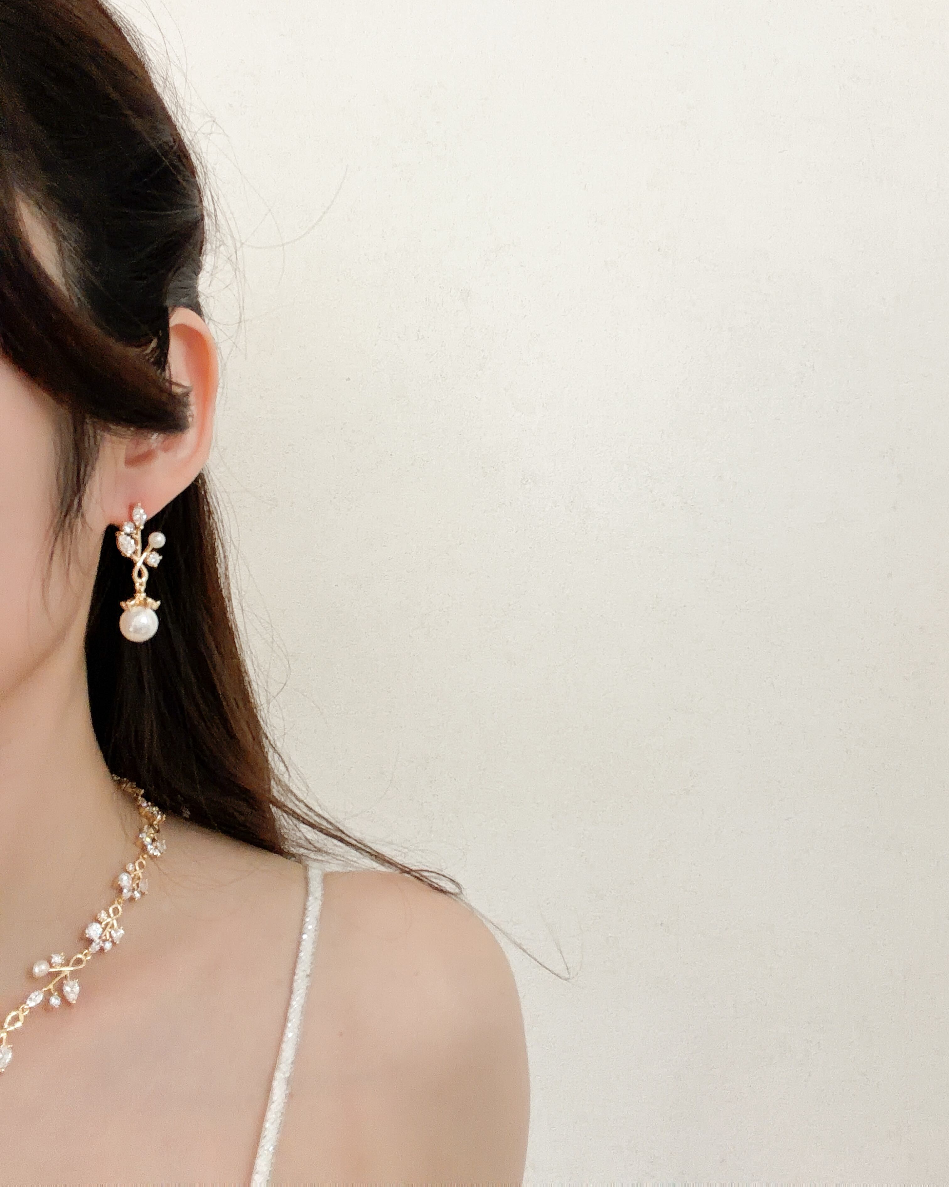 ピアスは同デザインの揺れるタイプで、動くたびに繊細な輝きをプラス。