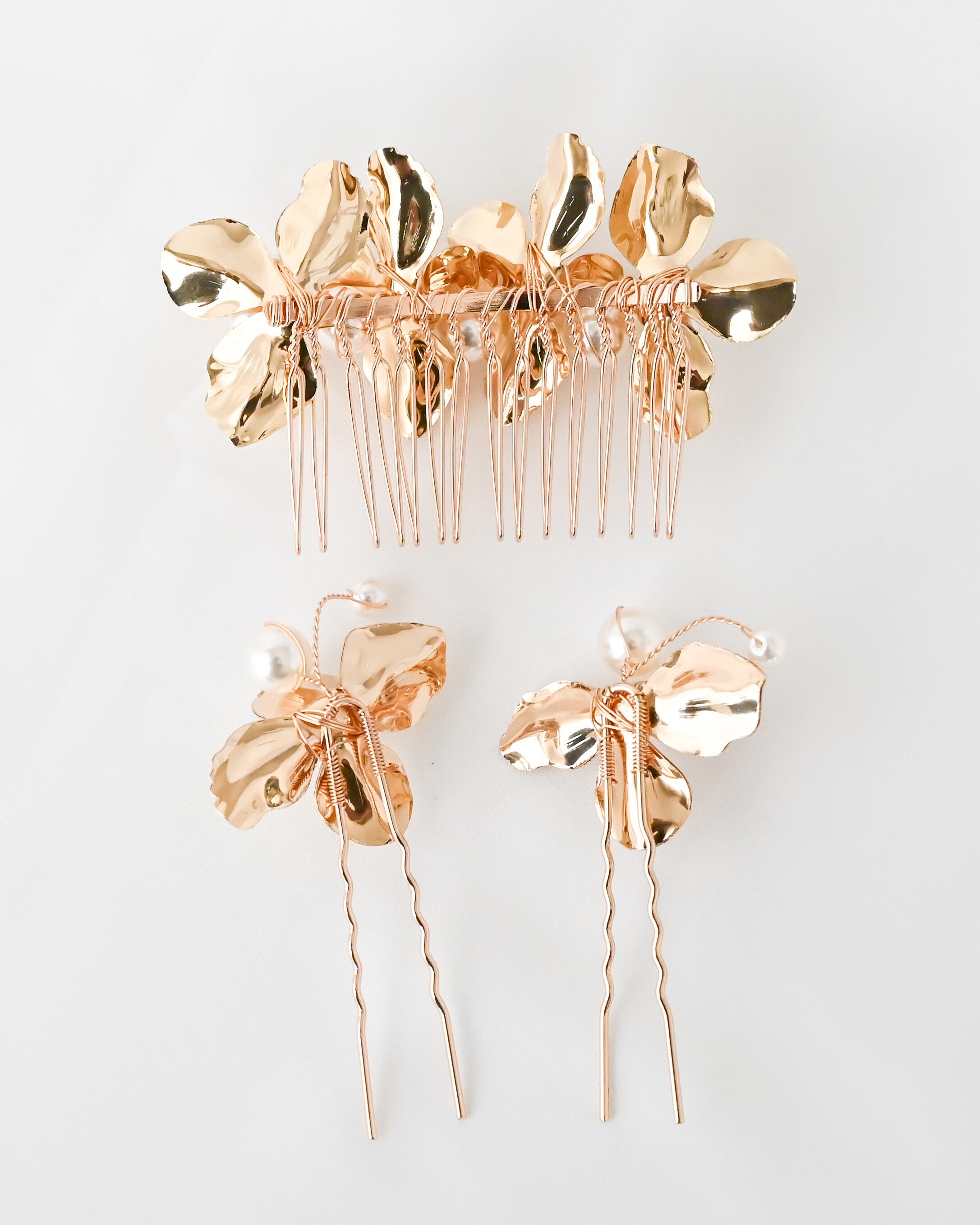 華やかなゴールドフラワーとパールを贅沢にあしらった、ヘアアクセサリー3点セット。