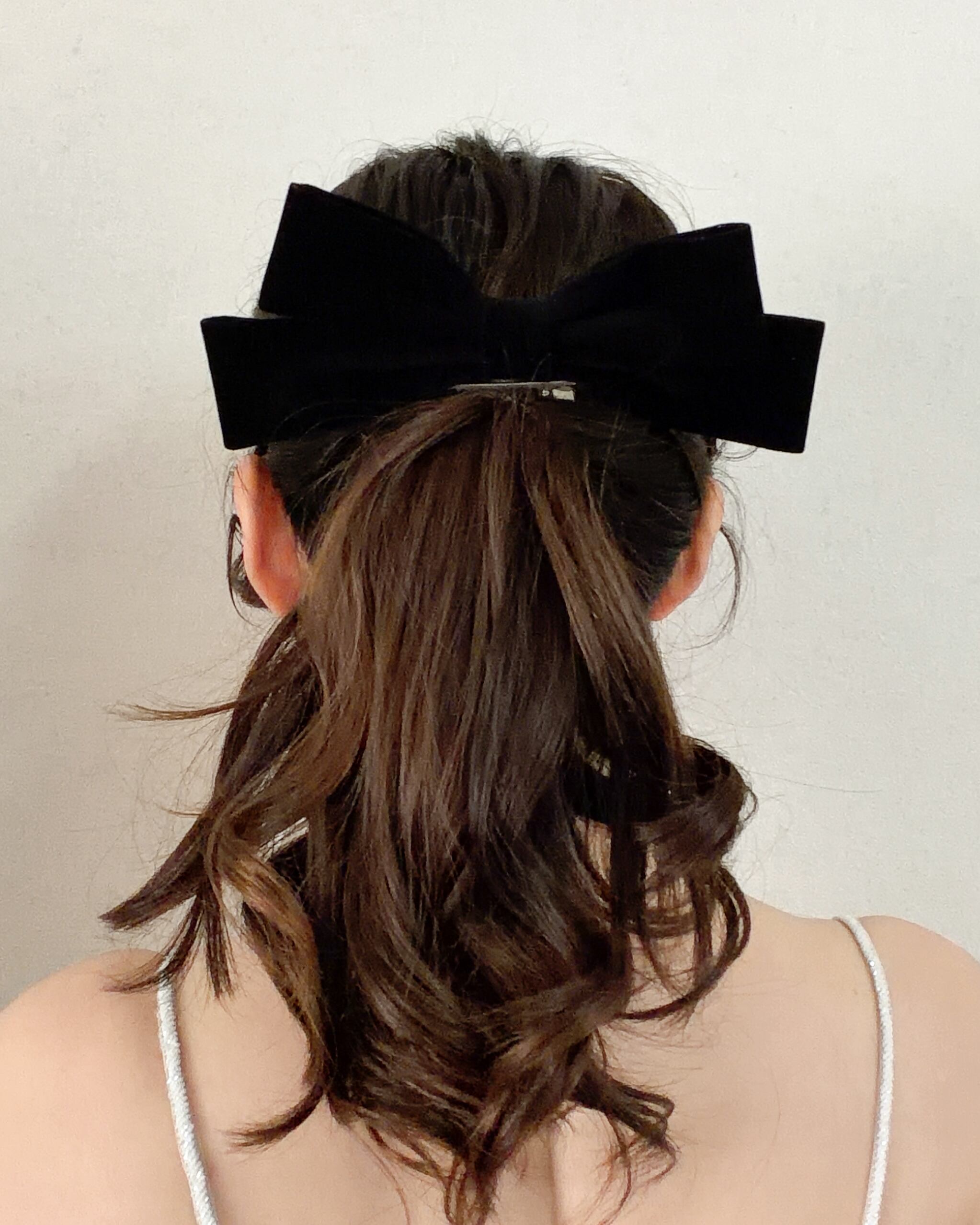 リボン下にはクリップが付いており、ポニーテールやハーフアップなどに留めるだけで、まとまりのあるヘアスタイルが完成します。