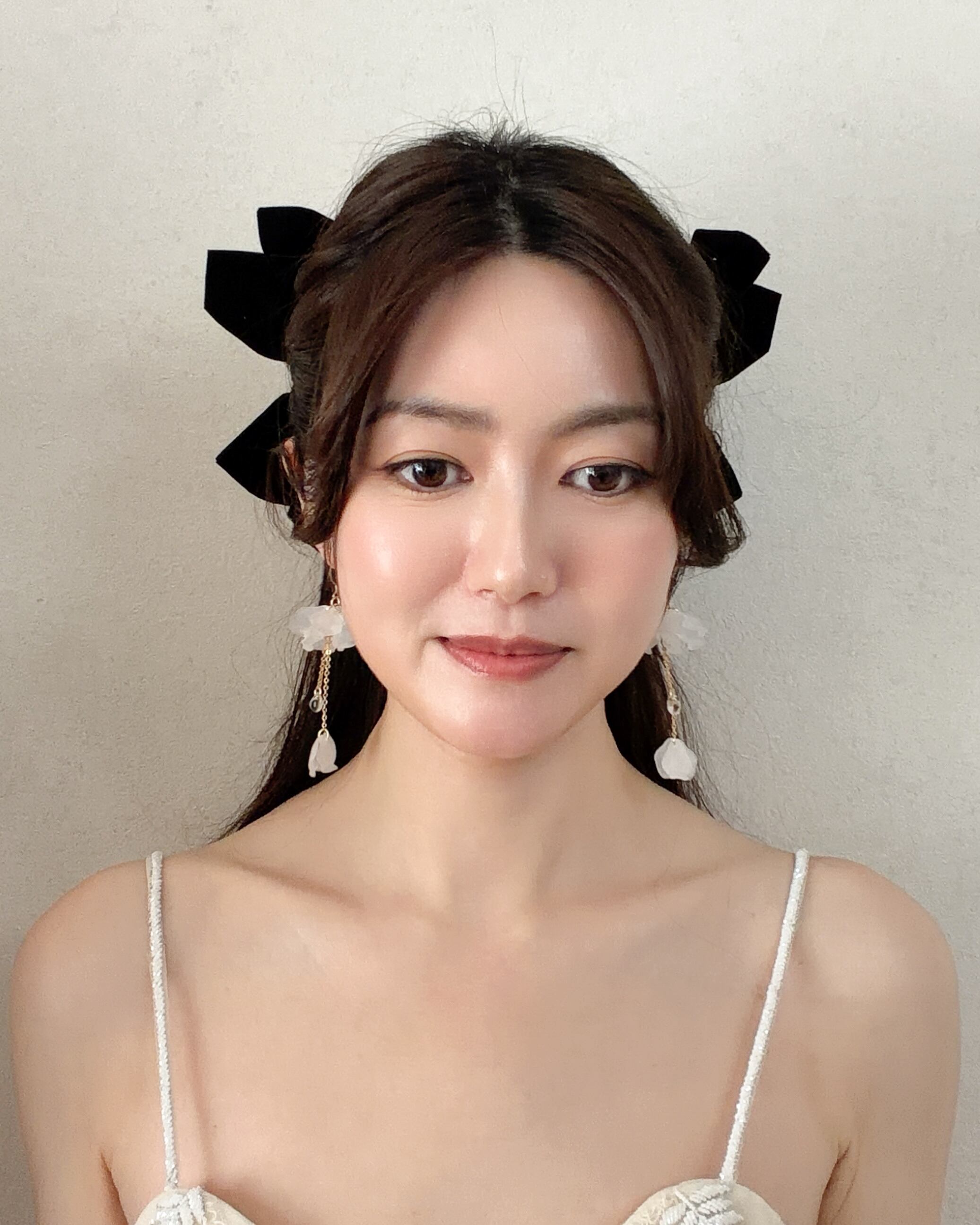 リボンの下にクリップが付いているタイプであり、ヘアアレンジ方法や留め方についてはヘアメイクさんとご相談いただきながら、お好みのスタイルでお楽しみください。
