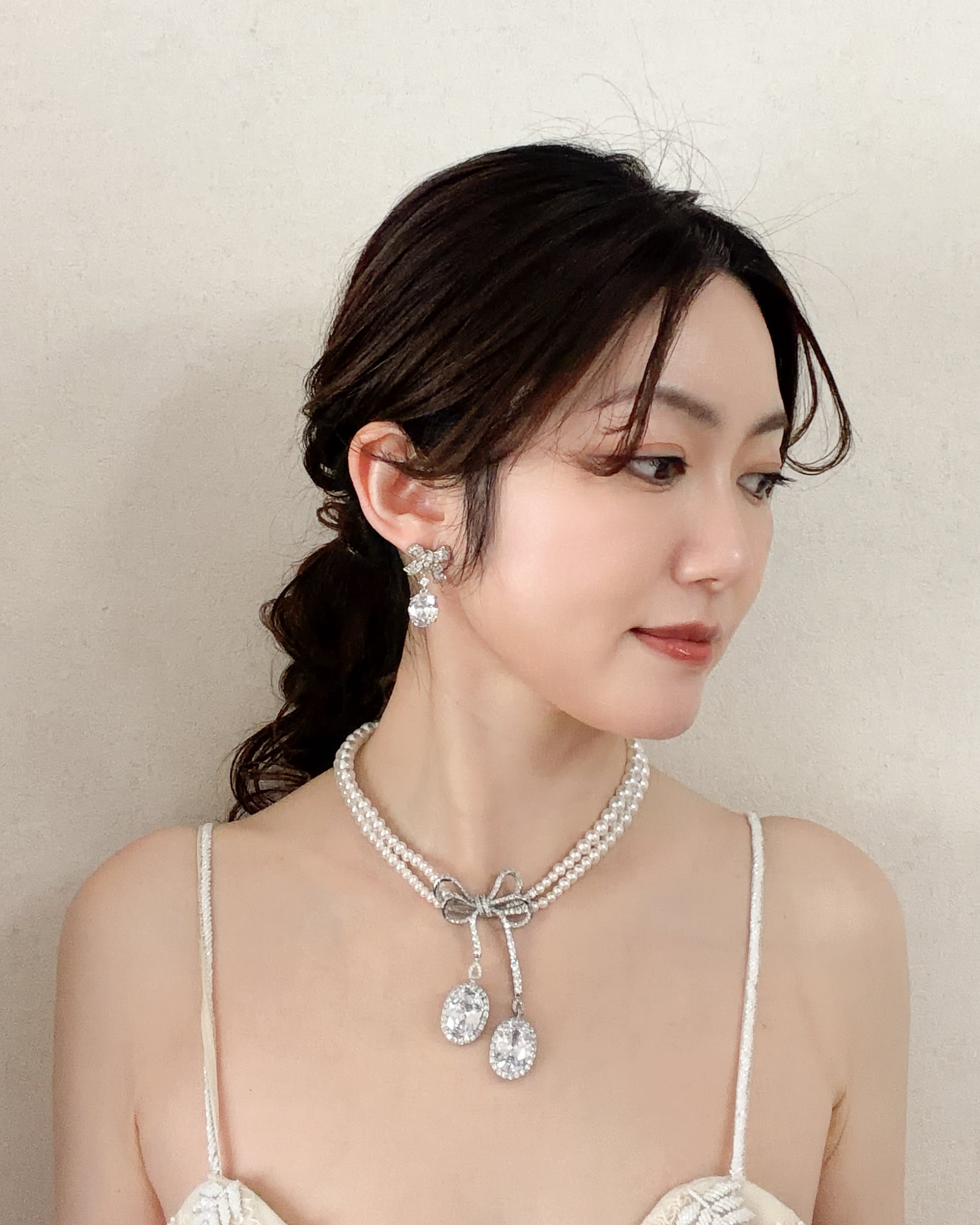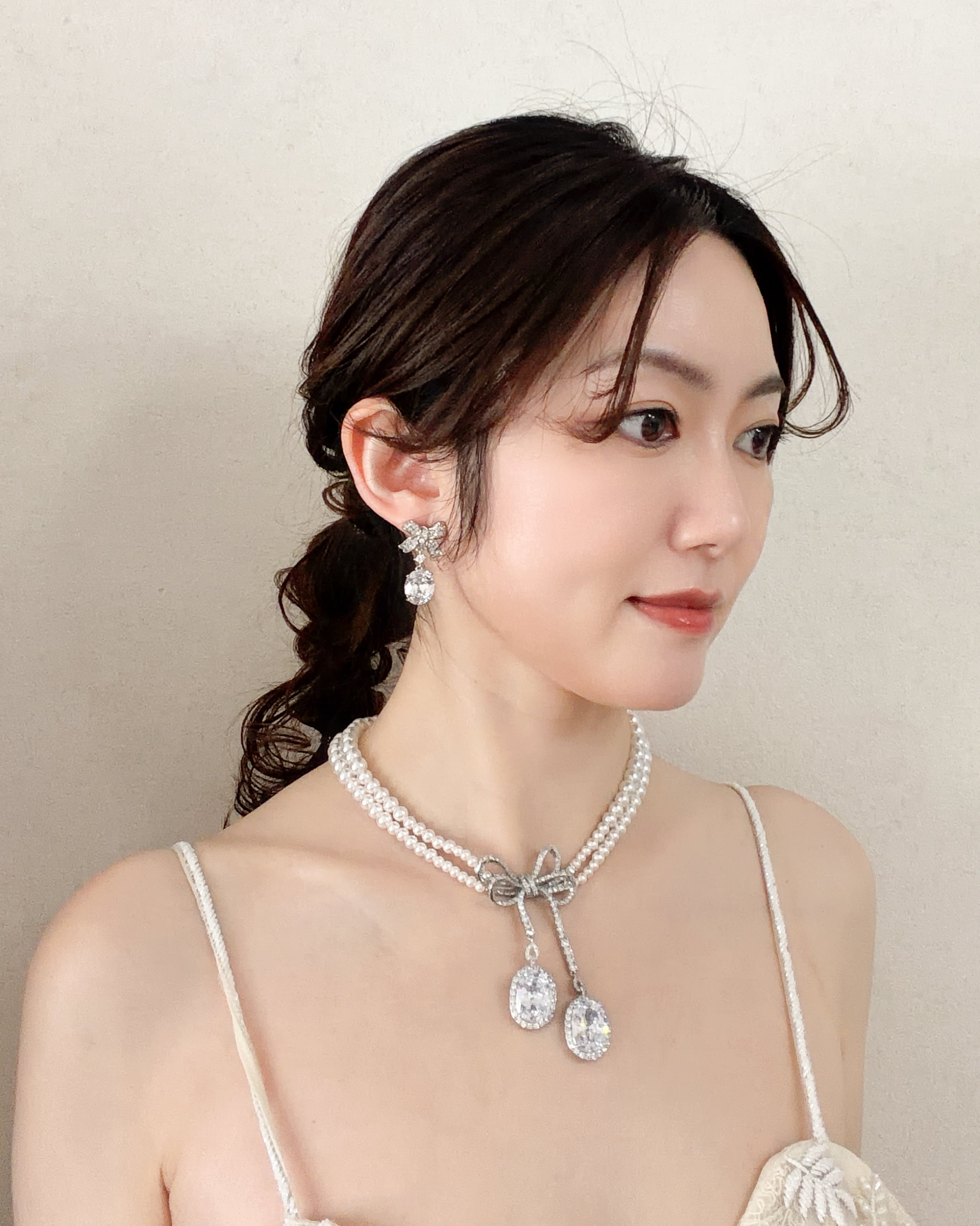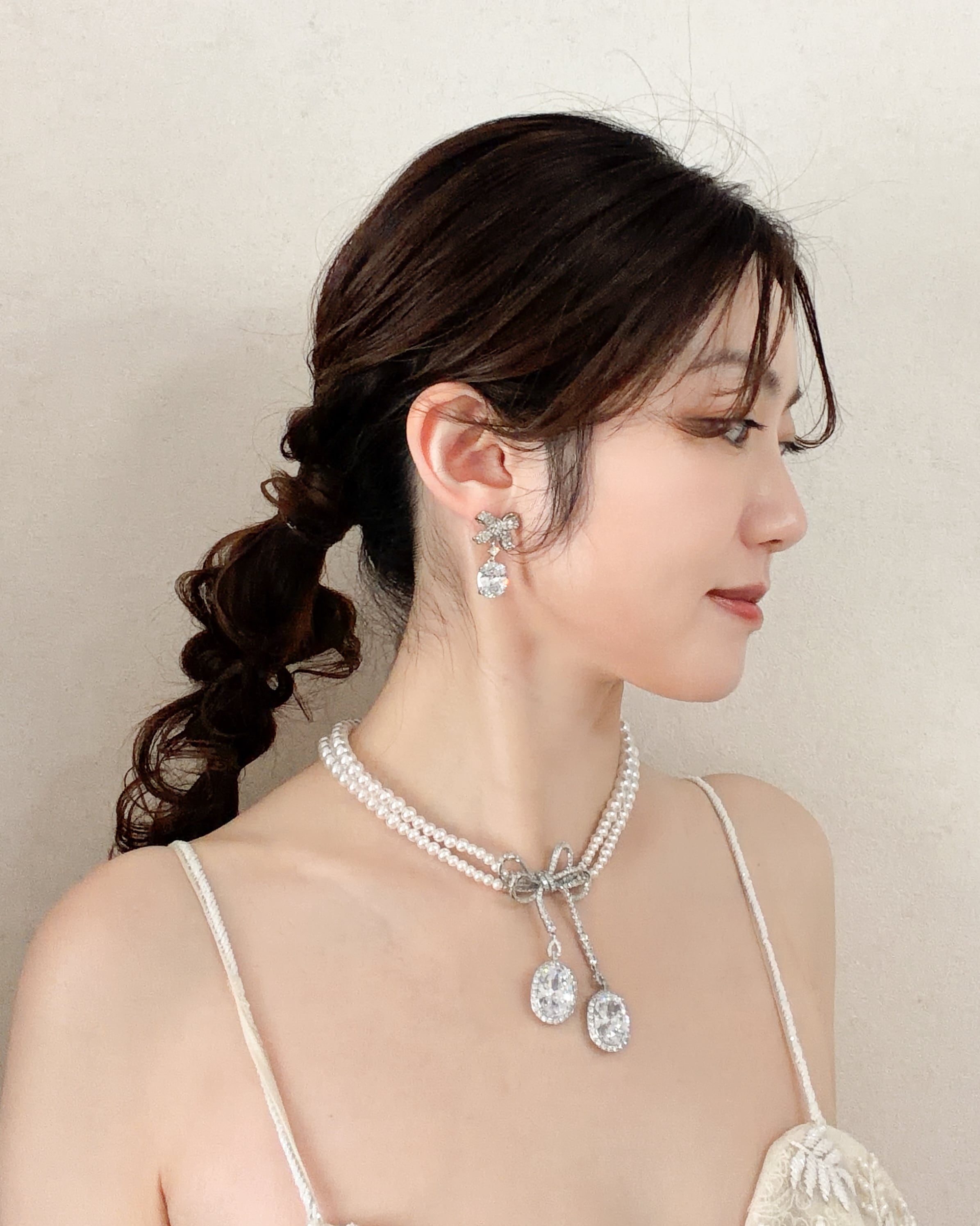 ネックレスは、2連パールに華やかなビジューリボンをあしらい、揺れるドロップストーンが胸元を美しく引き立てます。