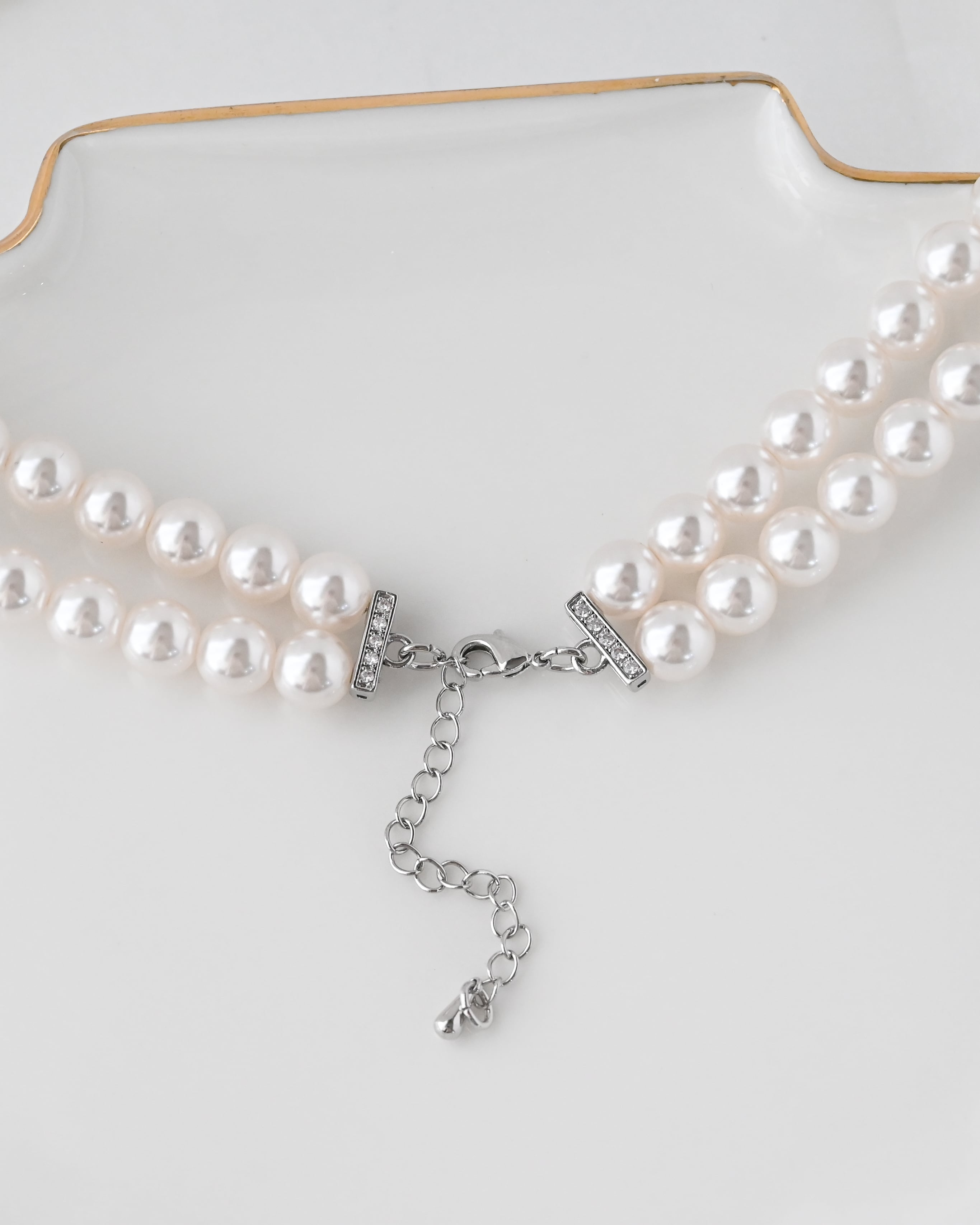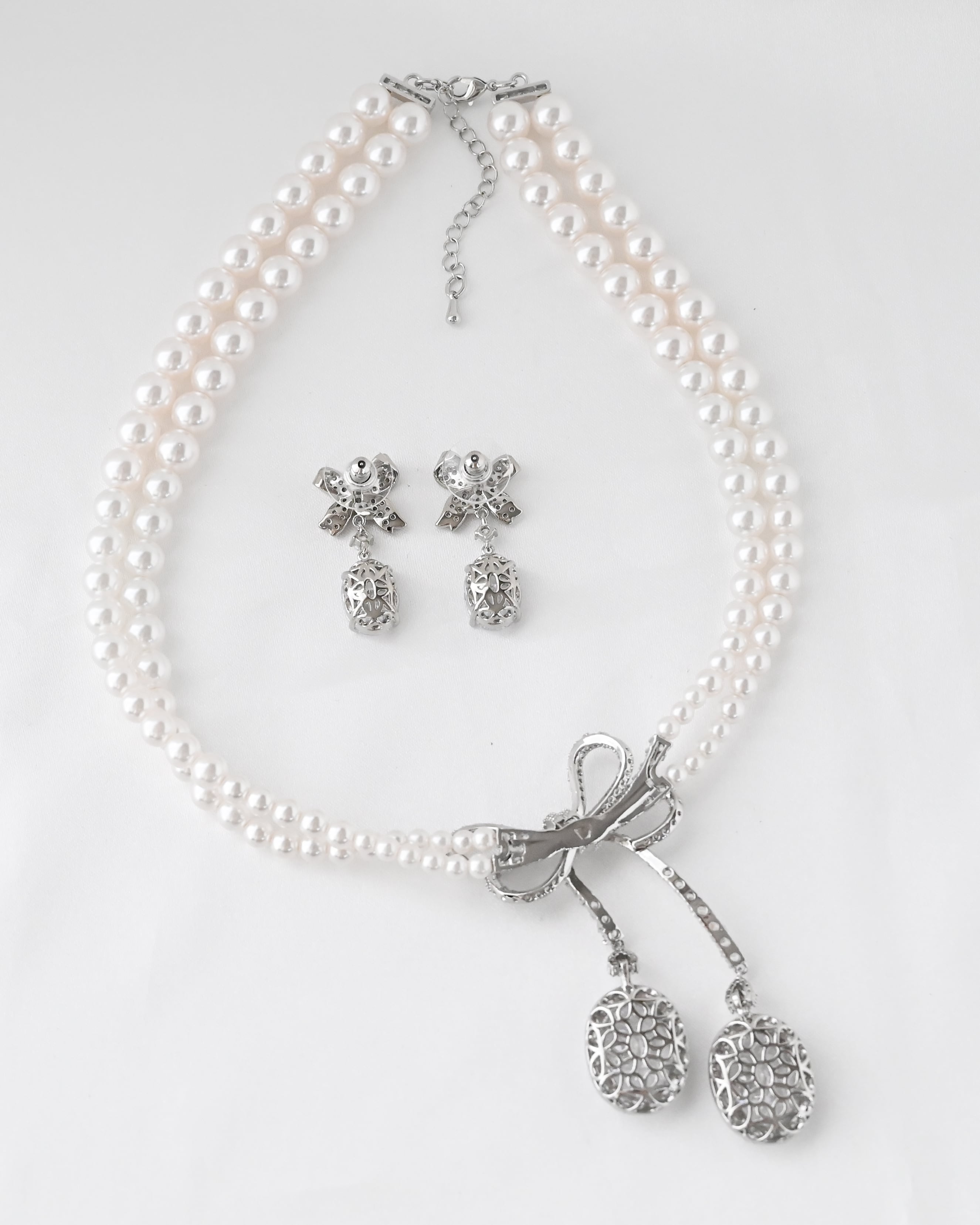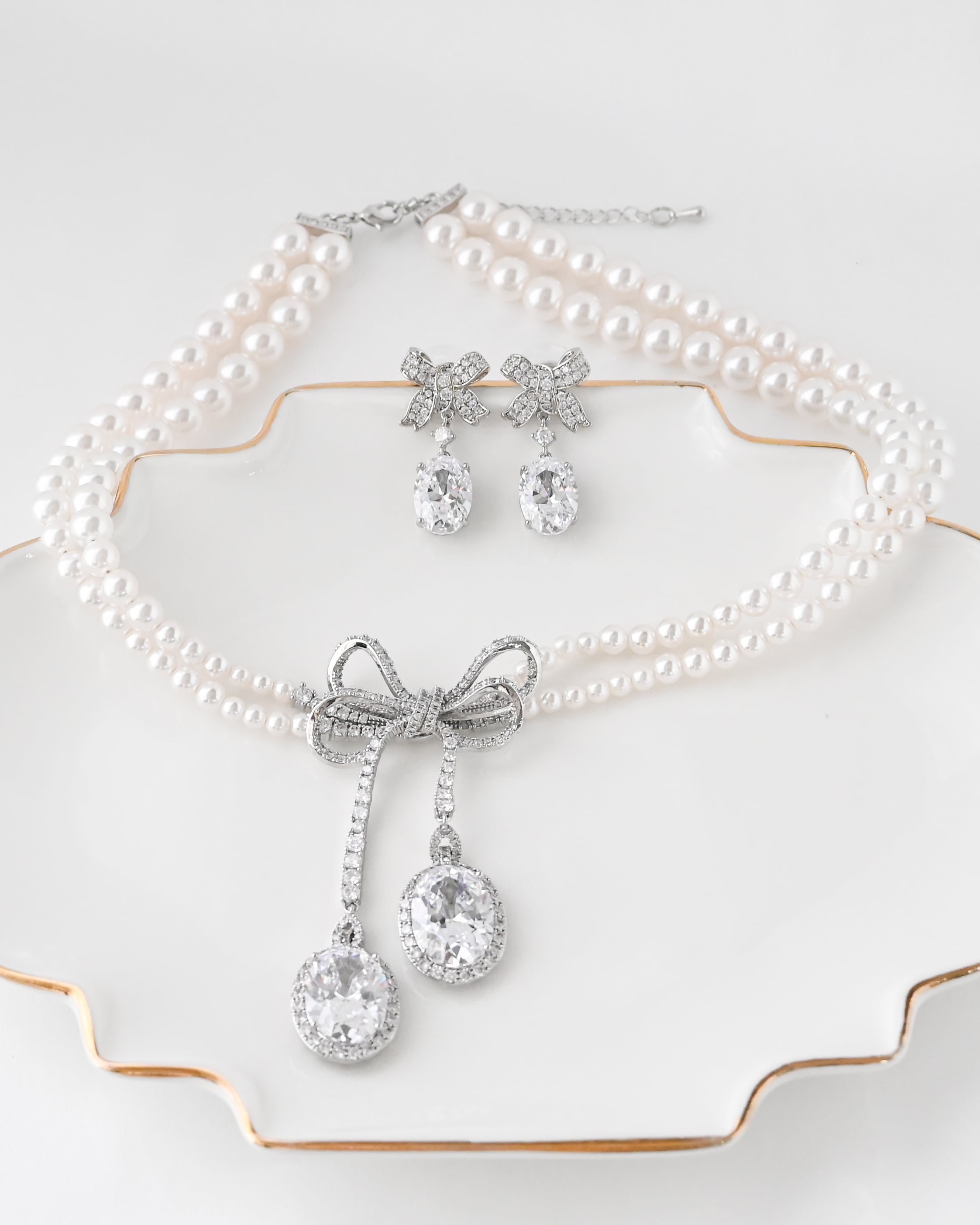ネックレスは、2連パールに華やかなビジューリボンをあしらい、揺れるドロップストーンが胸元を美しく引き立てます。