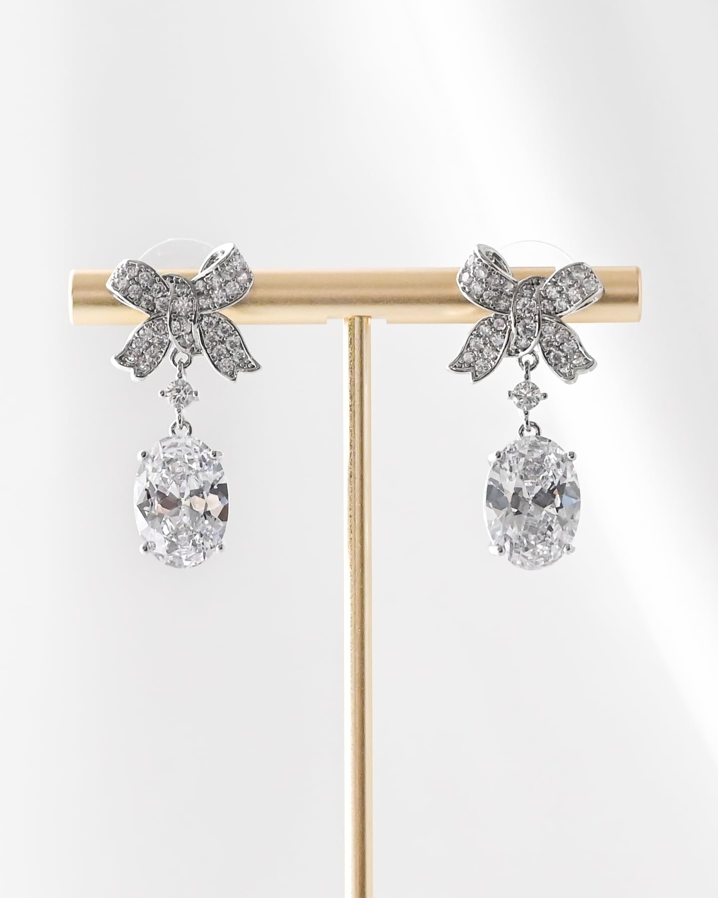 お揃いのピアスは、立体感のあるリボンデザインに大粒ストーンを合わせ、顔まわりに華やかさと統一感をプラス。