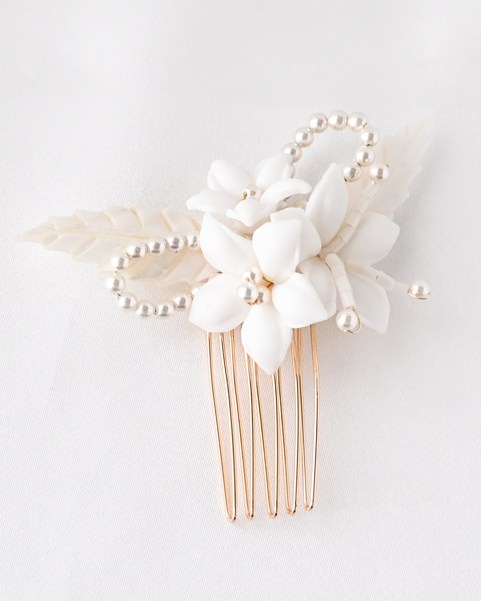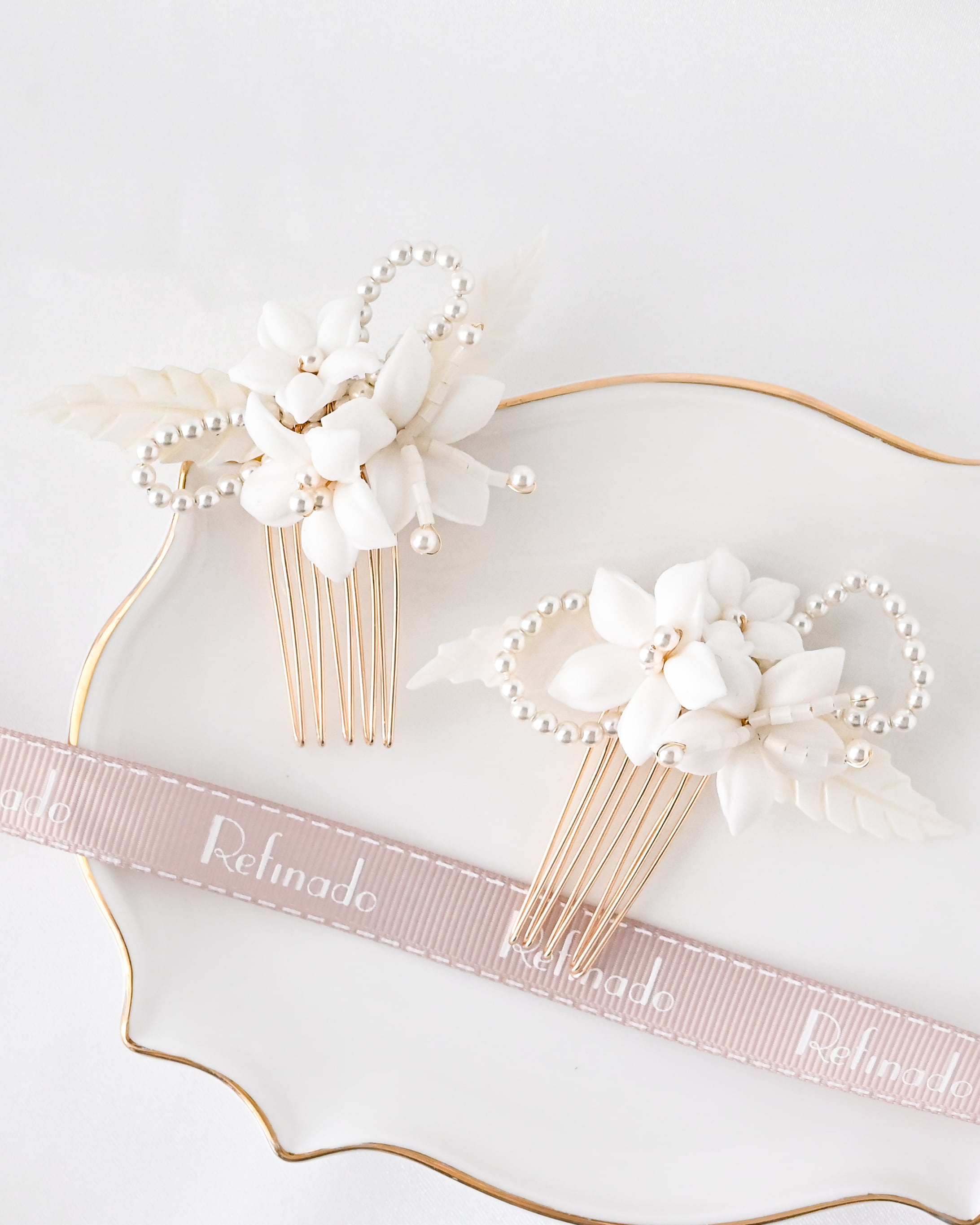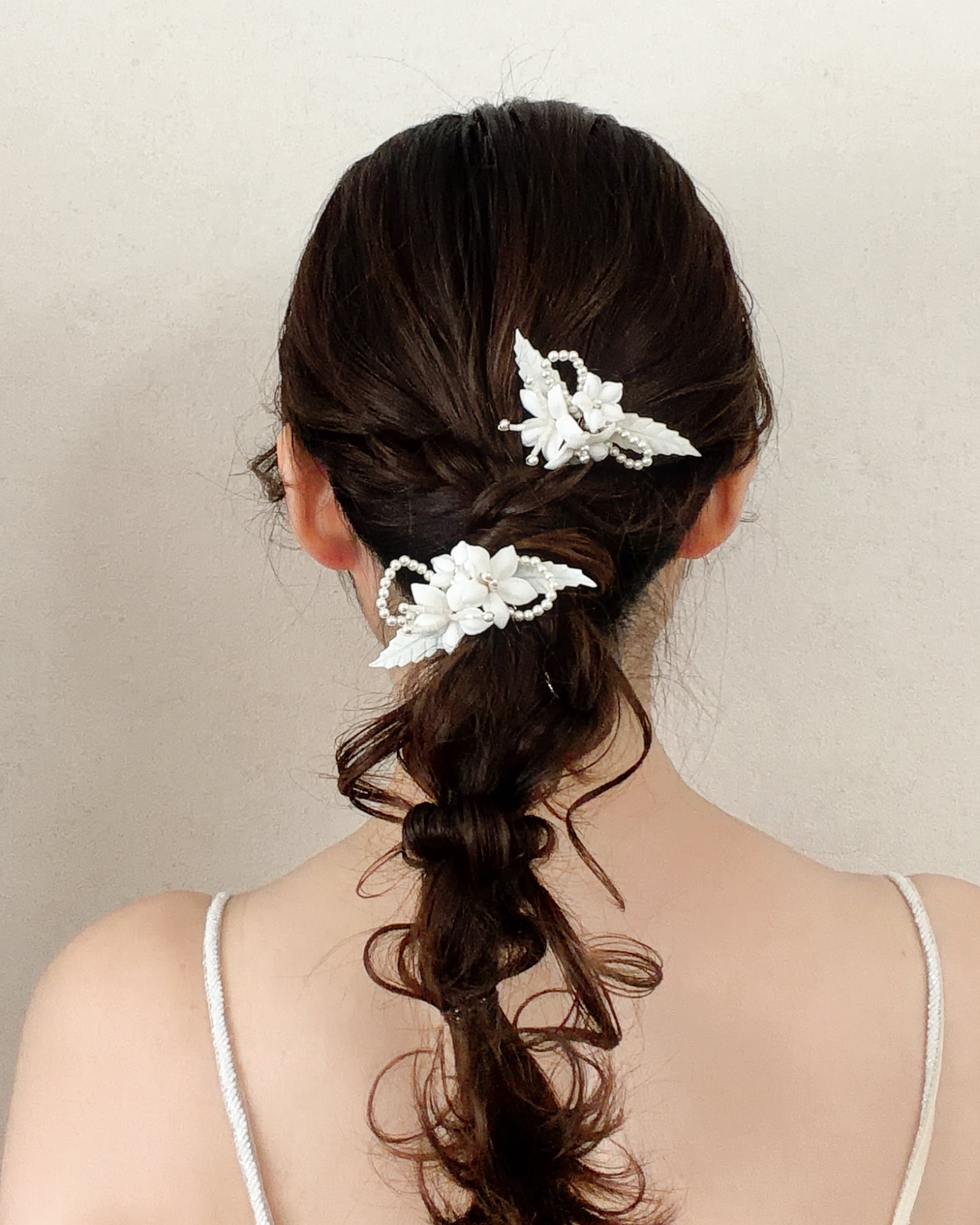 セラミックの白いお花と繊細なパールビーズをあしらった、上品で可憐なヘアアクセサリー2点セット。