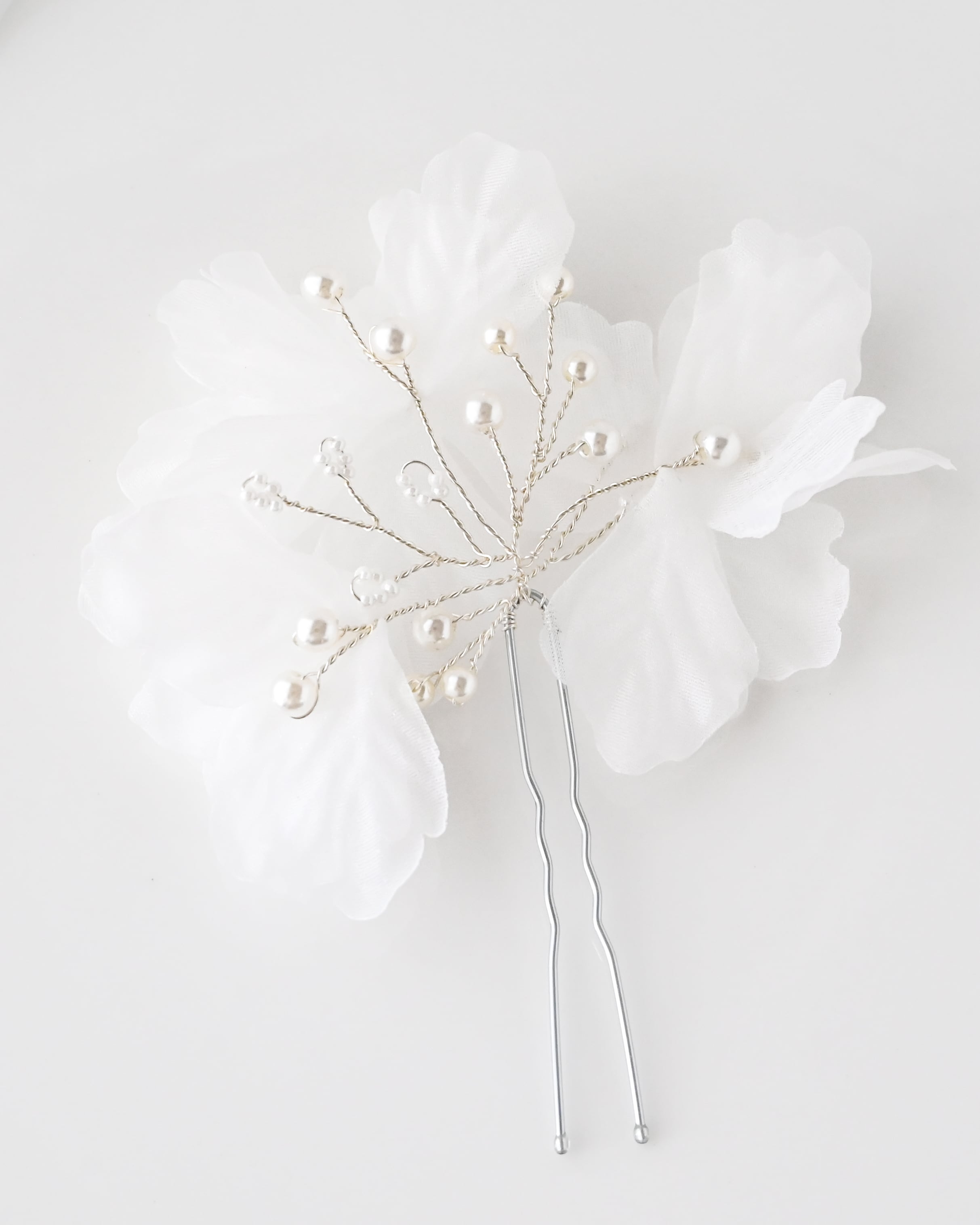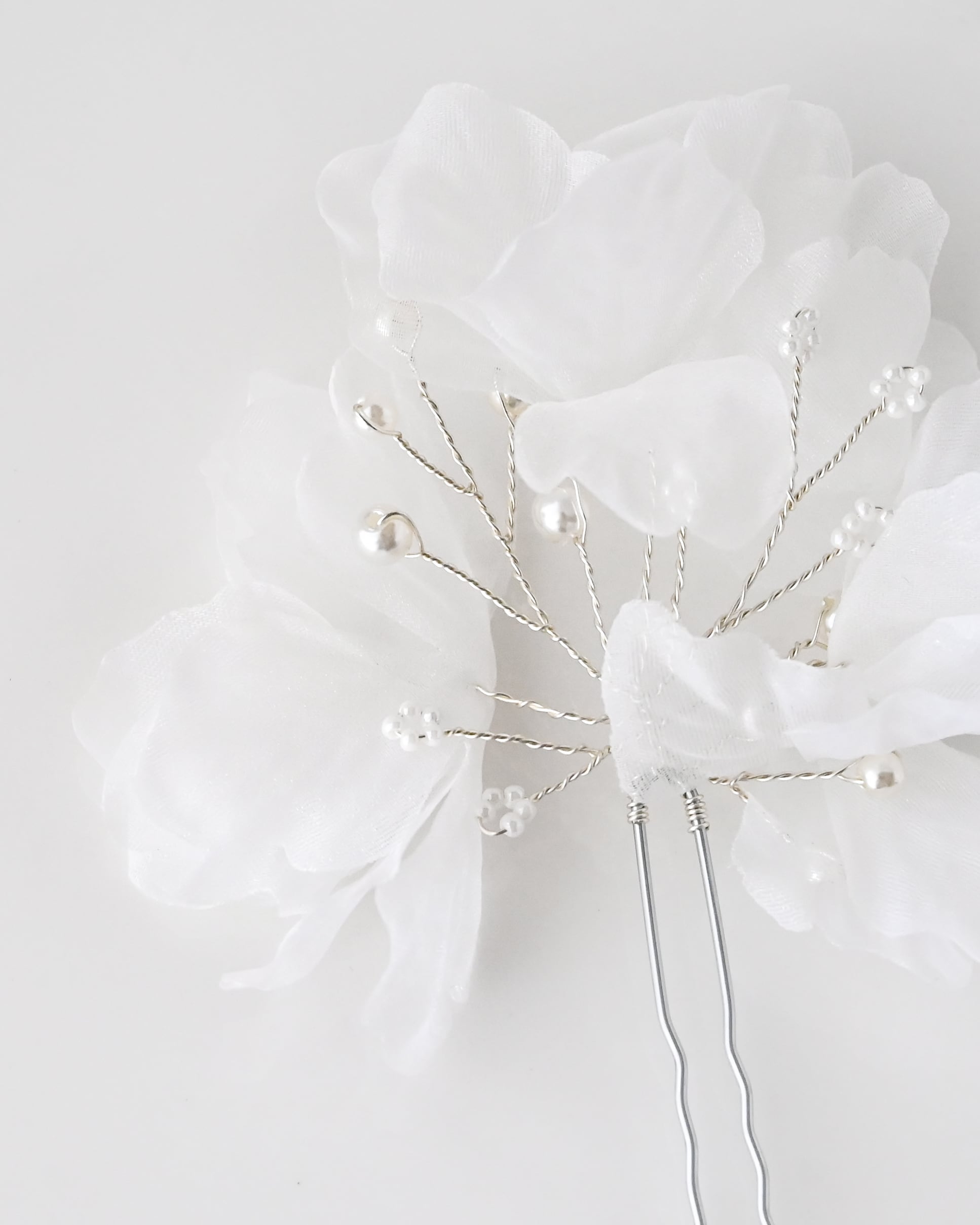 ふんわりとしたシフォン素材の花びらに、繊細なパールビーズをあしらった、やさしく上品なヘアアクセサリー。