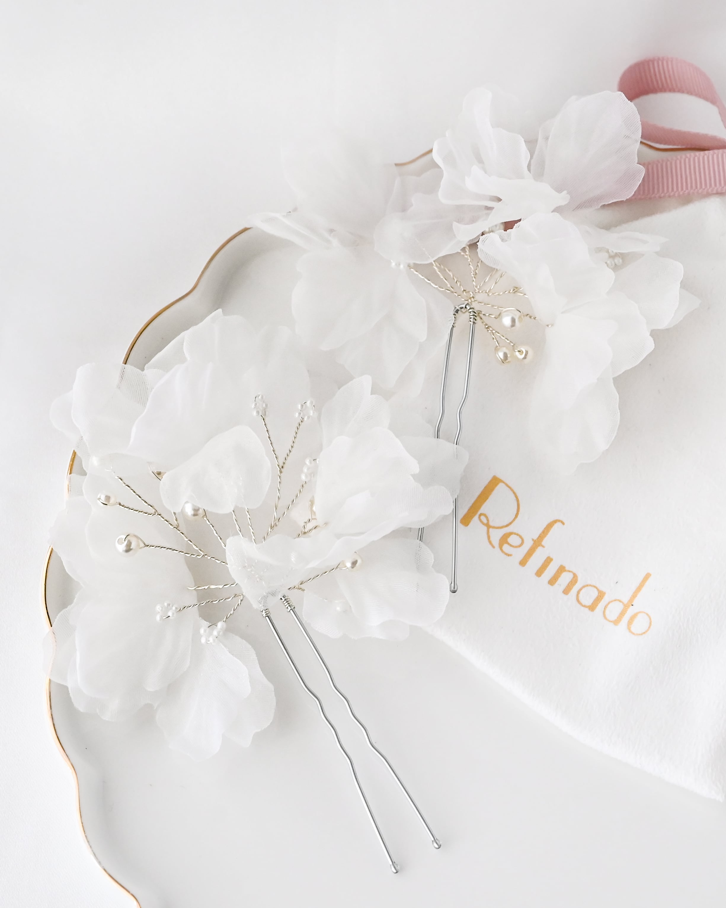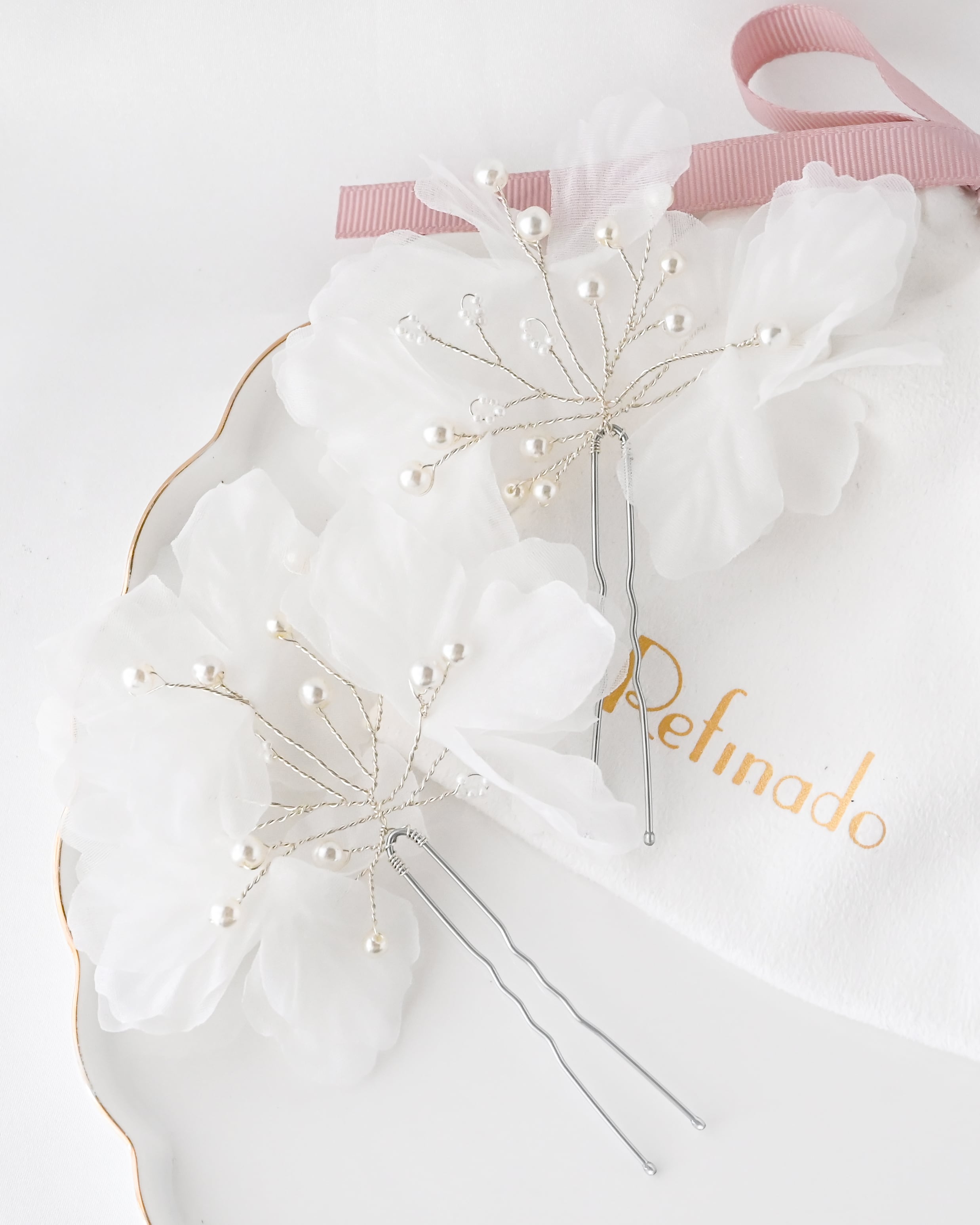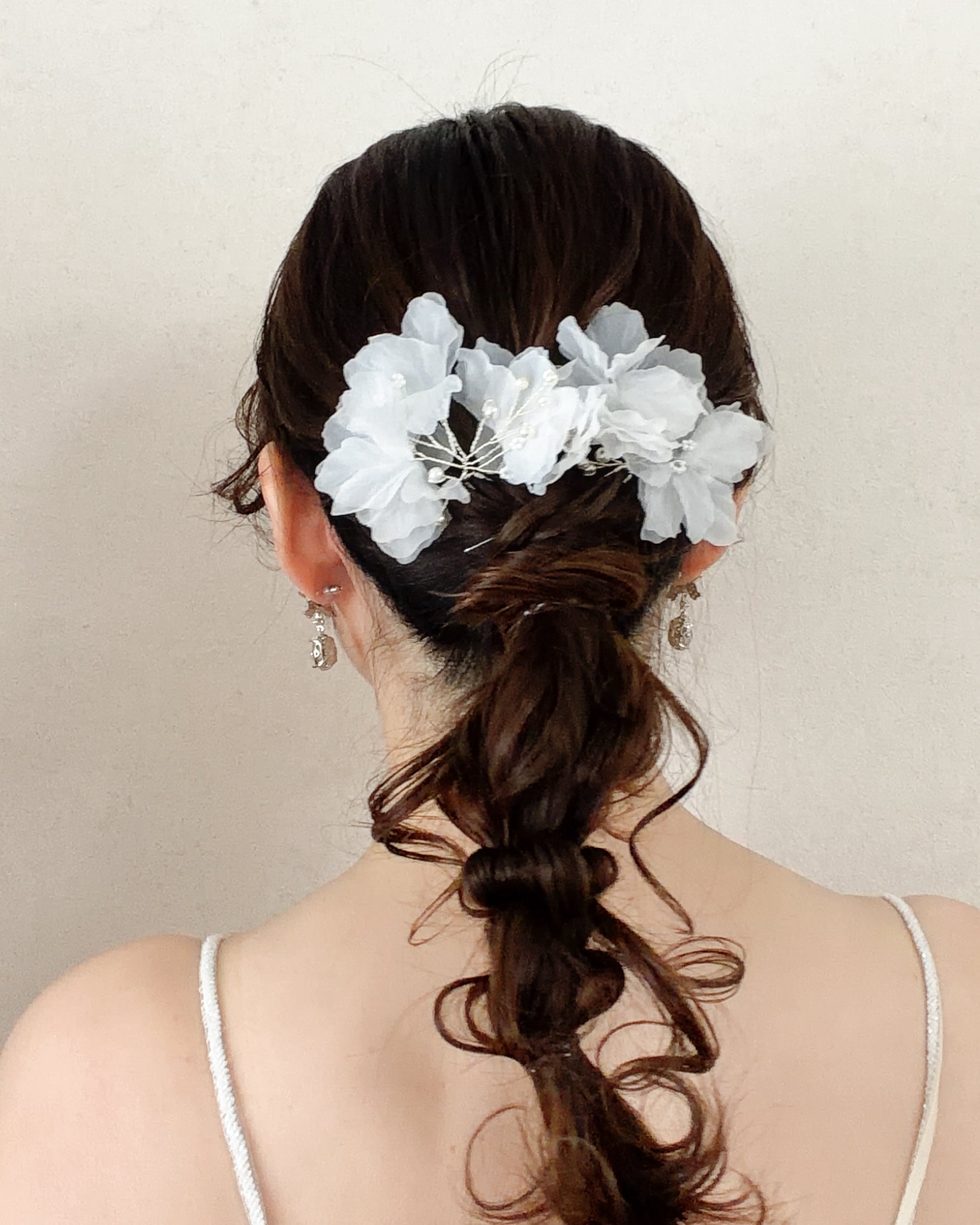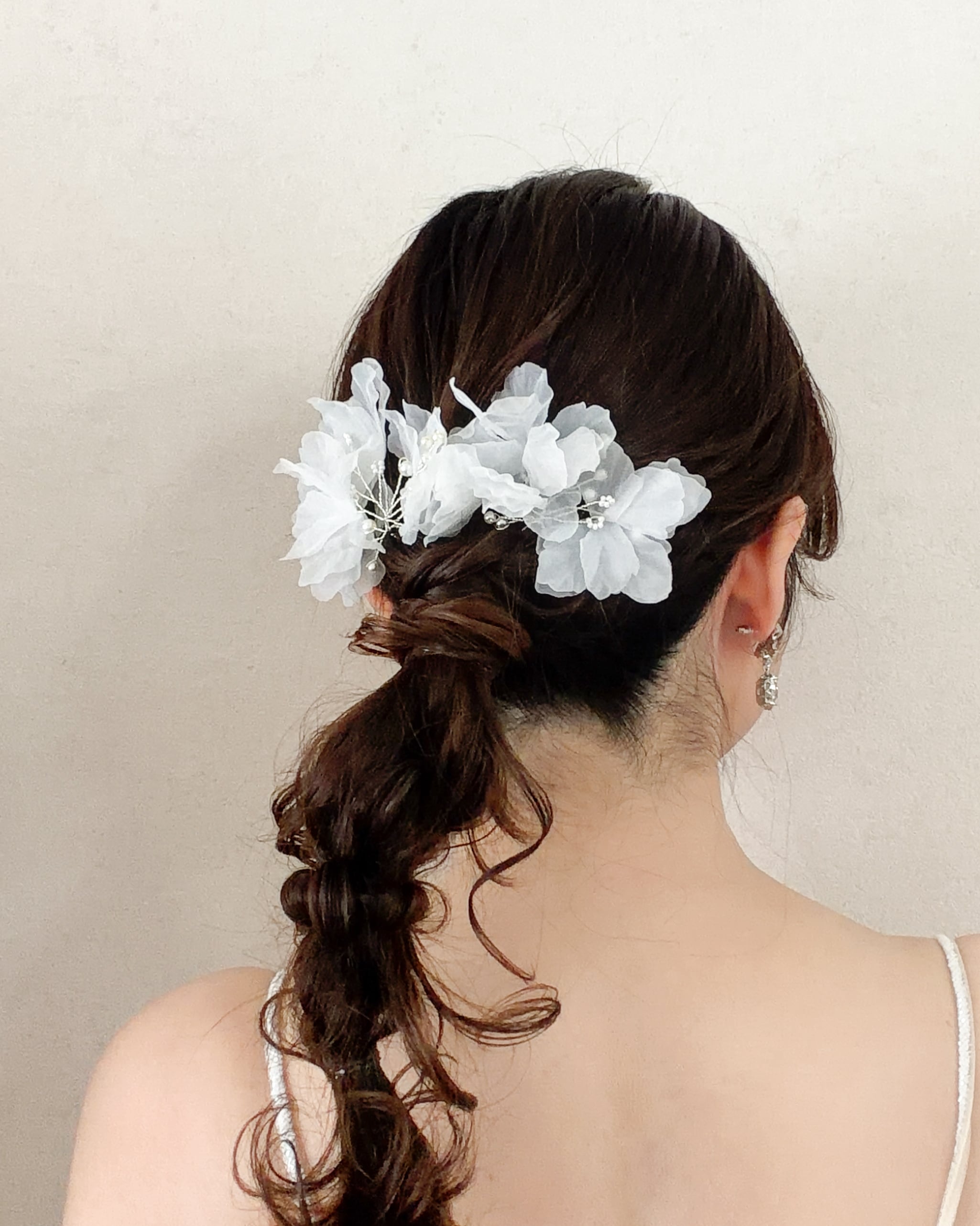 シニヨン・ハーフアップ・編みおろしなど、様々なヘアスタイルに自然に溶け込み、花嫁らしい柔らかな雰囲気を引き立てます。