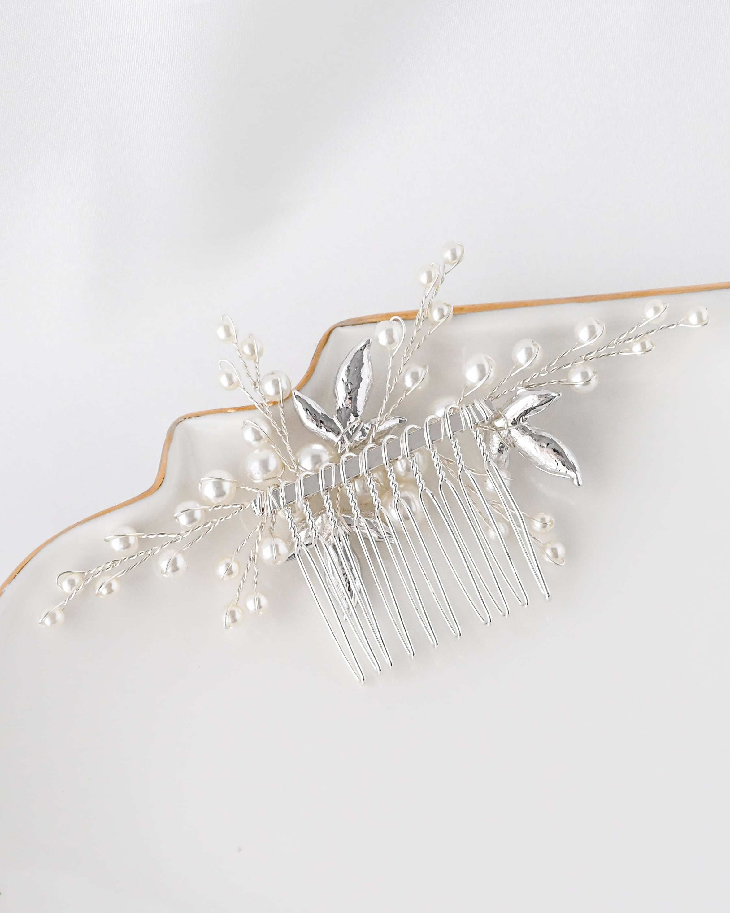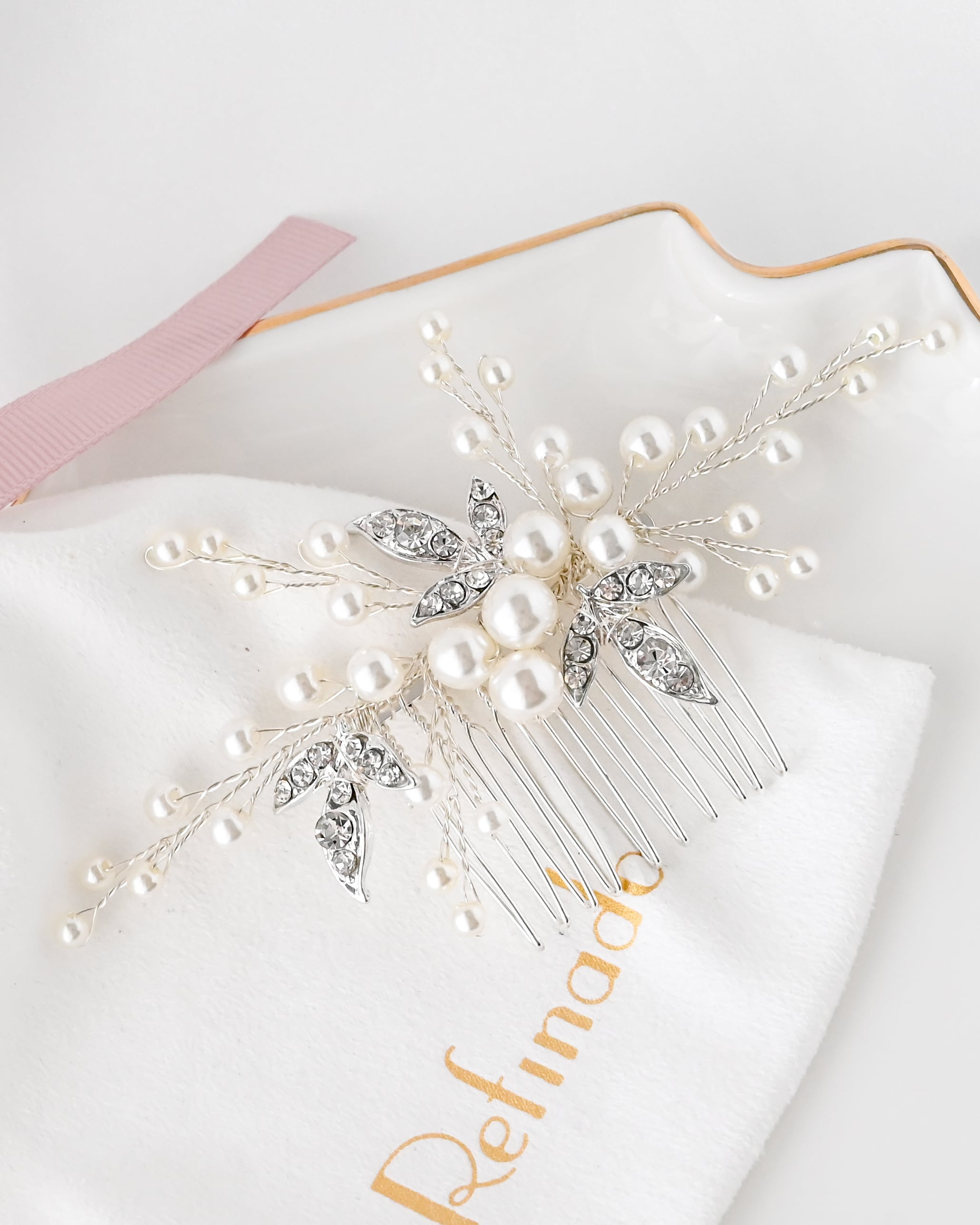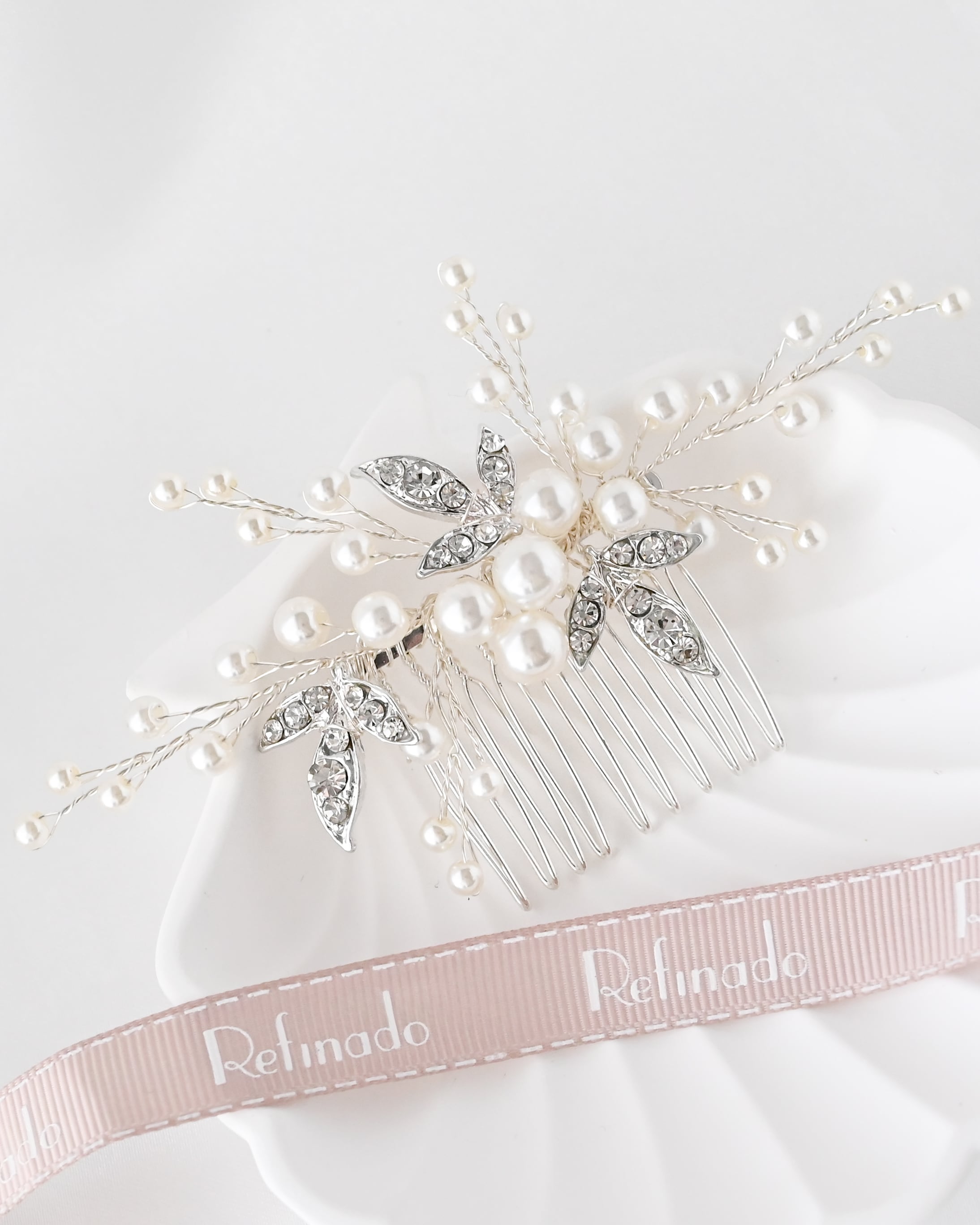上品なパールと繊細なビジューを贅沢にあしらった、華やかさと気品を兼ね備えたヘアコーム。