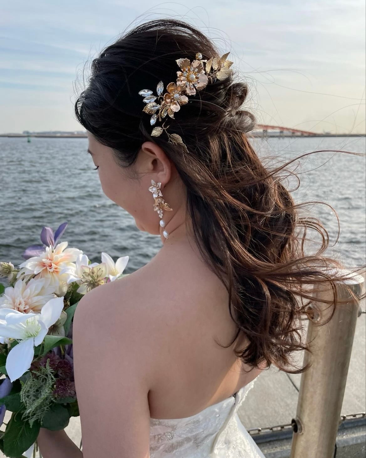 ゴールドの花びらにクリスタルをちりばめらきらびやかなヘッドドレス。