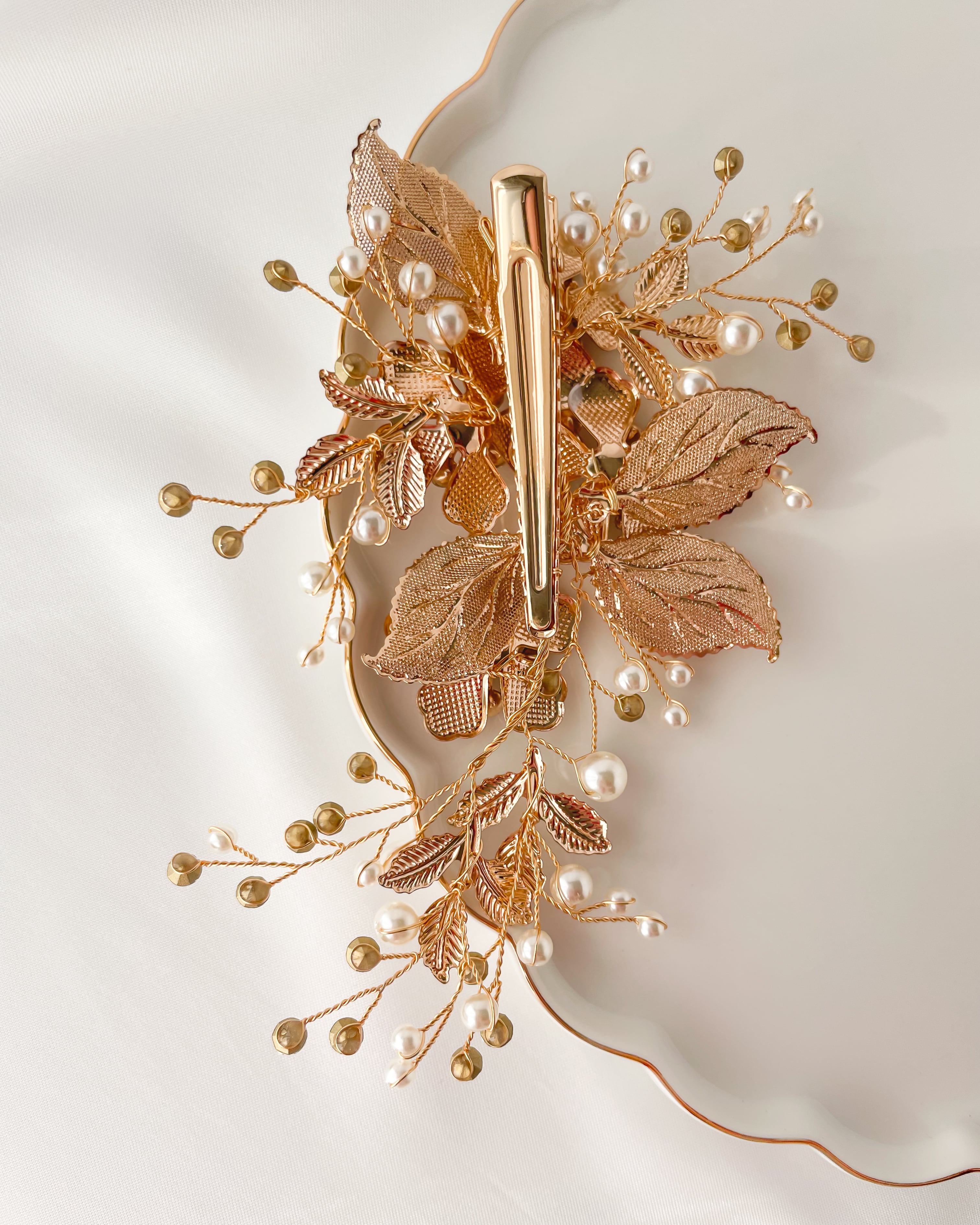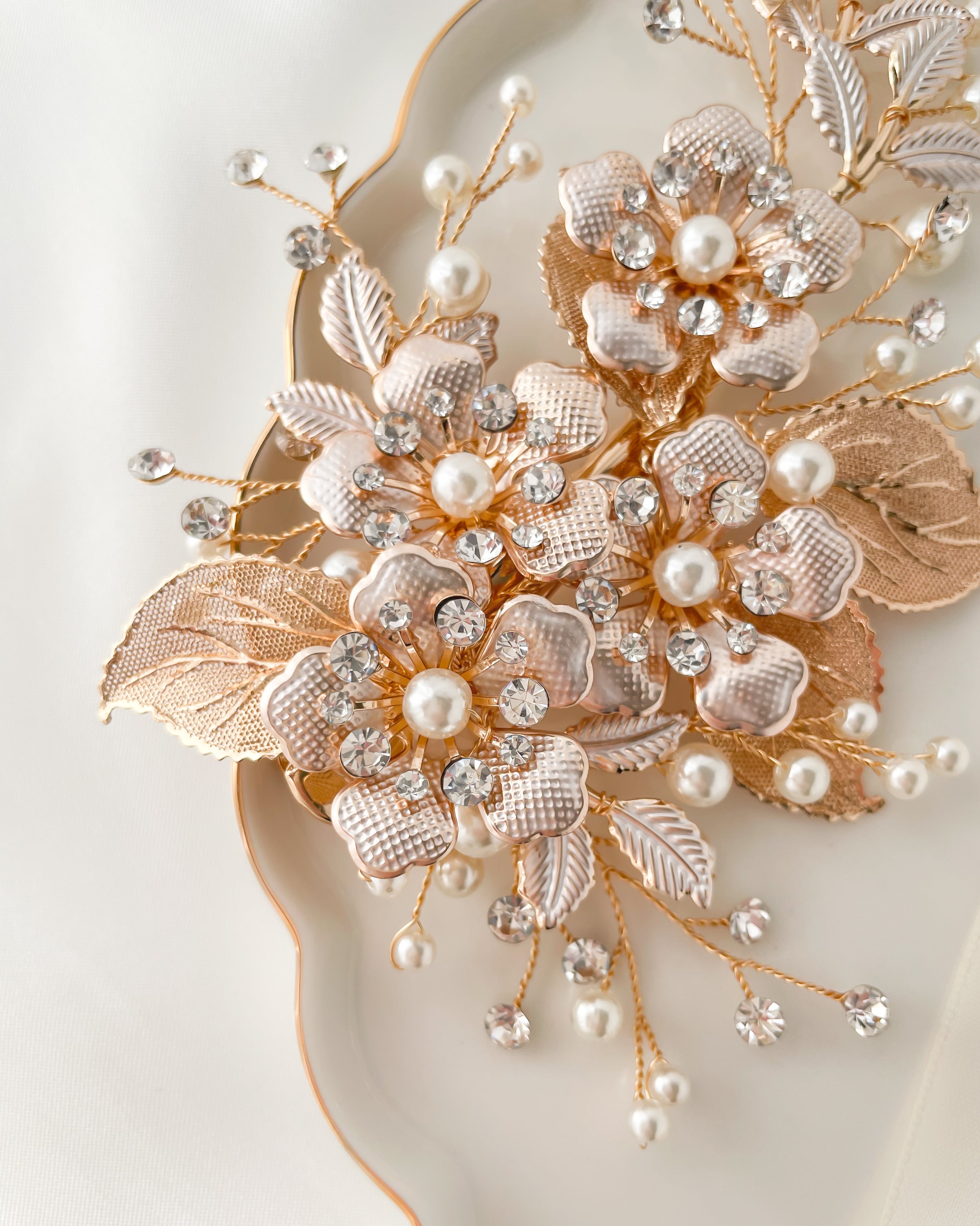 フラワーチャームの花芯にはクリスタルが散りばめられており、花嫁さまを一段と華やかにみせてくれます。