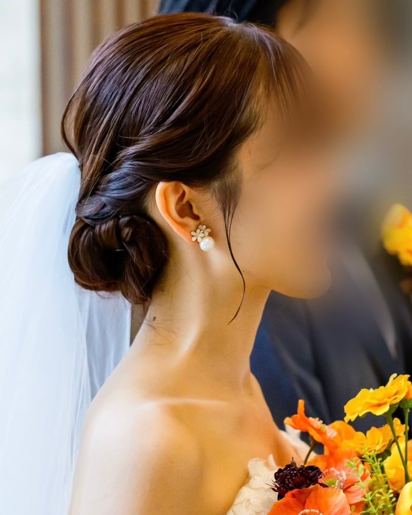 ジルコニアストーンの花びらがアクセントとなり、小ぶりながらも存在感を放ち、挙式や披露宴で幅広くご着用いただけます。