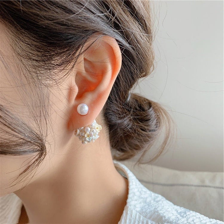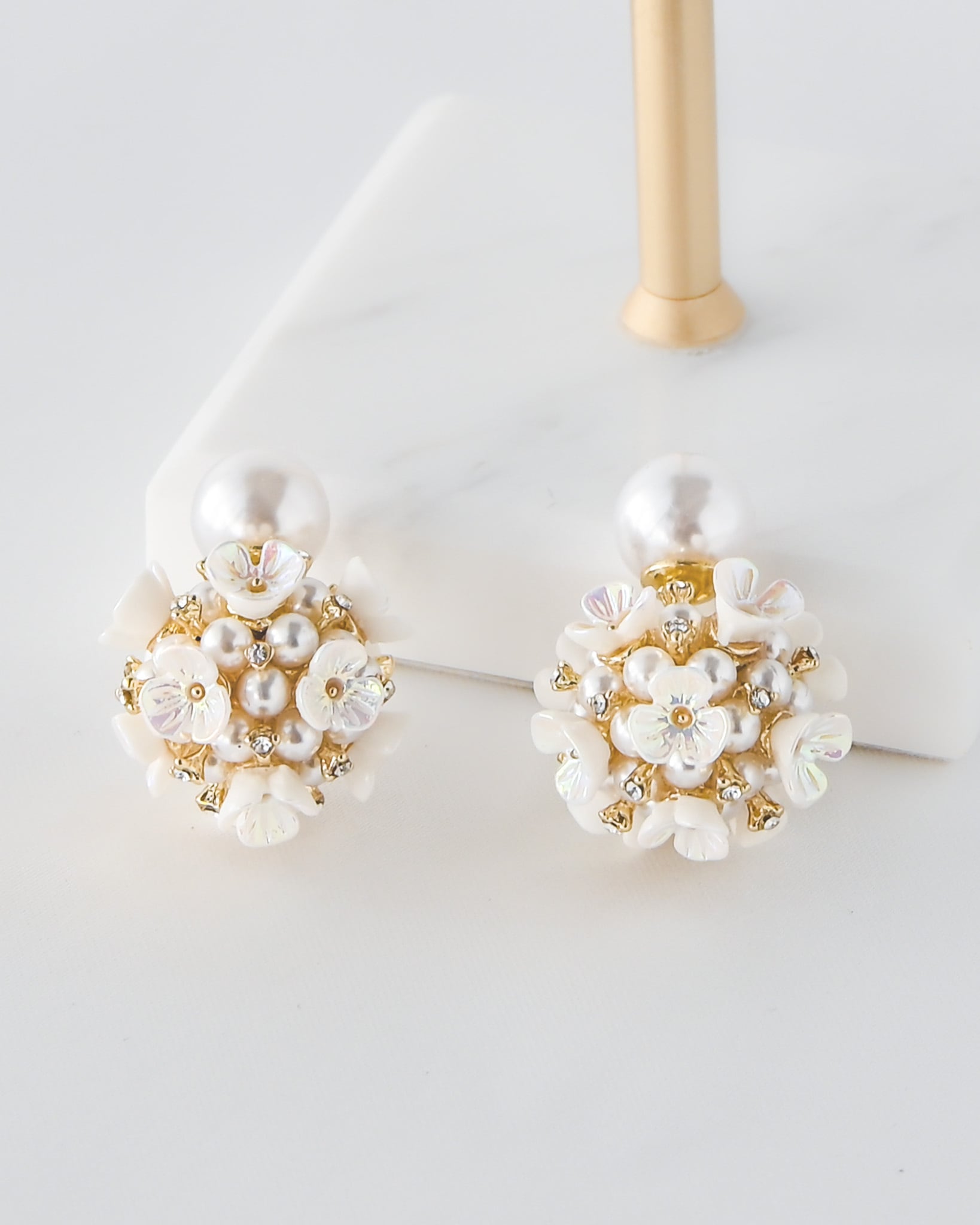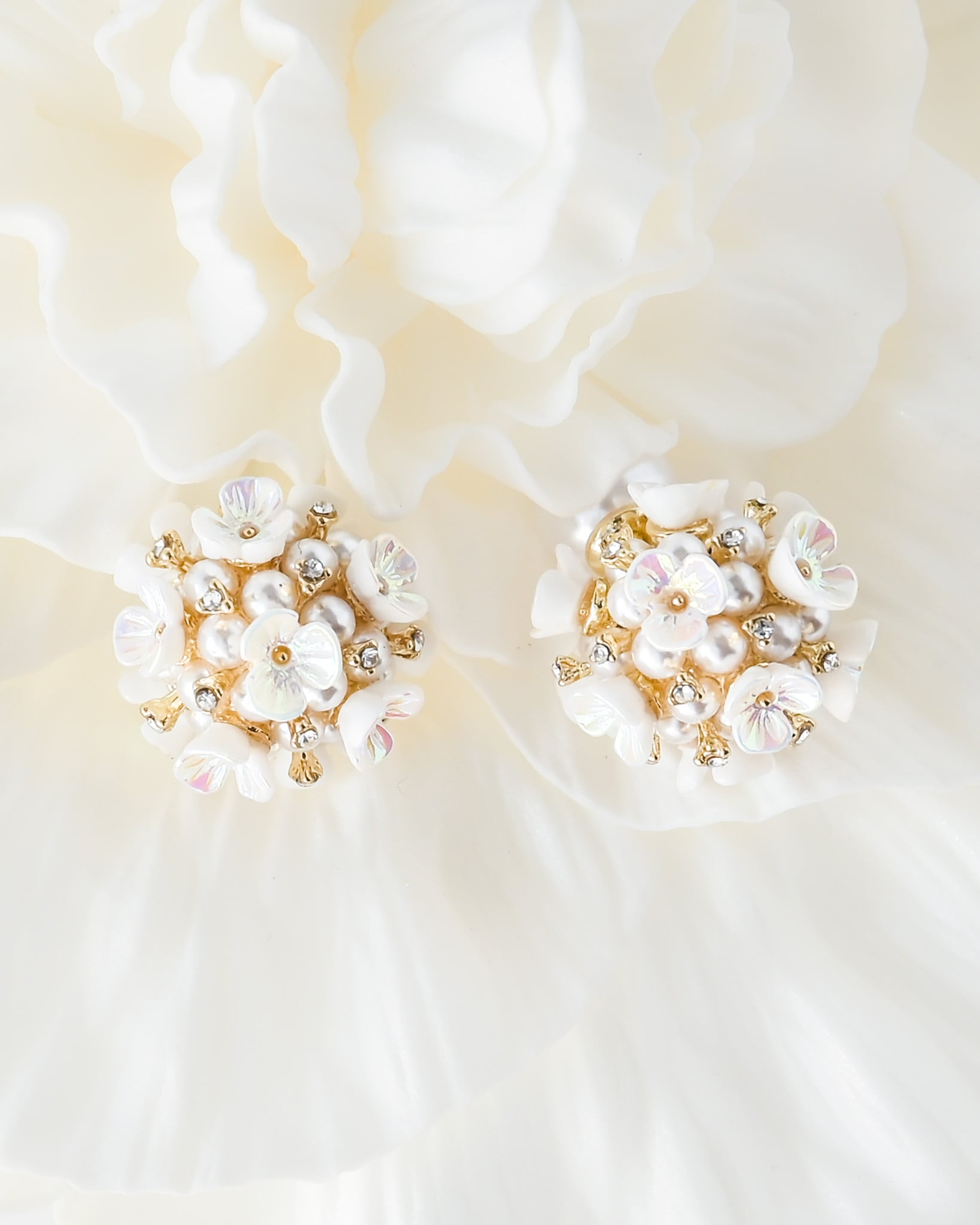 光沢感のあるシェルフラワーとパールやクリスタルなどを組み合わせてできたフェミニンなデザインのピアス。