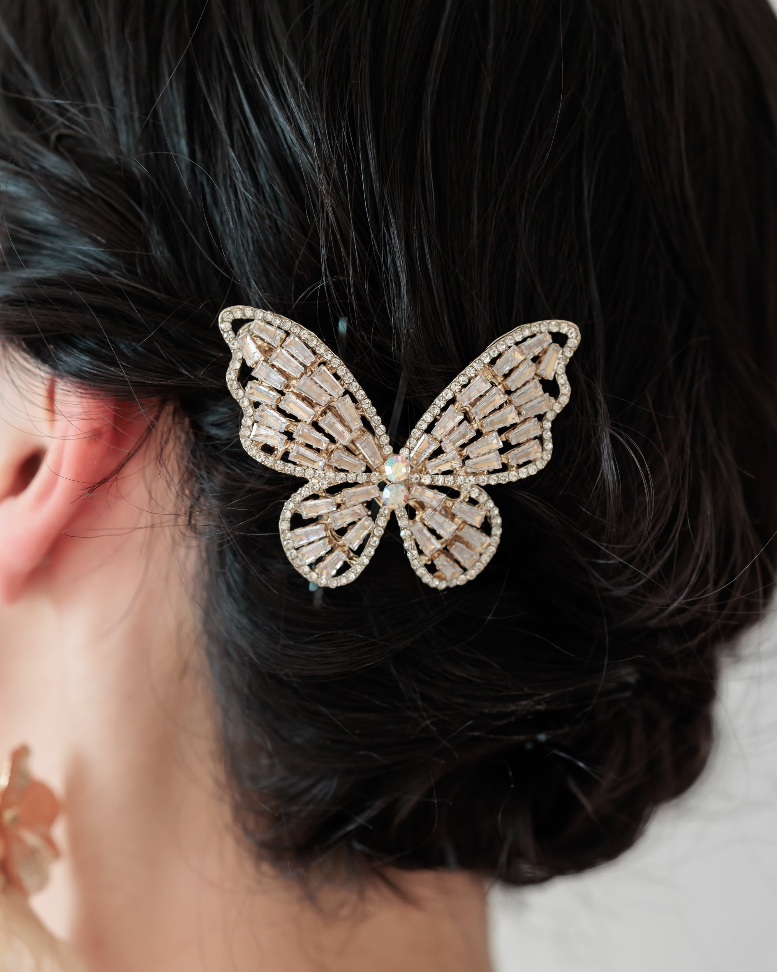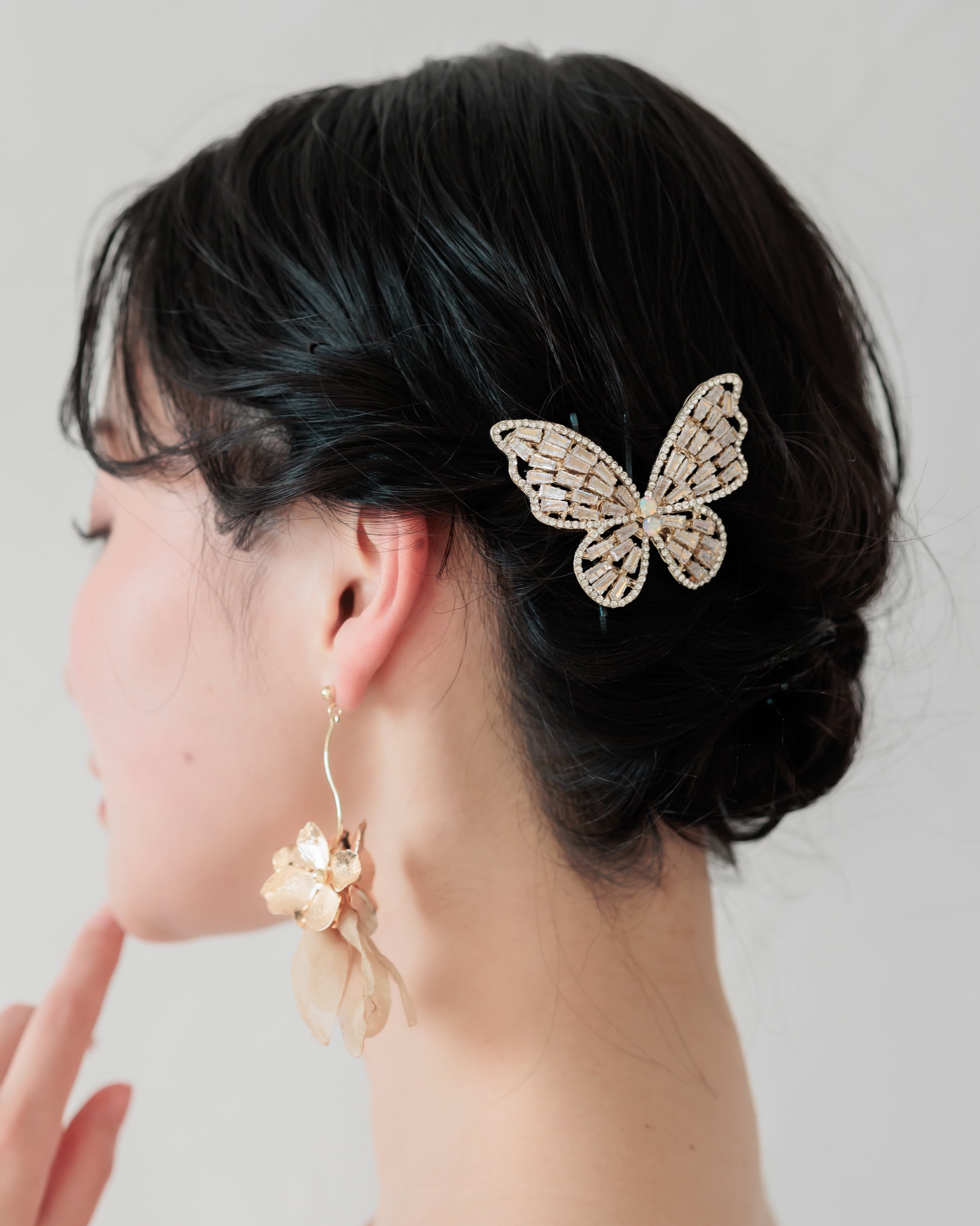幸福のシンボルともされるバラフライをチーフにしたバレッタはダウンヘアからシニヨンまで幅広いヘアスタイルに華を添えてくれます。