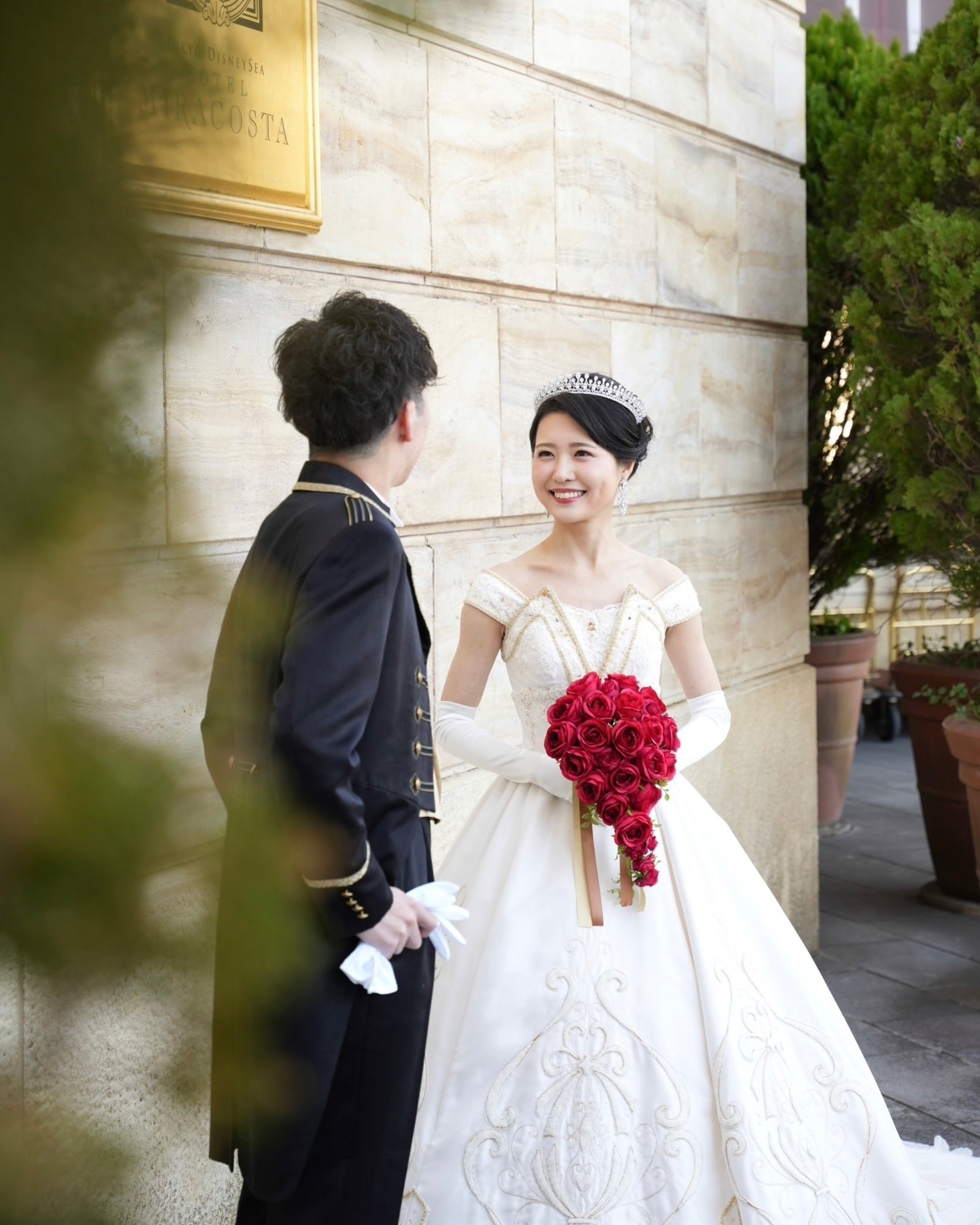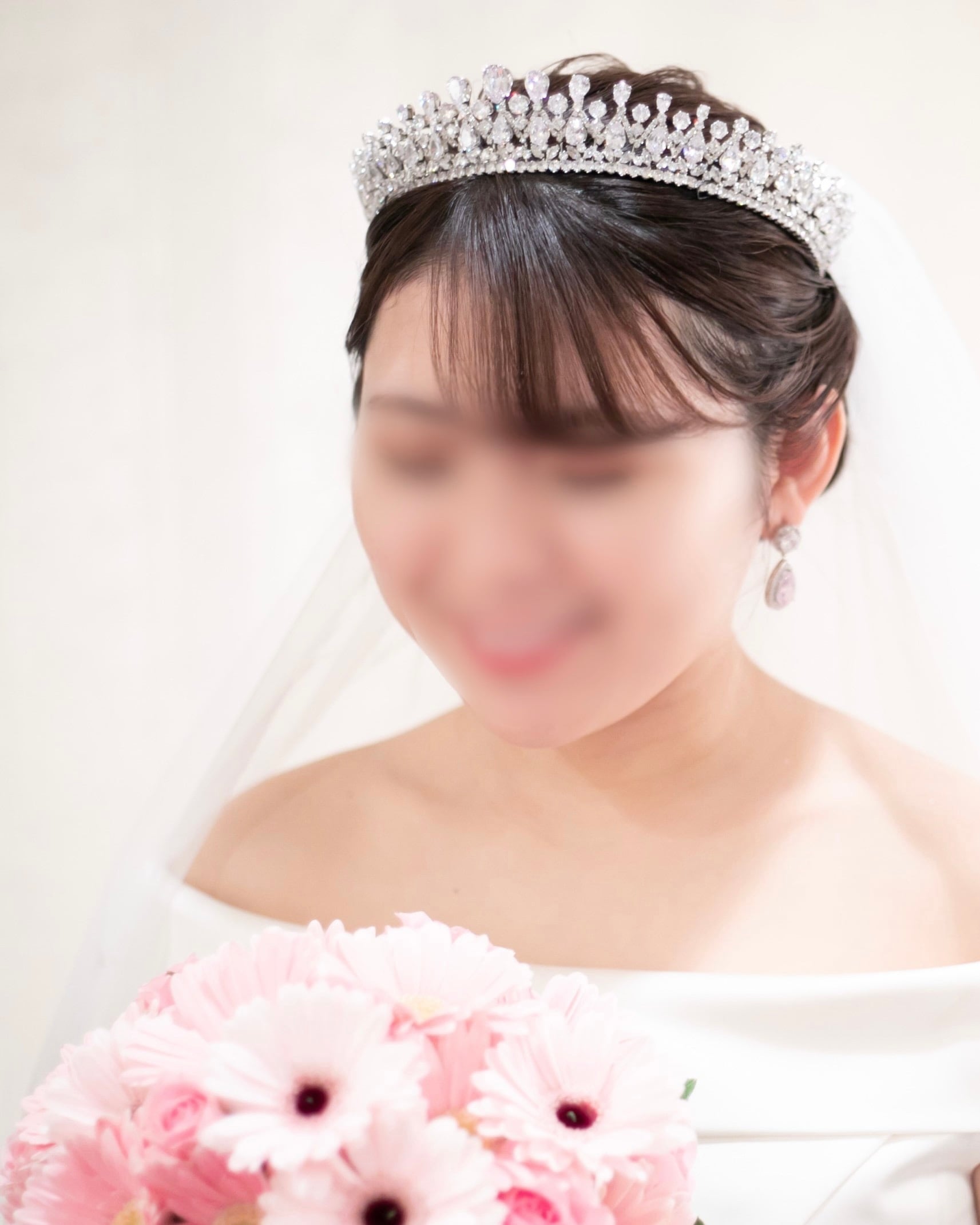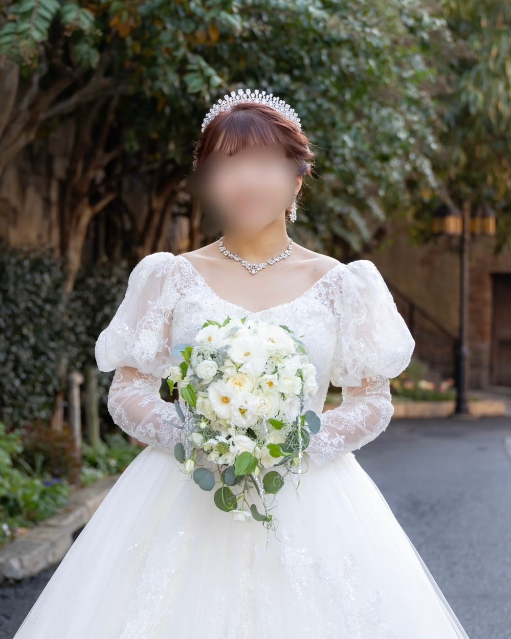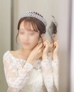 まるで本物のダイヤモンドのように光り輝き、正面だけでなくサイドやバック姿も美しく映えます。リッチで特別感溢れるデザインはロイヤルウェディングなど、華やかなブライダルスタイルを理想とする花嫁におすすめです。