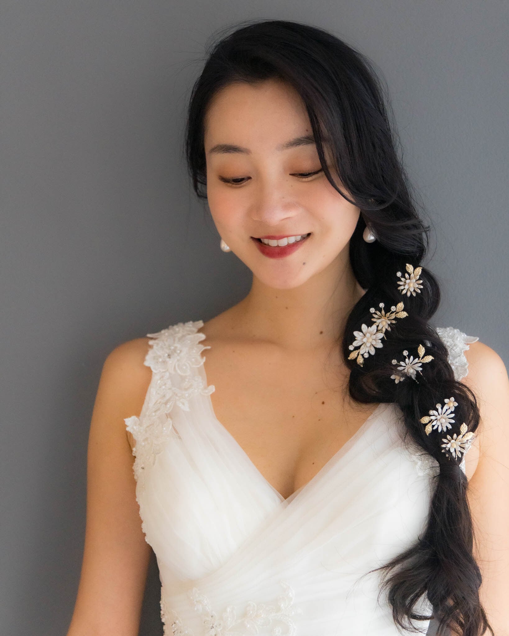 白いお花の周りにはゴールドのリーフやクリスタルが散りばめられ、清楚ながら華やかな雰囲気を演出。