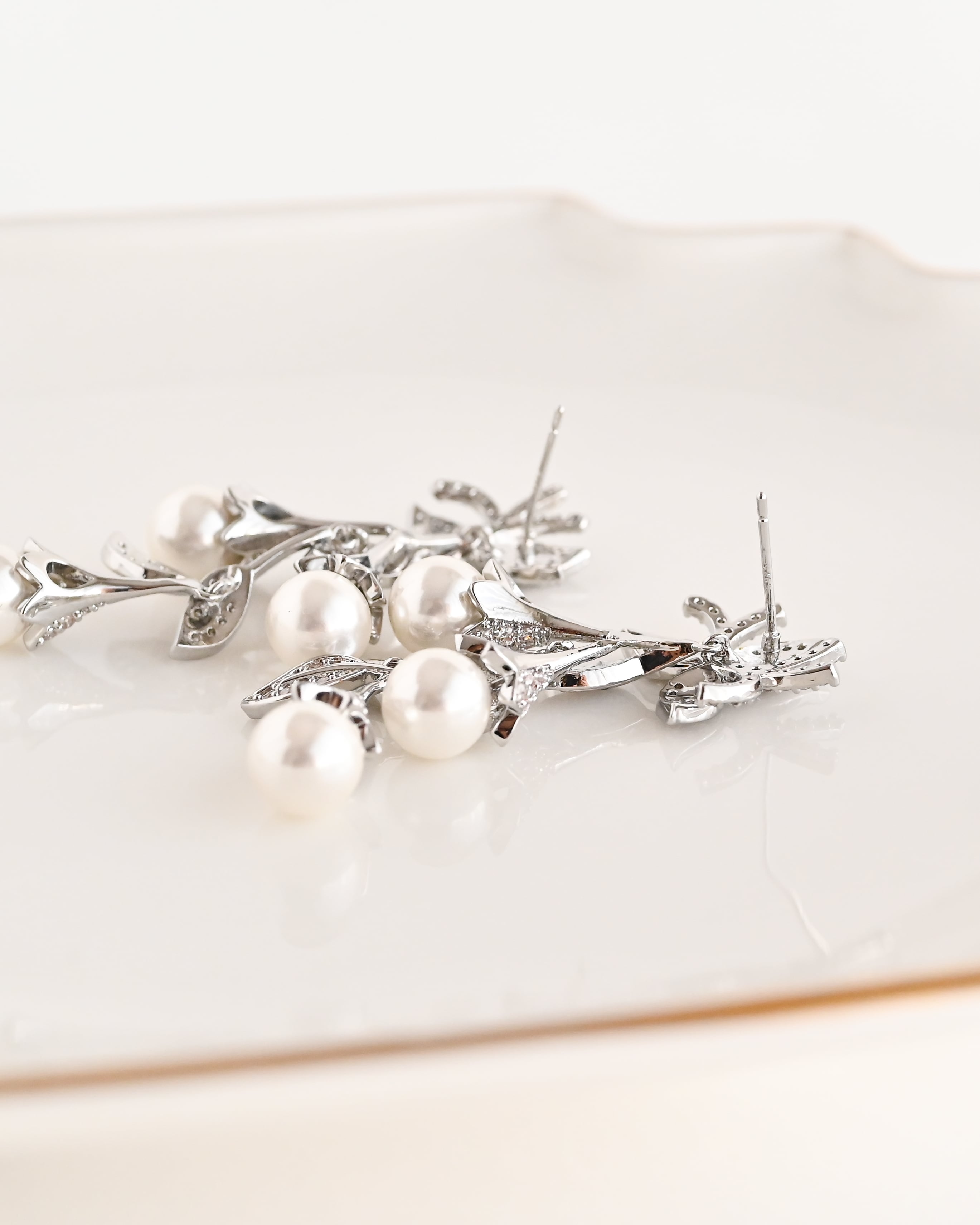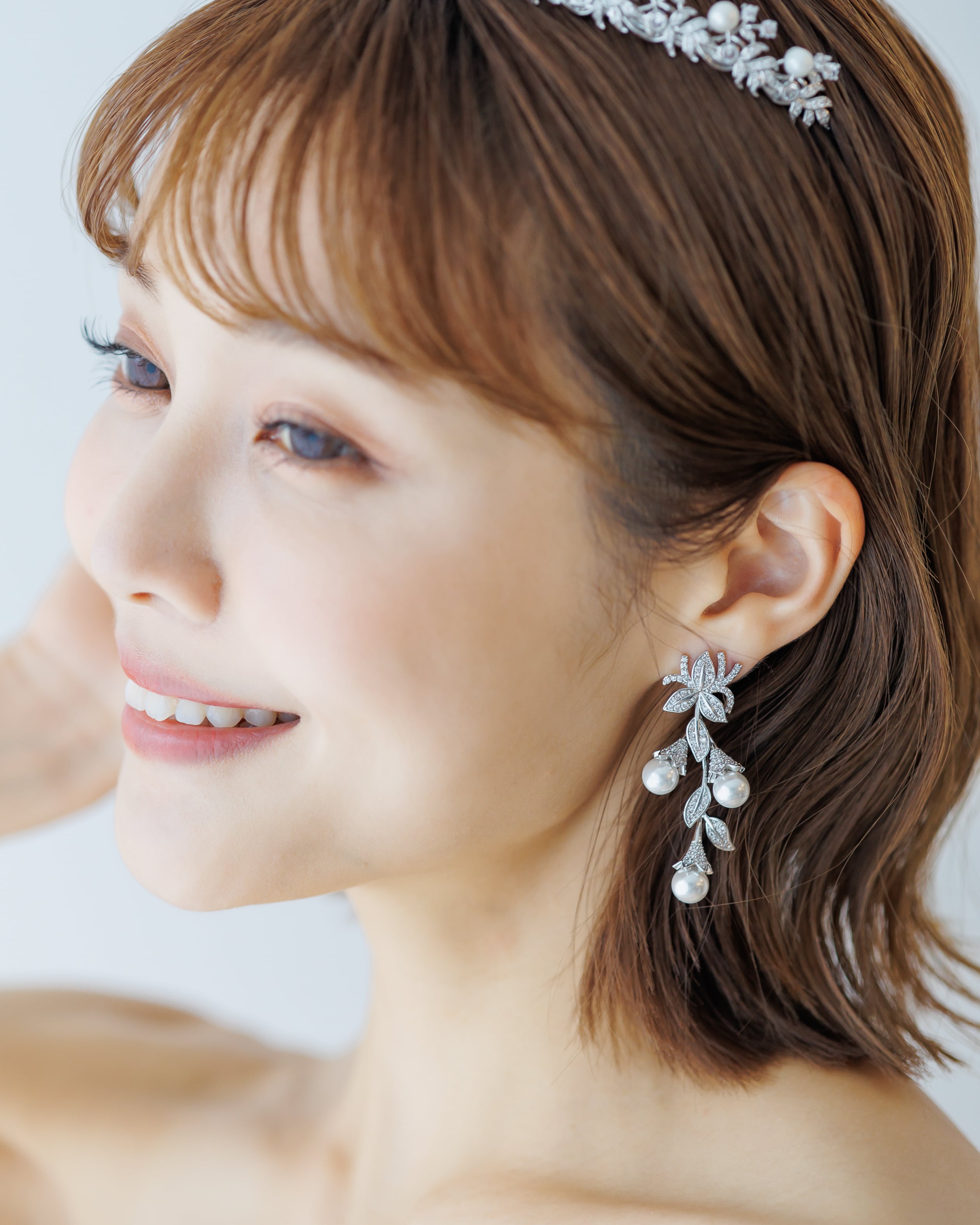 ジルコニアストーンを敷き詰めたリーフチャームにパールの蕾がエレガントさをプラスし、特別感のあるピアス。
