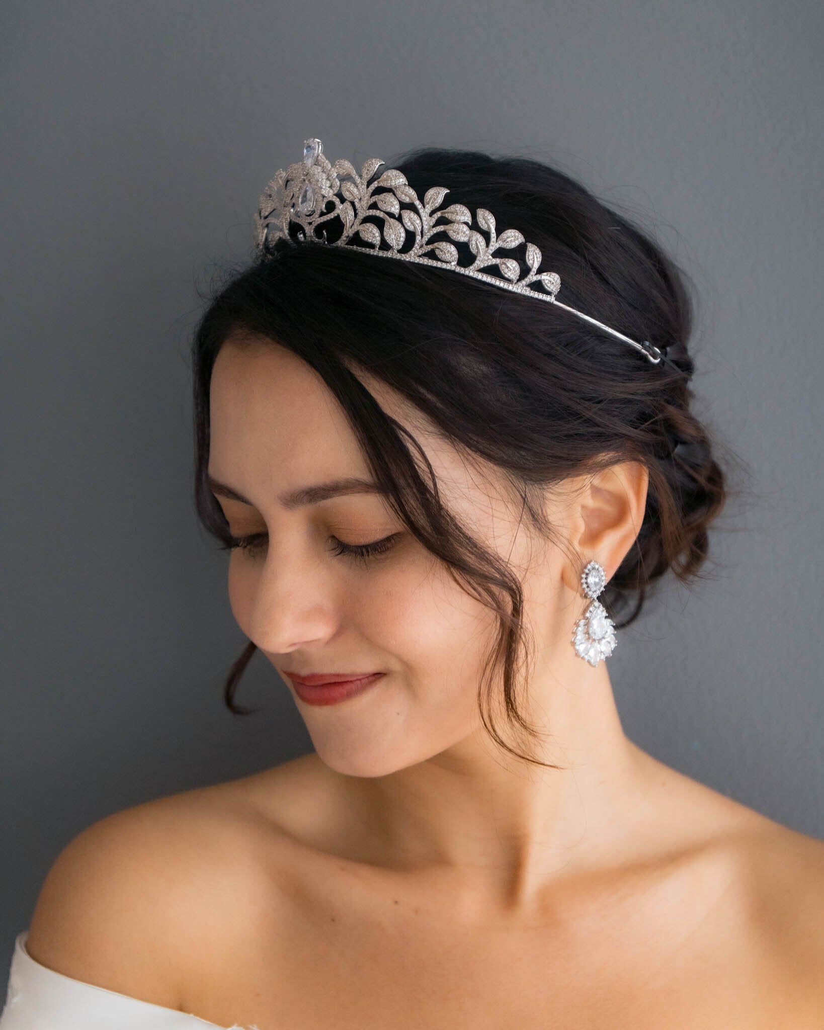 中央に輝くペアシェイプストーンを包むように広がるリーフのデザインがまるでギリシャ神話の女神をイメージさせ、壮大ながら温かみある優美で気品溢れるティアラ。