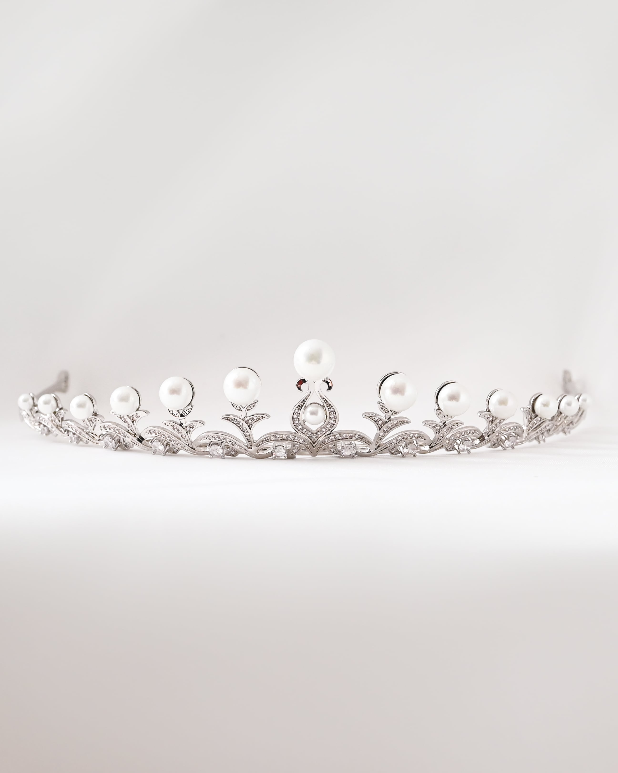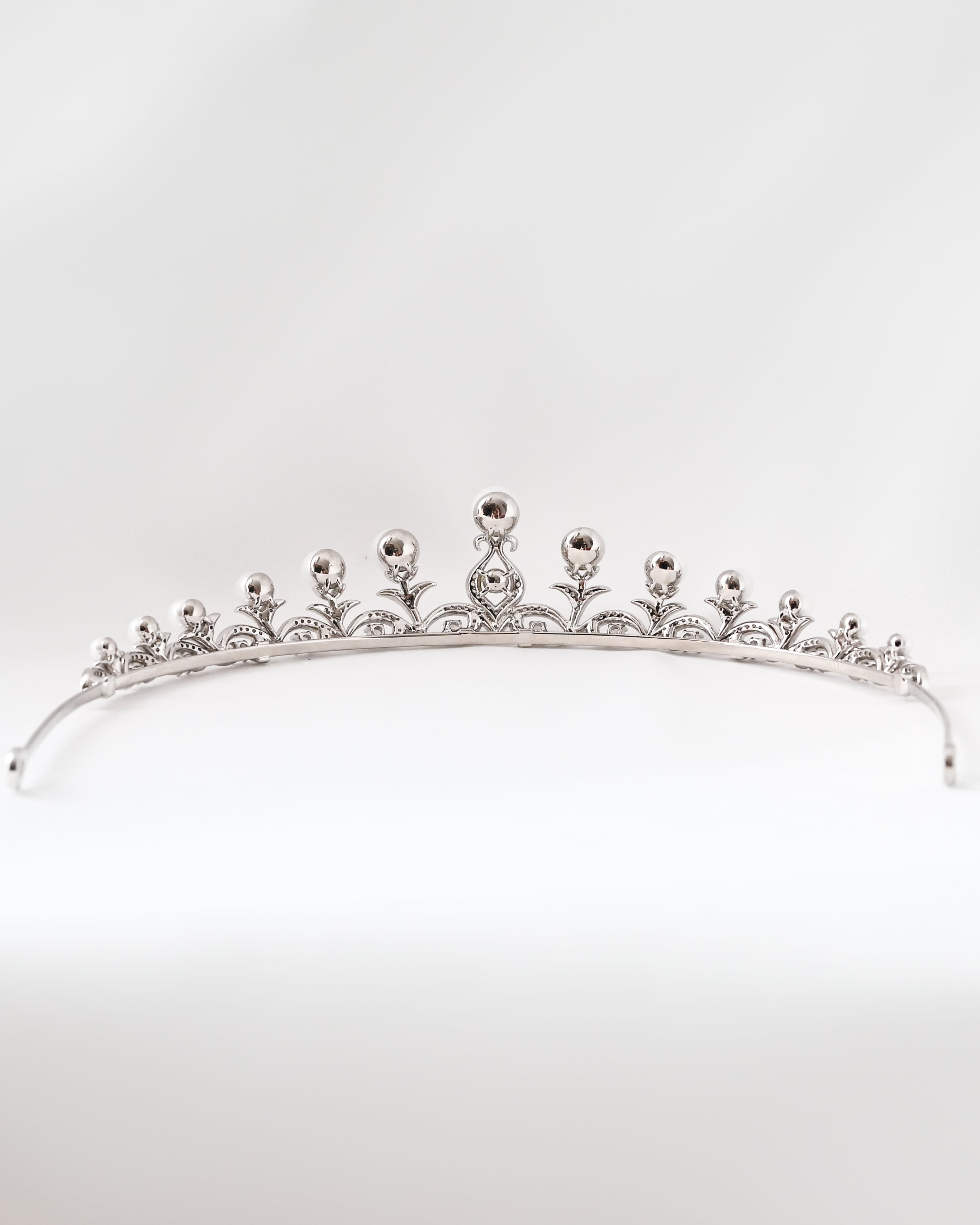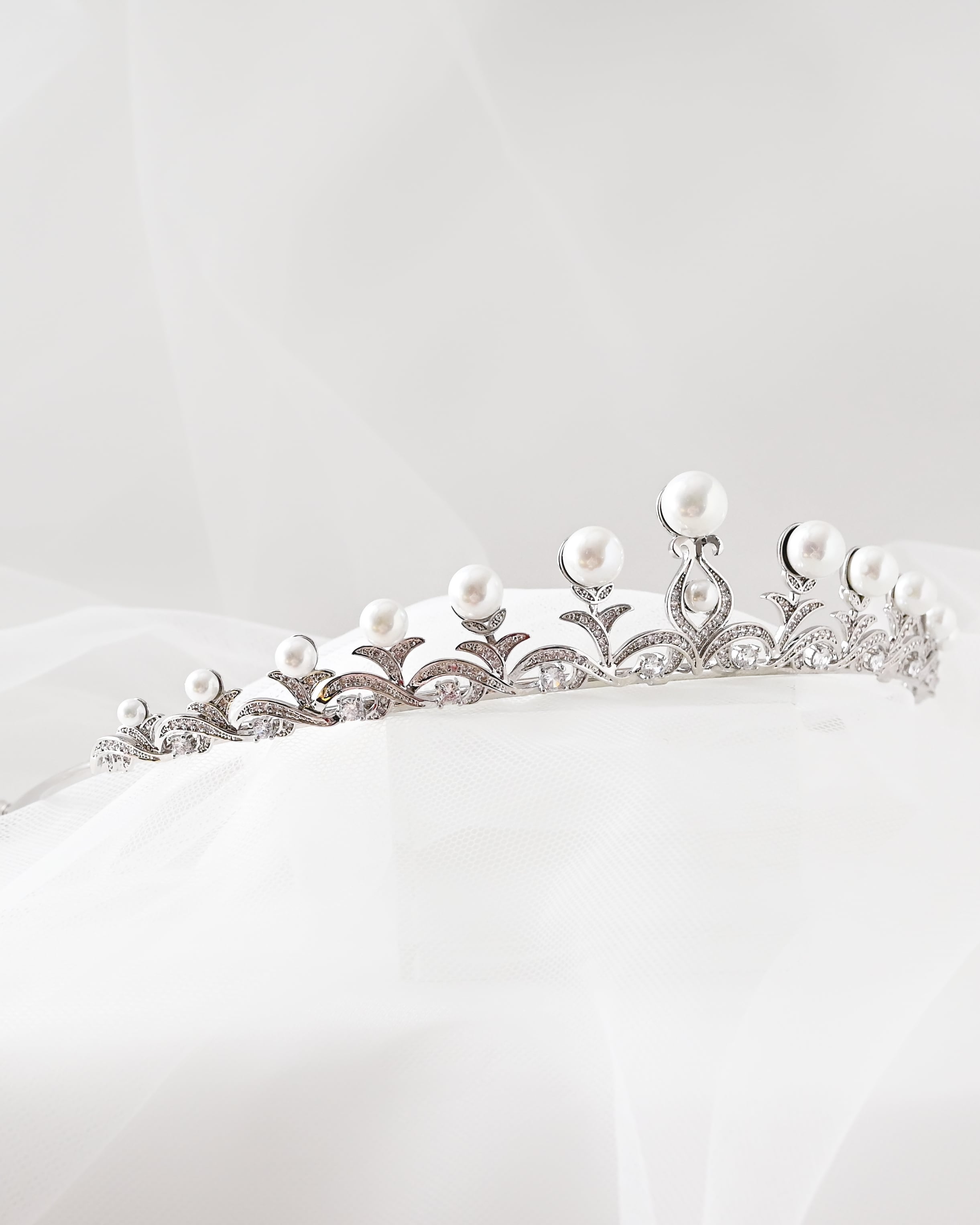 パールをお花に見立てた遊び心感じさせるエレガントさと愛らしさを兼ね揃えたティアラ。
