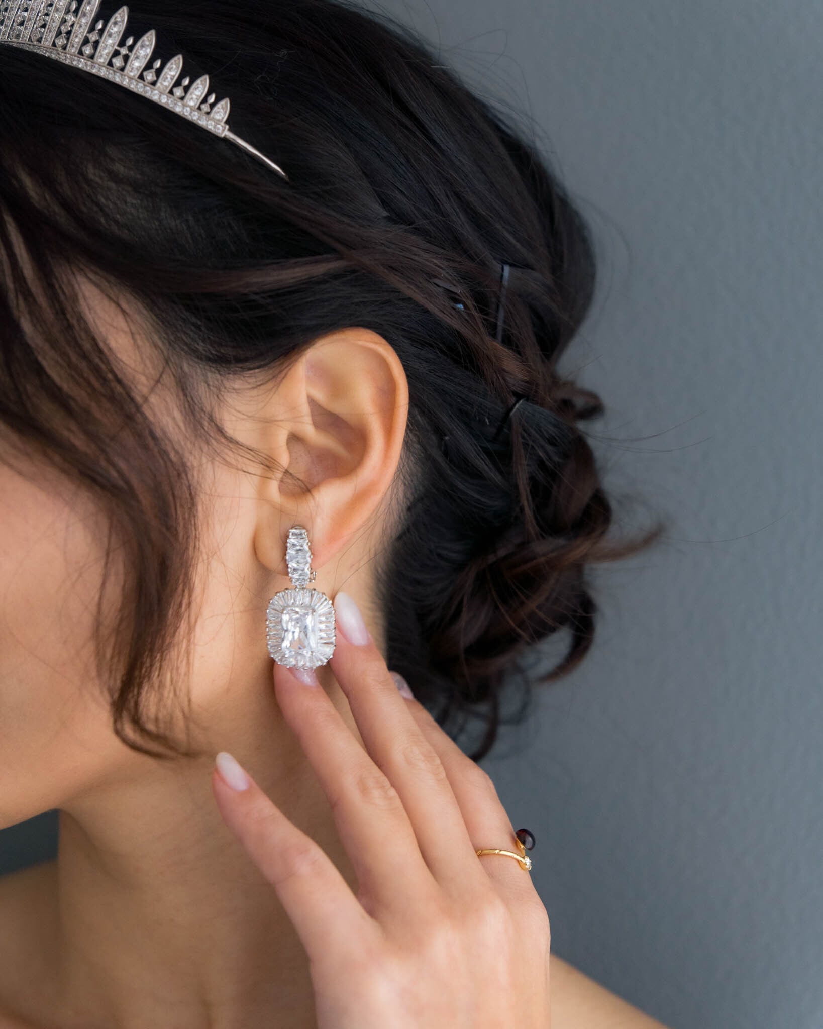 大きなエメラルドカットの周りをさらにバケットカットのジルコニアストーンを1周させたゴージャスなピアス/イヤリング。