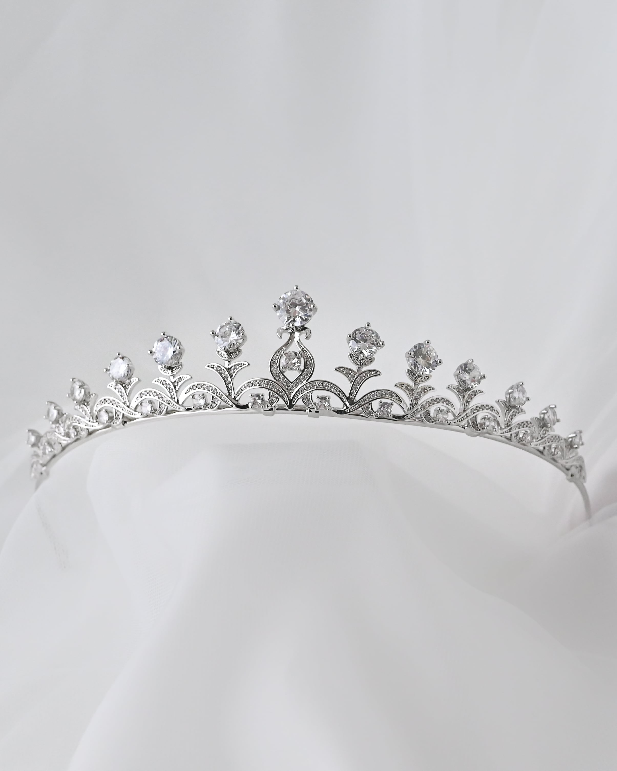 ころんとしたラウンドストーンのお花にがこちらを向いて微笑んでいるようなチャーミングなデザインが心躍らせる愛らしいティアラ。
