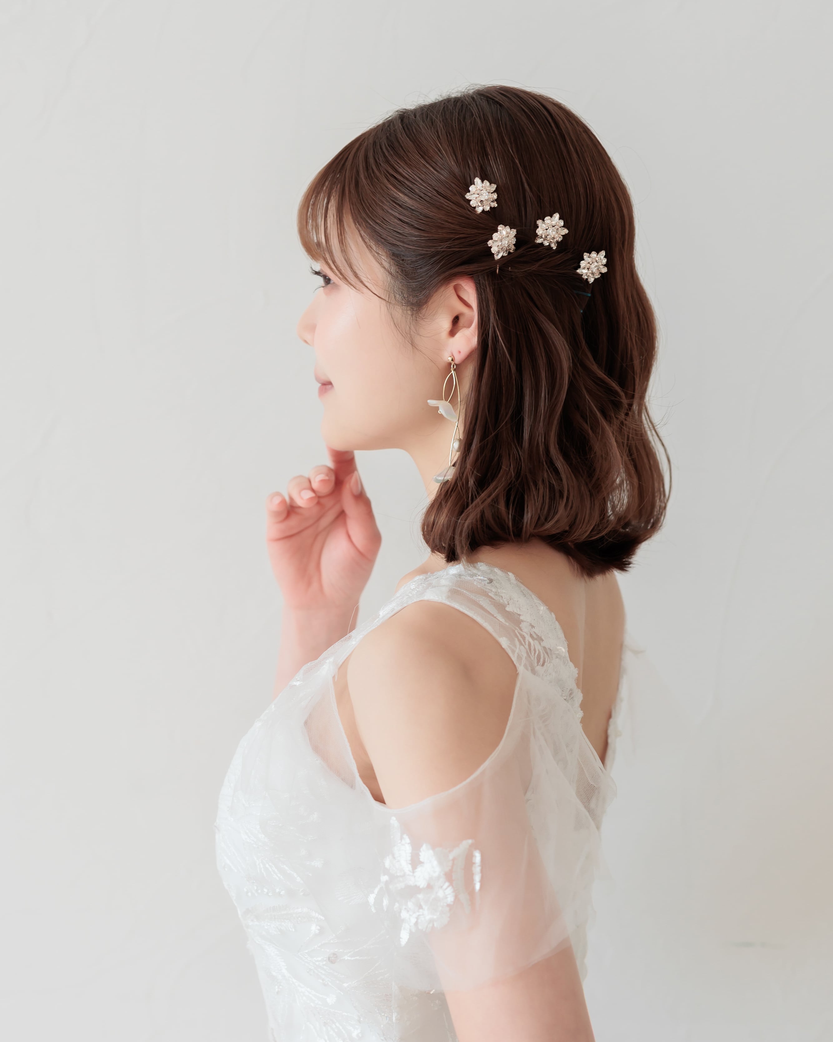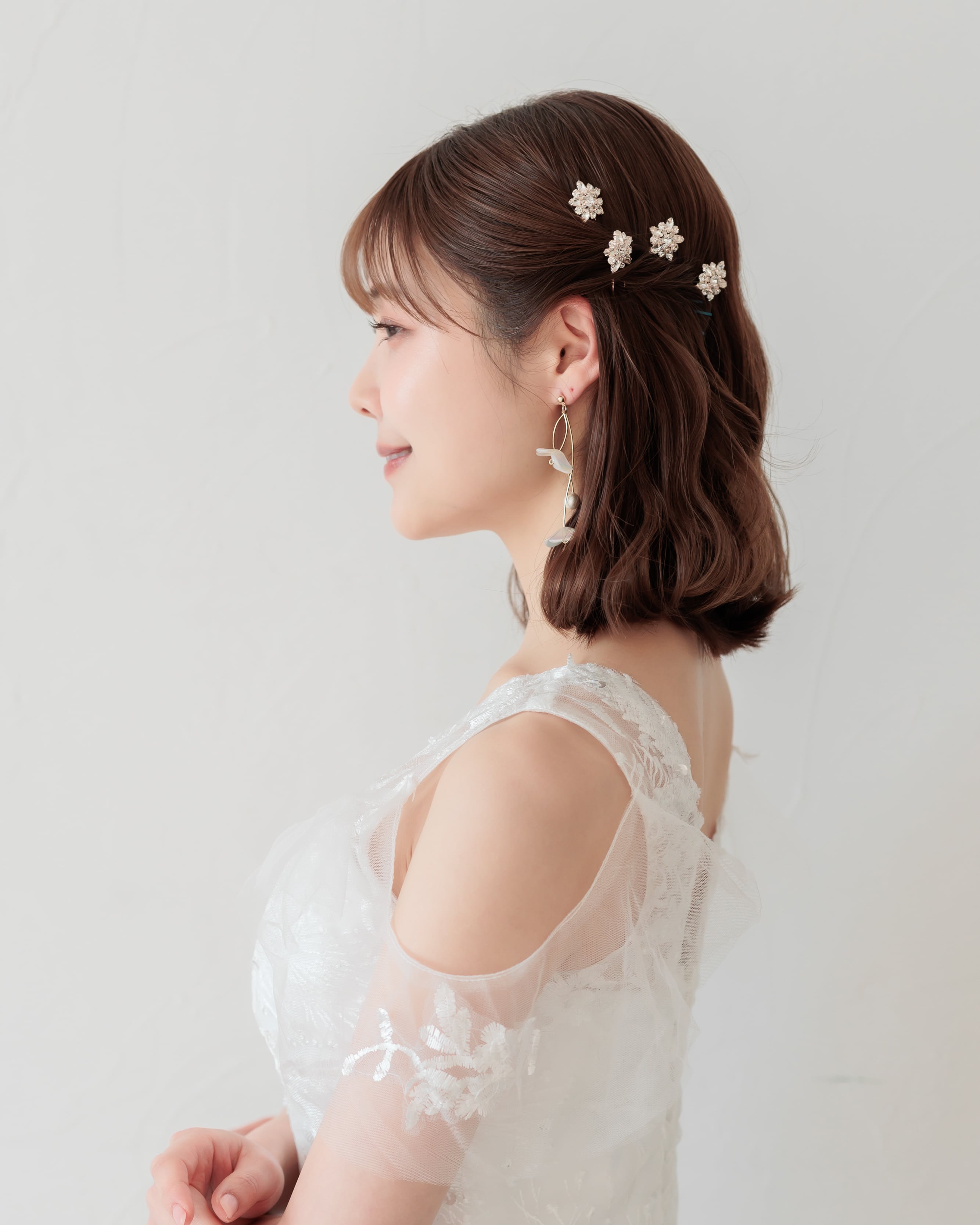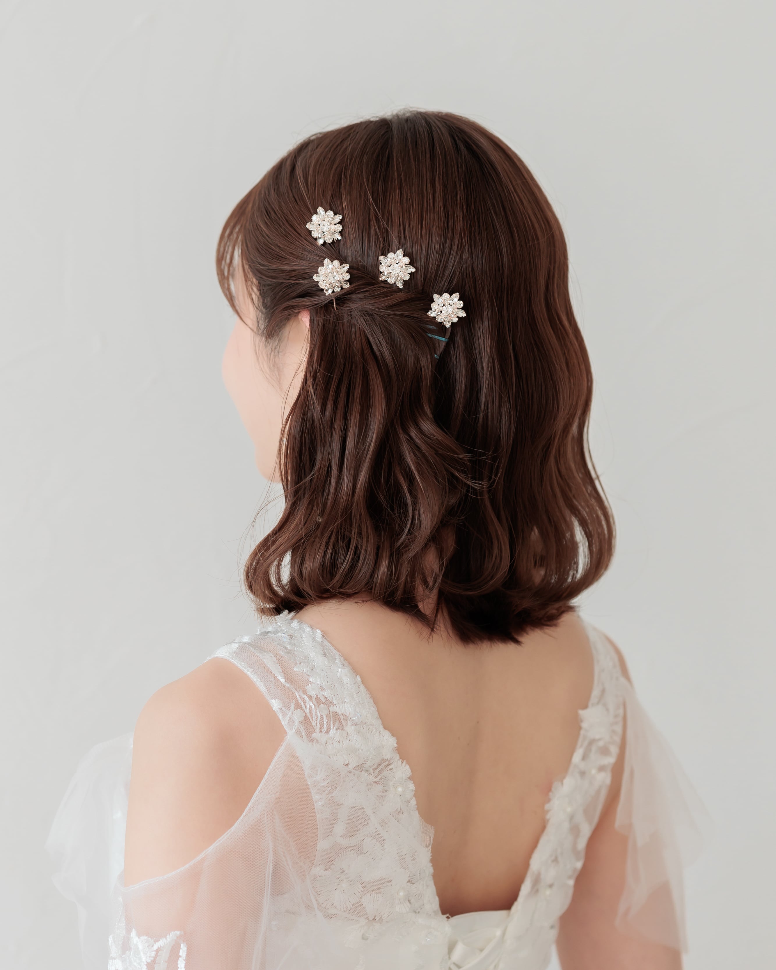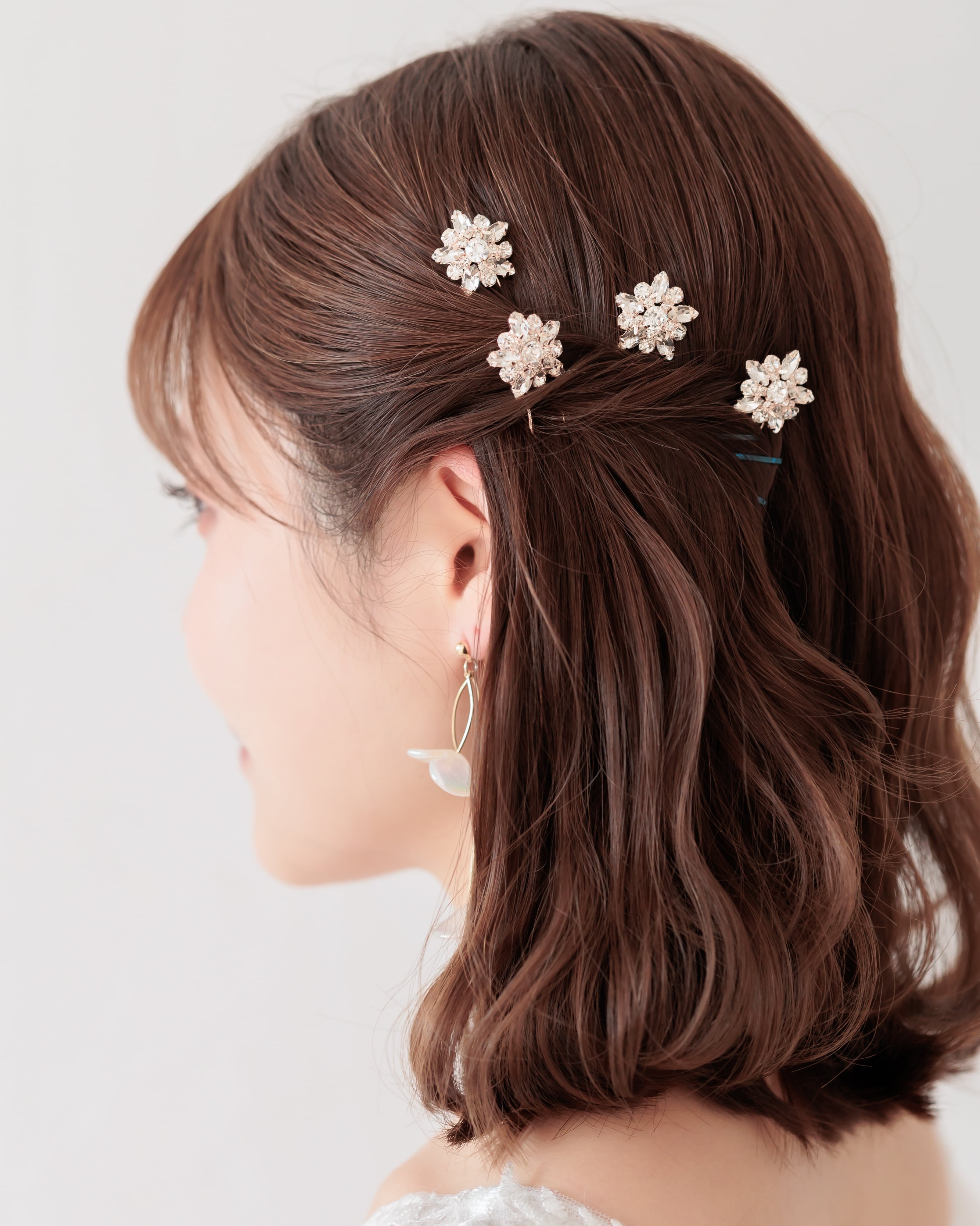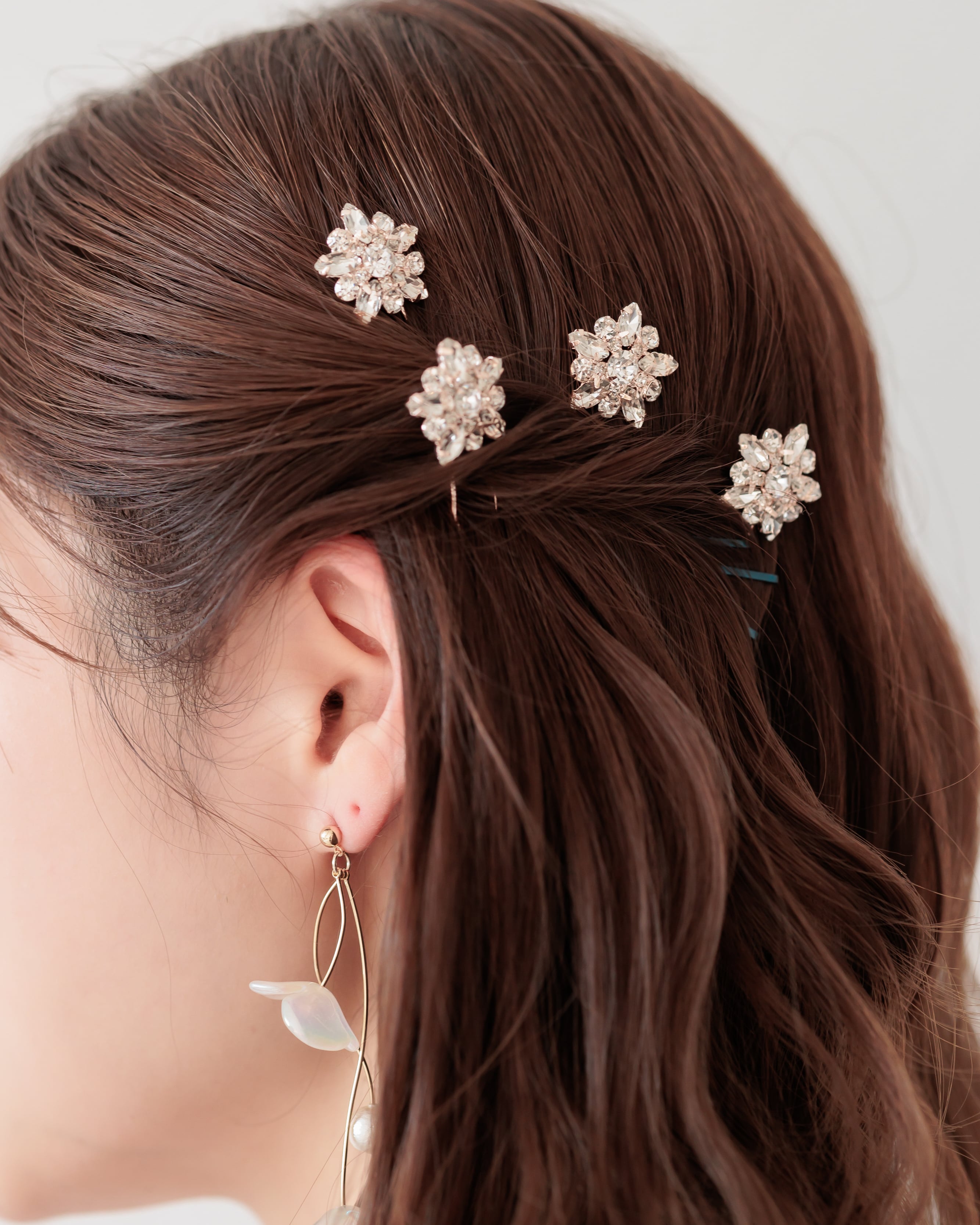 程よいサイズ感でキラキラと輝く華やかデザインは、パールピンや他のヘアアクセサリーとも合わせやすく、理想のスタイルに合わせて自由にアレンジいただける優秀なアイテムです。