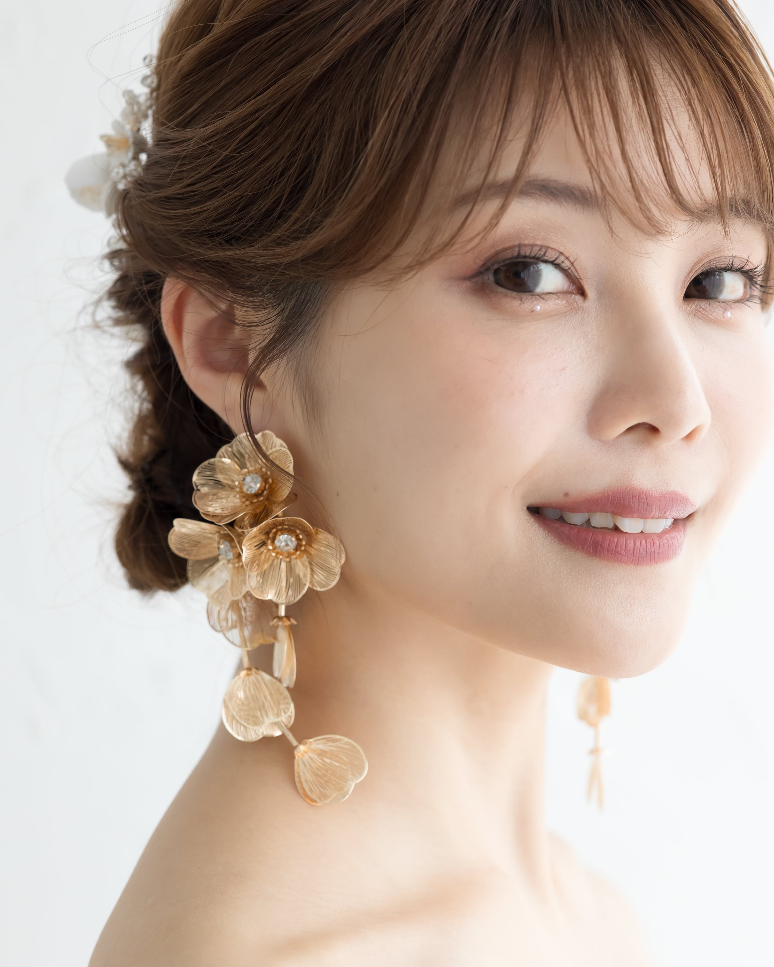 存在感ある立体的なフラワーチャームにクリスタルの花芯がアクセントとなり、華やかなデザインに透かし加工を施した花びらが程よく抜け感をプラスし、インパクトあるサイズ感でありながらも軽やかでスッキリとした印象のブライダルピアス。