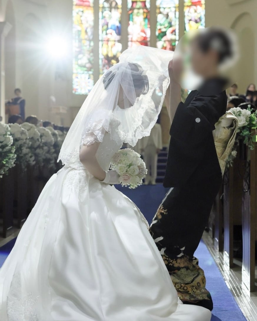 繊細なレースを施したショート丈のウェディングベール