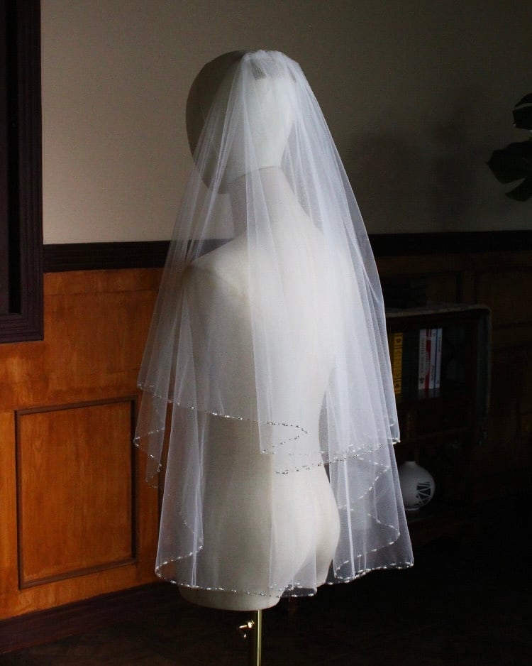 裾にあしらったビーズとパールがアクセントのクラシカルなウェディングベール。