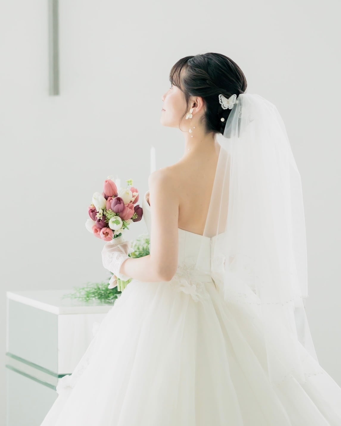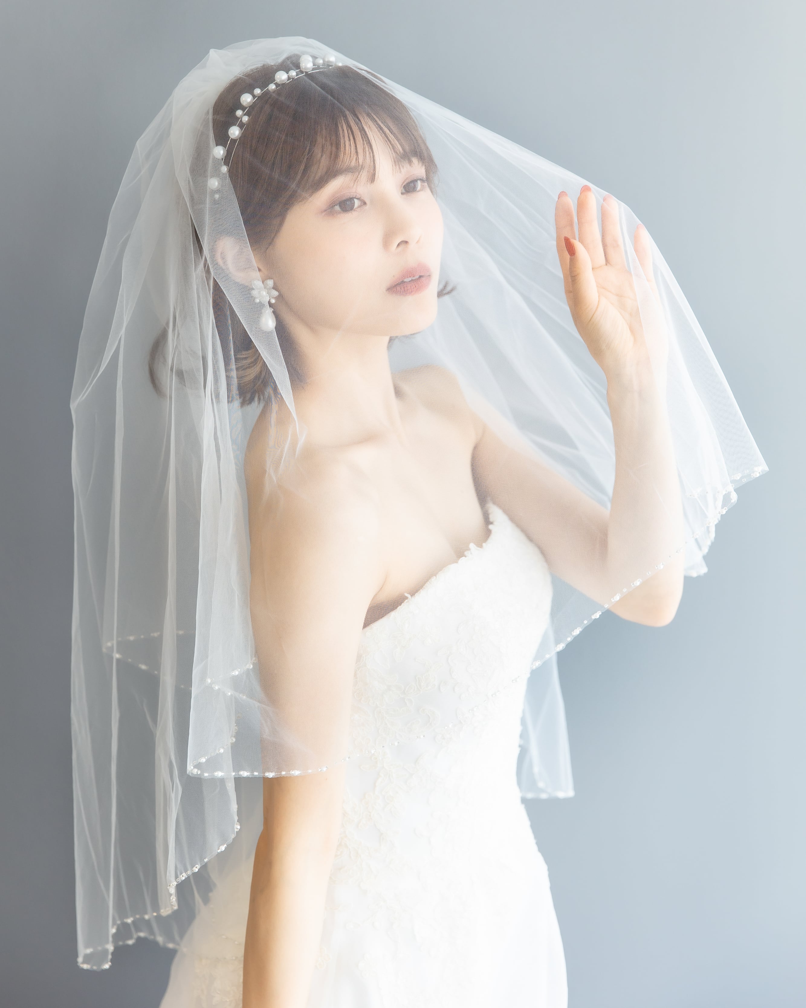 ミディアムな長さで格式高い教会からカジュアルなパーティーウェディングまでどんなシチュエーションにもなじみ幅広く活躍してくれます。