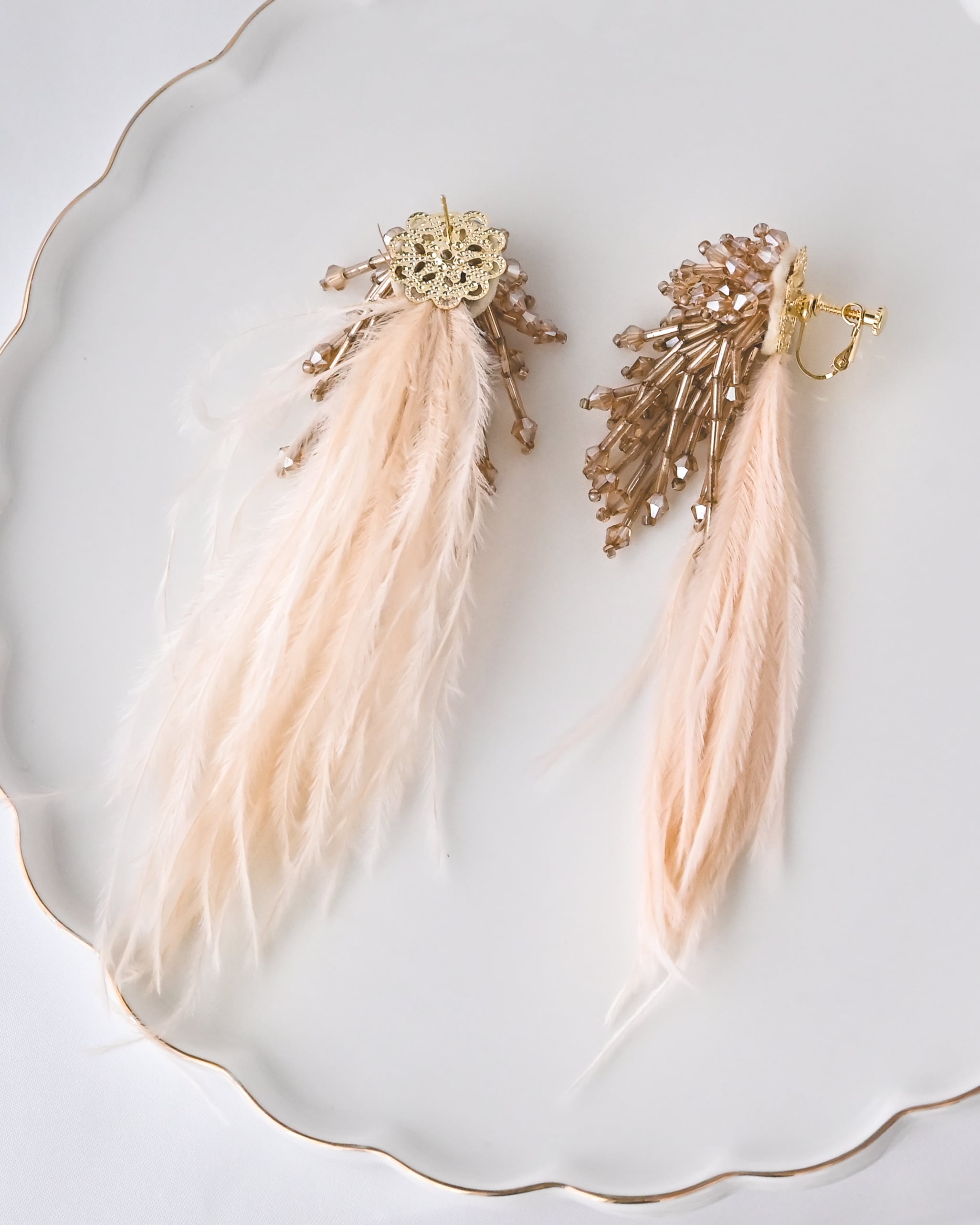 華やかなビーズのタッセルと軽やかで抜け感ある羽毛を組み合わせが優美でモードなブライダルピアス。