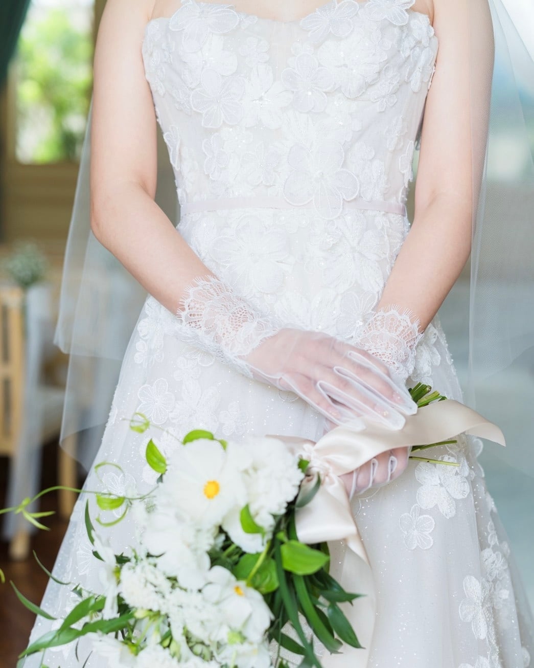 透明感あるオーガンジーに繊細なレースを施したエレガント雰囲気のショートグローブ。