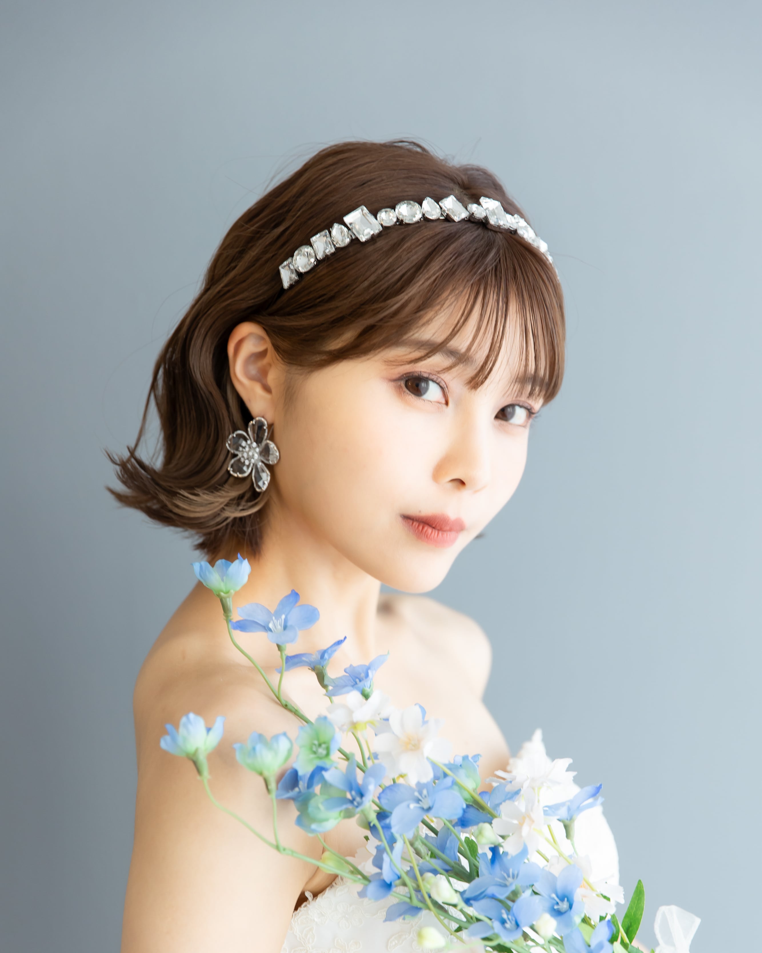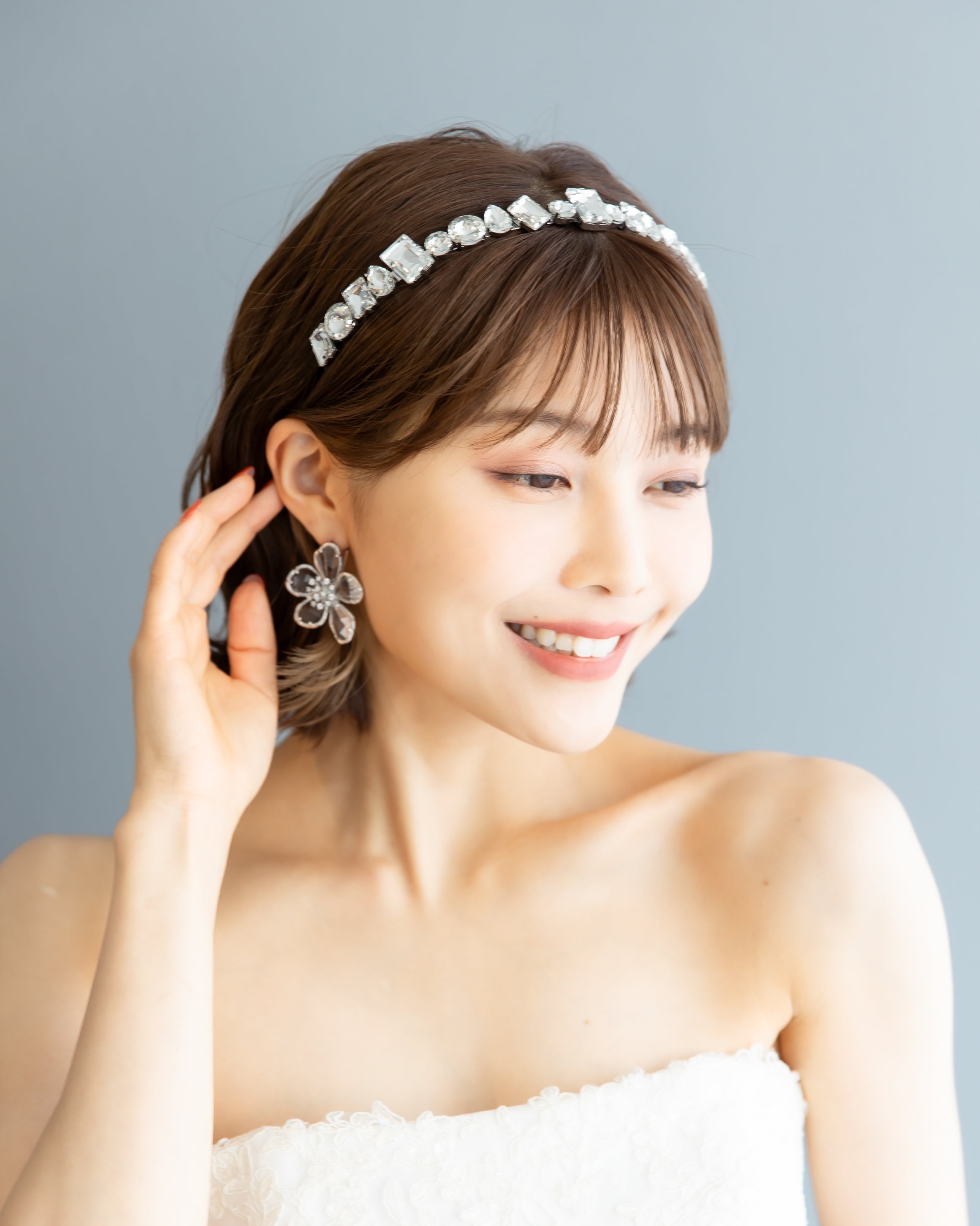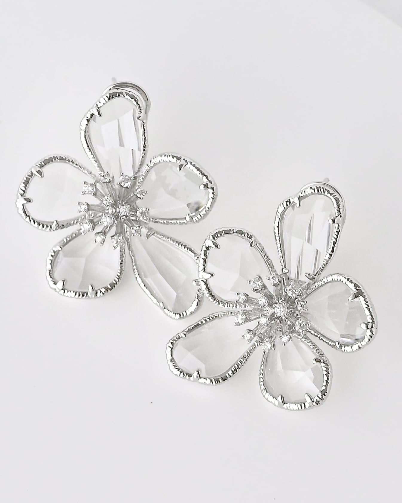 キラキラと輝く花芯に満開に咲いたクリスタルの花びらが華やかながらも抜け感ある愛らしいブライダルピアス。