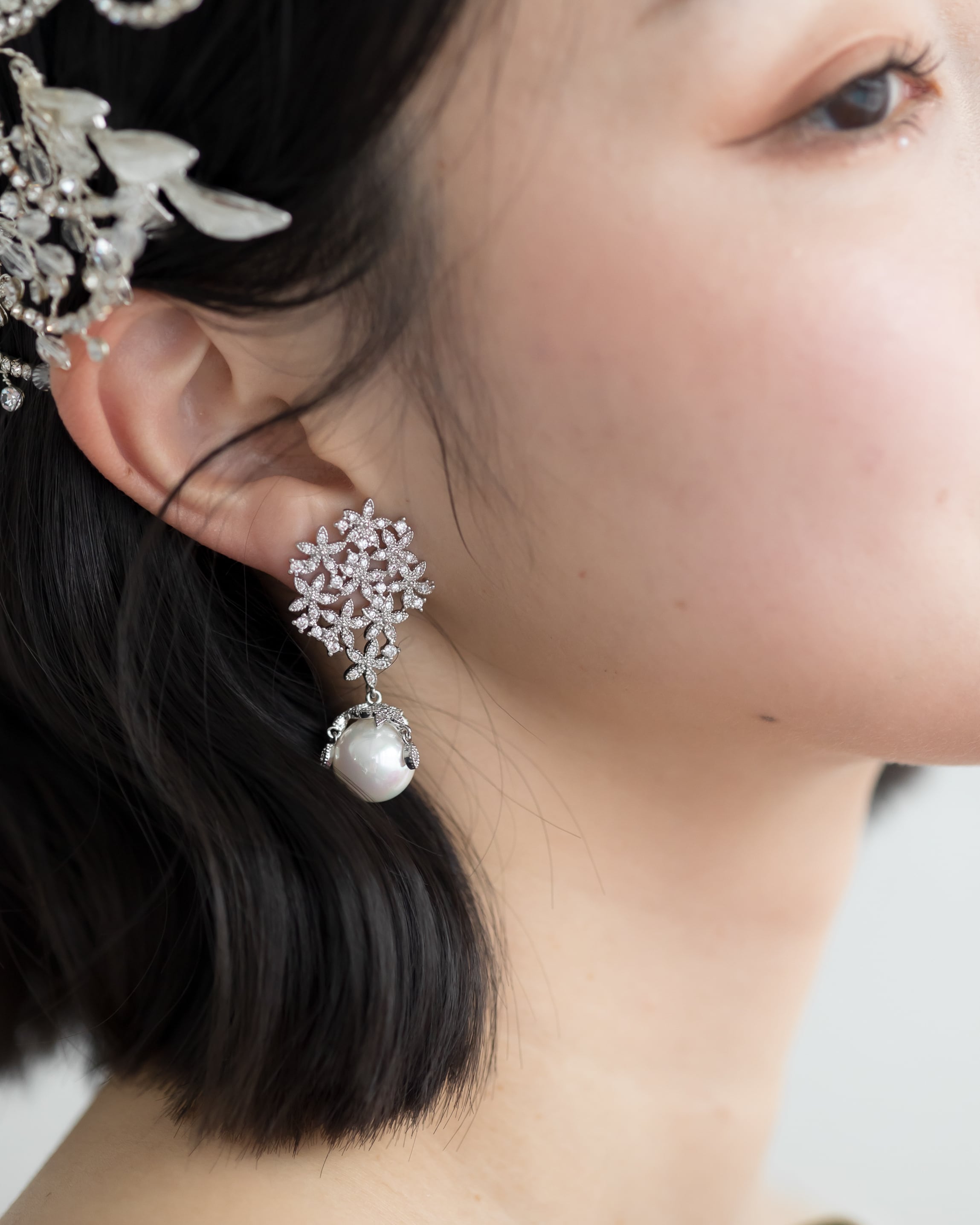 ジルコニアストーンを敷き詰めた繊細なお花を組み合わせたブーケのようなデザインが愛らしくも上品なブライダルピアス/イヤリング。