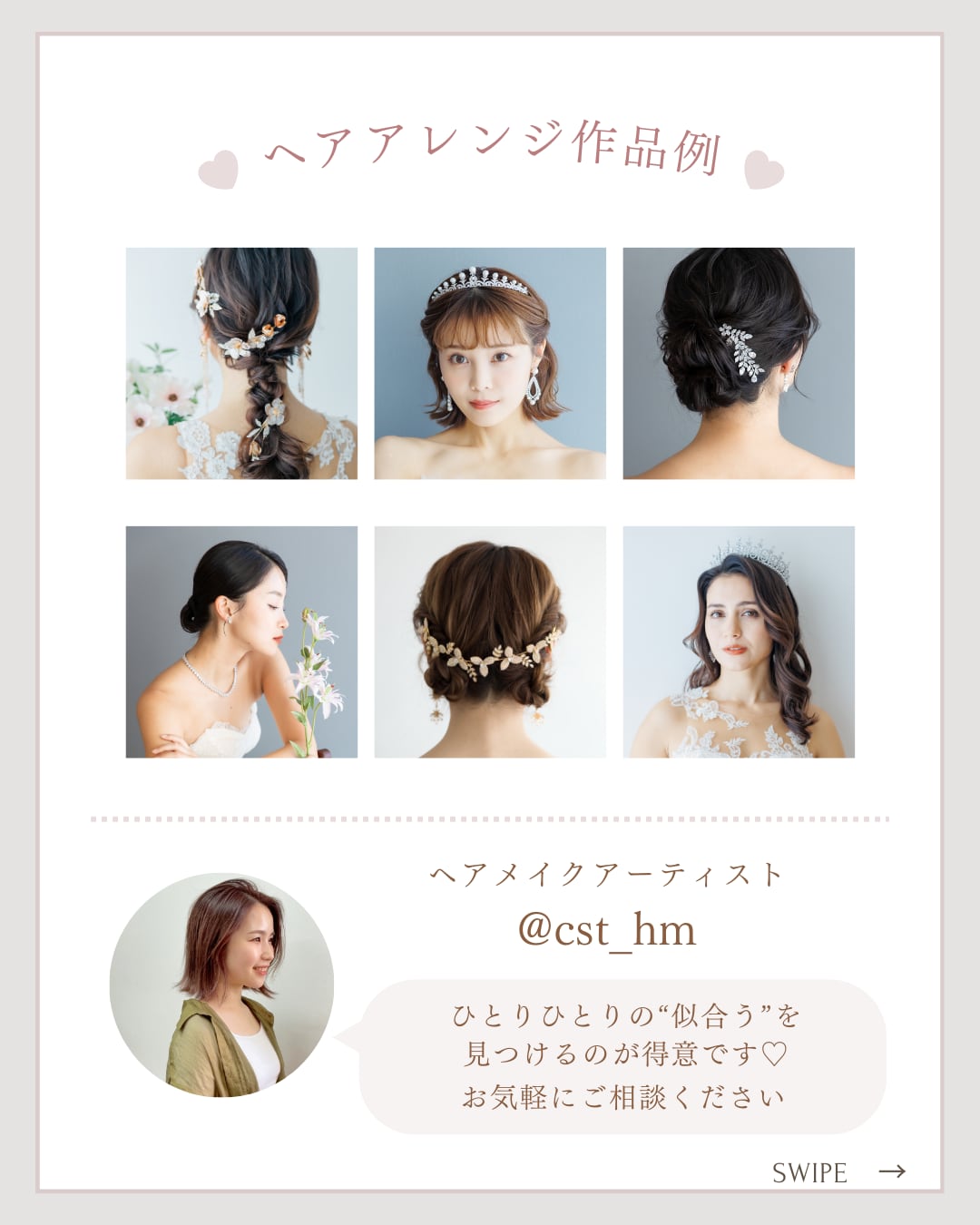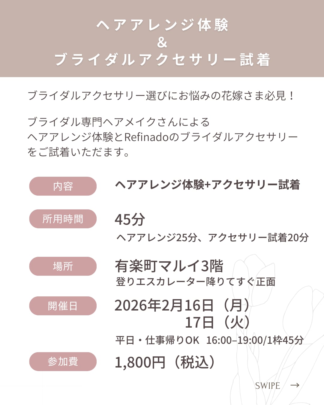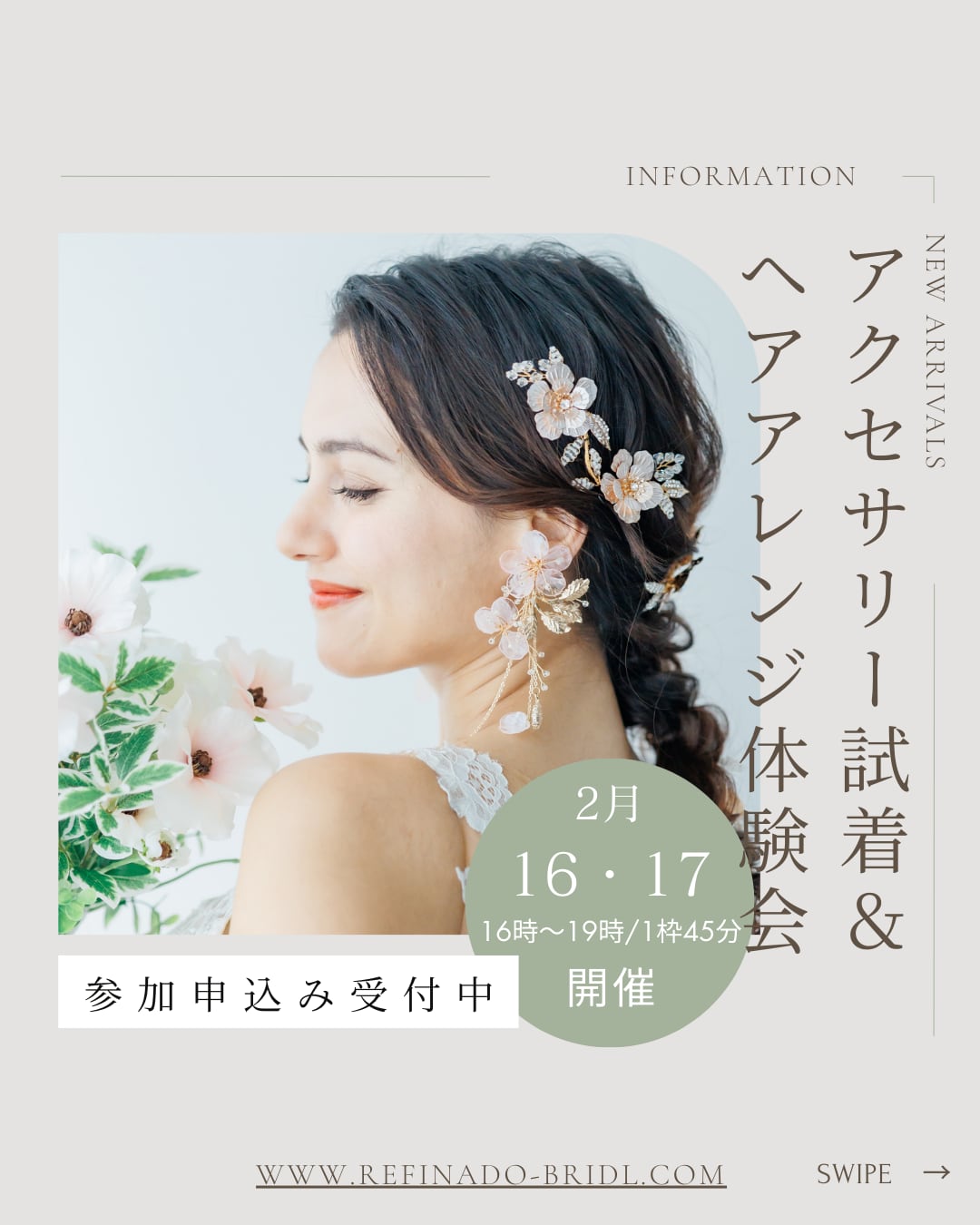 モデル写真撮影のヘアメイクを担当していただいている@cst_hmさんによるヘアアレンジ体験+Refinadoのブライダルアクセサリーをご試着いただける魅力あふれるイベントを開催いたしますのでぜひご参加ください!