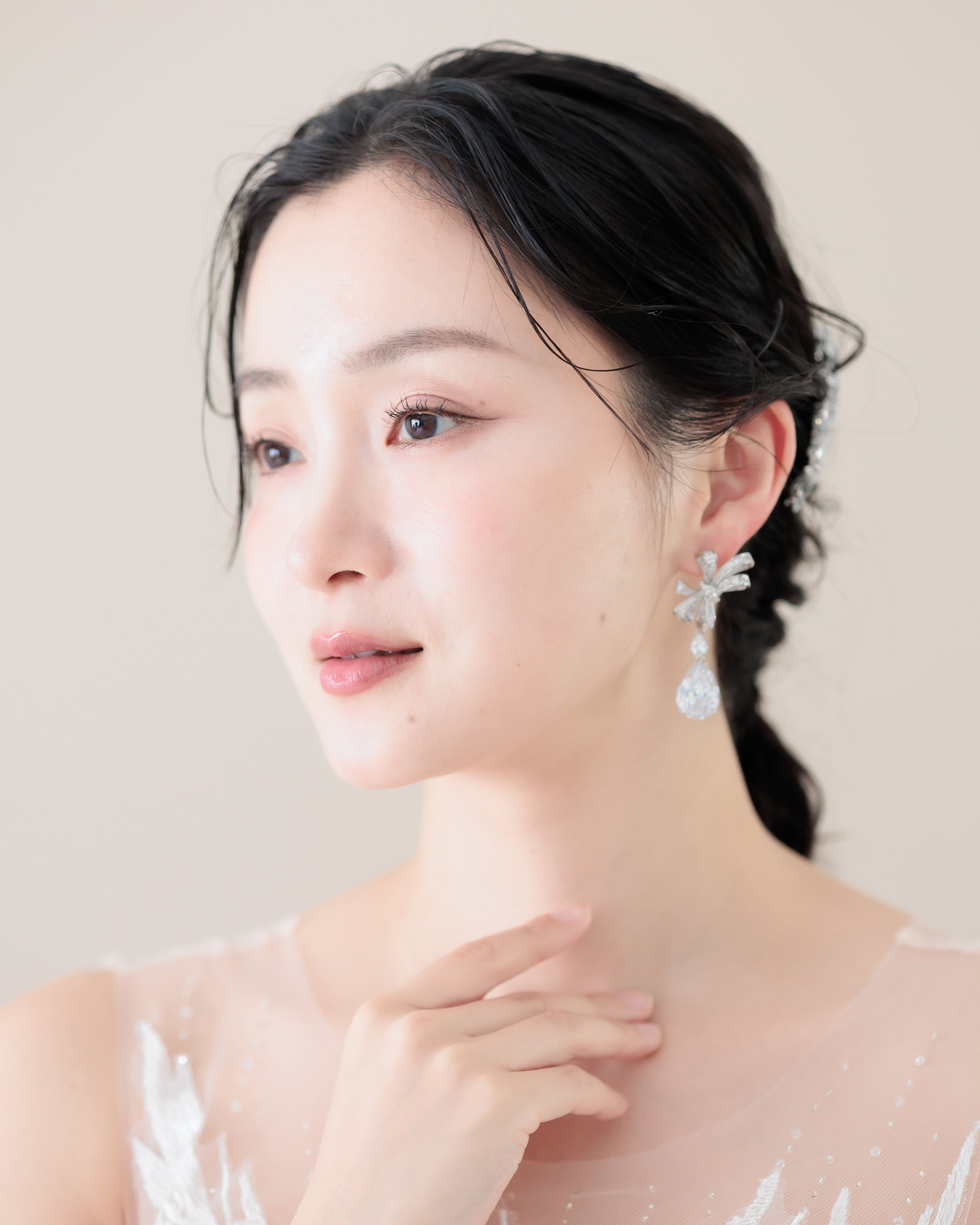 リボンモチーフのチャームにペアシェイプカットのジルコニアストーンがダイヤモンドのようにキラキラと揺れ輝く華麗なブライダルピアス。