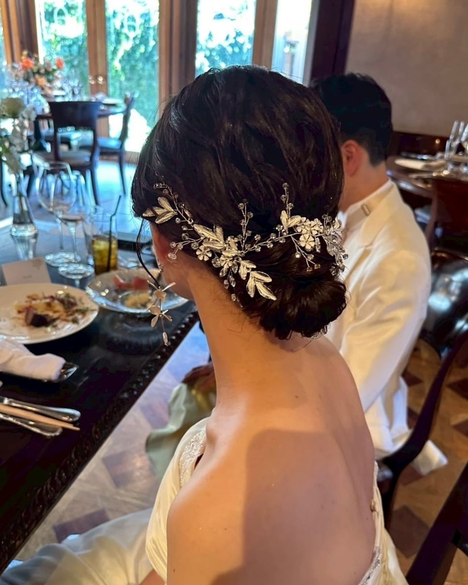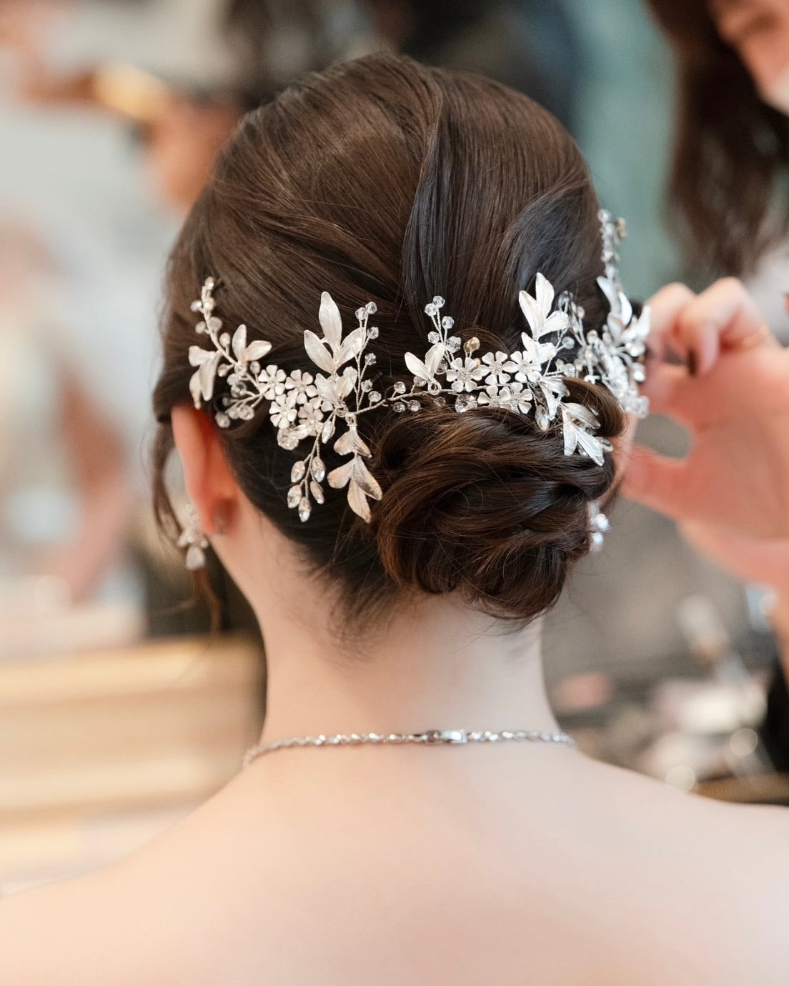 お花やリーフのチャームとキラキラと光り輝くラインストーンを一緒にワイヤーで丁寧に紡いだ小枝ヘアアクセサリー。