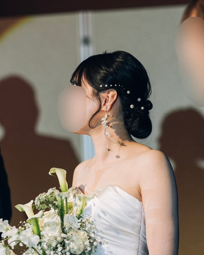 白いお花をゴールドのチェーンで繋げた可憐でトレンド感あふれるブライダルピアス。